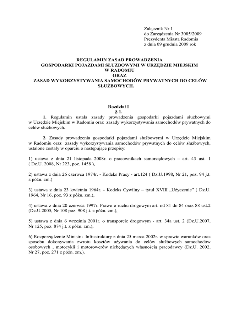 Załącznik Nr 1 do Zarządzenia Nr 3085/2009 Prezydenta Miasta Radomia z dnia 09 grudnia 2009 rok REGULAMIN ZASAD PROWADZENIA GOSPODARKI POJAZDAMI SŁUśBOWYMI W URZĘDZIE MIEJSKIM W RADOMIU ORAZ ZASAD WYKORZYSTYWANIA SAMOCHODÓW PRYWATNYCH DO CELÓW SŁUśBOWYCH. Rozdział I § 1. 1. Regulamin ustala zasady prowadzenia gospodarki pojazdami słuŜbowymi w Urzędzie Miejskim w Radomiu oraz zasady wykorzystywania samochodów prywatnych do celów słuŜbowych. 2. Zasady prowadzenia gospodarki pojazdami słuŜbowymi w Urzędzie Miejskim w Radomiu oraz zasady wykorzystywania samochodów prywatnych do celów słuŜbowych, ustalone zostały w oparciu o następujące przepisy: 1) ustawa z dnia 21 listopada 2008r. o pracownikach samorządowych – art. 43 ust. 1 ( Dz.U. 2008, Nr 223, poz. 1458 ), 2) ustawa z dnia 26 czerwca 1974r. - Kodeks Pracy - art.124 ( Dz.U.1998, Nr 21, poz. 94 j.t. z późn. zm.) 3) ustawa z dnia 23 kwietnia 1964r. - Kodeks Cywilny – tytuł XVIII „UŜyczenie” ( Dz.U. 1964, Nr 16, poz. 93 z późn. zm.), 4) ustawa z dnia 20 czerwca 1997r. Prawo o ruchu drogowym art. od 81 do 84 oraz 88 ust.2 (Dz.U.2005, Nr 108 poz. 908 j.t. z późn. zm.), 5) ustawa z dnia 6 września 2001r. o transporcie drogowym - art. 34a ust. 2 (Dz.U.2007, Nr 125, poz. 874 j.t. z późn. zm.), 6) Rozporządzenie Ministra Infrastruktury z dnia 25 marca 2002r. w sprawie warunków oraz sposobu dokonywania zwrotu kosztów uŜywania do celów słuŜbowych samochodów osobowych , motocykli i motorowerów niebędących własnością pracodawcy (Dz.U. 2002, Nr 27, poz. 271 z późn. zm.). § 2. Przez określenia: - gospodarka samochodowa - naleŜy rozumieć uŜywanie, eksploatowanie, obsługę techniczną, naprawy oraz prowadzenie dokumentacji techniczno - eksploatacyjnej samochodów, - pojazdy samochodowe - naleŜy rozumieć wszystkie rodzaje samochodów słuŜbowych tj. osobowe, cięŜarowe, autobusy, dyspozycyjne, - samochody dyspozycyjne - naleŜy rozumieć samochody osobowe będące własnością Gminy Miasta Radomia, a przydzielone pracownikom Urzędu do eksploatacji w drodze decyzji Prezydenta Miasta Radomia na podstawie umowy uŜyczenia samochodu słuŜbowego, która to umowa szczegółowo reguluje zasady eksploatowania uŜyczonego pojazdu (załącznik nr 1 do Regulaminu), - komórka koordynująca – Biuro Administracyjno – Gospodarcze. § 3. 1. Koordynacja działań w zakresie gospodarowania pojazdami słuŜbowymi naleŜy do Kierownika Biura Administracyjno - Gospodarczego. 2. Nadzór nad gospodarką samochodową w komórkach organizacyjnych Urzędu, w których są uŜytkowane samochody słuŜbowe, sprawują Dyrektorzy/Kierownicy tych komórek. ROZDZIAŁ II UŜytkowanie i eksploatacja słuŜbowych pojazdów samochodowych. § 4. Do eksploatacji mogą być dopuszczone pojazdy samochodowe sprawne technicznie posiadające: - waŜny dowód rejestracyjny (z aktualnymi badaniami technicznymi), - dokument potwierdzający zawarcie obowiązkowego ubezpieczenia od odpowiedzialności cywilnej (waŜną polisę O.C.), - wyposaŜenie dodatkowe, zgodne z wymogami kodeksu drogowego. § 5. Dyrektorzy/Kierownicy komórek organizacyjnych Urzędu, w których są eksploatowane pojazdy samochodowe obowiązani są: - kierować pojazdy na wymagane badania techniczne, - dbać o aktualizację dowodów rejestracyjnych, - zawiadamiać właściwą instytucję ubezpieczeniową o wypadku drogowym, w którym uczestniczył samochód słuŜbowy Urzędu i załatwiać wynikające z tego formalności. § 6. Kierować pojazdami słuŜbowymi mogą: - pracownicy zatrudnieni na stanowiskach kierowców posiadający odpowiednie, waŜne prawo jazdy tj. zgodne z rodzajem obsługiwanego pojazdu oraz odpowiednie kwalifikacje do wykonywania zawodu kierowcy ( zgodnie z ustawą z dnia 20 czerwca 1997r. „Prawo o ruchu drogowym” Dział IV art. 88 ust. 2 (Dz.U. 2005, Nr 108, poz. 908 j.t. z późn. zm.), - pracownicy Urzędu posiadający odpowiednie waŜne prawo jazdy, - pracownicy Urzędu, posiadający odpowiednie waŜne prawo jazdy, którym przydzielone zostały samochody dyspozycyjne w drodze pisemnego upowaŜnienia udzielonego przez Prezydenta Miasta lub osobę przez niego upowaŜnioną w formie umowy uŜyczenia (załącznik nr 1 do Regulaminu). § 7. 1. Pojazdy samochodowe będące własnością Gminy Miasta Radomia, mogą być wykorzystywane wyłącznie w celach słuŜbowych dla zabezpieczenia prawidłowego funkcjonowania Urzędu. 2. Gospodarkę samochodową pojazdami uŜyczonymi innym jednostkom, prowadzą te jednostki. 3. W wyjątkowych sytuacjach pojazdy słuŜbowe mogą być wykorzystywane przez jednostki budŜetowe, organizacje społeczne oraz inne podmioty wyłącznie za zgodą Sekretarza Miasta. § 8. 1. KaŜdy wyjazd samochodu słuŜbowego (z wyjątkiem samochodów dyspozycyjnych) musi mieć potwierdzenie na karcie drogowej (Pu-SM-101 ) w formie podpisu zlecającego wyjazd. 2. Warunki uŜytkowania samochodów dyspozycyjnych ściśle określa umowa uŜyczenia samochodu ( załącznik nr 1 do Regulaminu ) zgodnie z art. 124 ustawy z dnia 26 czerwca 1974r. - Kodeks Pracy (Dz.U.1998, Nr 21, poz. 94 j.t. z późn. zm.) oraz z ustawą z dnia 23 kwietnia 1964r. - Kodeks Cywilny - tytuł XVIII „UŜyczenie” ( Dz.U. 1964, Nr 16, poz. 93 z późn. zm.). § 9. Dokumenty słuŜące do rozliczania słuŜbowych pojazdów samochodowych: 1. Podstawowym dokumentem potwierdzającym korzystanie z samochodu słuŜbowego jest karta drogowa (druk Pu-SM-101), która umowŜliwia rozliczenie przebiegu pojazdu, zuzycia paliwa, czasu pracy kierowców, 2. Polecenie wyjazdu słuŜbowego (druk Pu Os-232). 3. Miesięczne zestawienie eksploatacji pojazdu wykazujące ilość zuŜytego paliwa, oleju oraz przejechanych kilometrów sporządzone przez pracownika komórki koordynującej w oparciu o karty drogowe ( Pu-SM-101 ). 4. Pracownik Biura koordynującego, zgodnie z przyjętą normą zakładową rozlicza koszty eksploatacji danego pojazdu, § 10. 1. Norma za