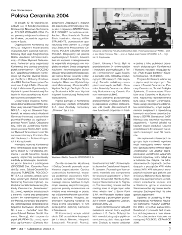 Ewa Stobierska W dniach 12–15 września br. odbyła się III Międzynarodowa Konferencja Naukowo-Techniczna pt. POLSKA CERAMIKA 2004. Po raz pierwszy miejscem konferencji był Kraków, poprzednie organizowano w Spale. Organizatorem Konferencji był Wydział Inżynierii Materiałowej i Ceramiki AGH; patronat nad konferencją objął Jego Magnificencja Rektor Akademii Górniczo-Hutniczej – Profesor Ryszard Tadeusiewicz. Partnerem przy organizacji Konferencji były zakłady produkcji płytek ceramicznych – OPOCZNO S.A. Współorganizatorami konferencji byli również: Wydział Geologii, Geofizyki i Ochrony Środowiska AGH, Polskie Towarzystwo Ceramiczne, Instytut Szkła i Ceramiki, Instytut Materiałów Ogniotrwałych, Wydział Inżynierii Materiałowej Politechniki Warszawskiej oraz Komitet Nauki o Materiałach PAN. Uroczystego otwarcia Konferencji dokonali Dziekan WIMiC profesor Jerzy Lis oraz Prezes OPOCZNO S.A. – mgr inż. Sławomir Frąckowiak. W imieniu władz Akademii Górniczo-Hutniczej uczestników przywitał Prorektor ds. ogólnych – profesor Antoni Tajduś. Odczytano listy, które do uczestników Konferencji skierował Rektor AGH, profesor Ryszard Tadeusiewicz oraz Wiceprzewodniczący Komitetu Badań Naukowych – Profesor Krzysztof J. Kurzydłowski. Nowością obecnej Konferencji była, towarzysząca jej po raz pierwszy w dniach 12 i 13 września, Wystawa i Giełda Ceramiki. Swoje wyroby najliczniej prezentowały zakłady produkujące ceramiczne płytki ścienne i podłogowe (OPOCZNO S.A., Ceramika Paradyż Sp. z o.o., Zakład Ceramiki Budowlanej TUBĄDZIN, POLCOLORIT S.A.) a ponadto zakłady wyrobów sanitarnych (Zakład Ceramiki Sanitarnej Stanisław Hybner), zakłady kamionki bolesławieckiej (Zakłady Ceramiczne „Bolesławiec” Sp. z o.o.), wyrobów artystycznych z ceramiki i szkła oraz producenci szkliw i fryt ceramicznych (Quimicer-Polska), surowców dla przemysłu ceramicznego (Strzeblowskie Kopalnie Surowców Mineralnych Sp. z o.o. – „Sobótka” oraz Stephan Schmidt Meisen GmbH, Kamenz, Niemcy), klei i zapraw do płytek (MUREXIN Sp. z o.o.), wyrobów ogniotrwałych (Zakłady Ma- gnezytowe „Ropczyce”), maszyn dla przemysłu ceramicznego z kraju jak i z zagranicy (SACMI Polska, M.E.SCHUPP Industrikeramik, Aachen, Maschinenfabrik Gustaw Eirich, Hardheim, Niemcy), A.P.INSTRUMENTS, przedstawiciel aparaturowej firmy Malvern I.L z Anglii oraz Zrzeszenie Producentów Cementu POLSKI CEMENT SACMI POLSKA. Dziękujemy raz jeszcze wystawiającym firmom, bowiem bez ich wsparcia i zaangażowania ta wspaniała ekspozycja nie mogłaby się odbyć. Swoje osiągnięcia naukowe i technologiczne przedstawiały także jednostki badawcze, jak Instytut Szkła i Ceramiki w Warszawie i Instytut Materiałów Ogniotrwałych z Gliwic oraz Wydział Inżynierii Materiałowej i Ceramiki AGH, Wydział Geologii, Geofizyki i Ochrony Środowiska AGH oraz Wydział Inżynierii Materiałowej Politechniki Warszawskiej. Piękne pamiątki z Konferencji przygotowały zakłady OPOCZNO S .A . oraz Zakłady Porcelany „Ćmielów” Sp. z o.o. fot. Z. Sulima Polska Ceramika 2004 Otwarcie konferencji POLSKA CERAMIKA 2004. Przemawia Dziekan WIMiC – prof. J. Lis. Obok Prorektor AGH – prof. A. Tajduś oraz Prezes OPOCZNO S.A. – mgr inż. S. Frąckowiak Czech, Ukrainy i Turcji. Byli to przedstawiciele 24 uniwersytetów i instytutów przemysłowych z Polski i wymienionych wyżej krajów, a ponadto wielu zakładów produkcyjnych (39 krajowych i 16 z zagranicy). Ponadto redaktorzy czasopism branżowych, jak Szkło i Ceramika, Materiały Ceramiczne, Materiały Budowlane czy Ceramic Forum International /BKG. Sesji plenarnej przewodniczył profesor Roman Pampuch. Referaty zaproszone wygłosili profesorowie: J.B. Carda „Development of new functional properties in tradi- Wystawa i Giełda Ceramiki. OPOCZNO S. A. Zainteresowanie W ystawą i Giełdą Ceramiki przerosło oczekiwania organizatorów. Oprócz uczestników konferencji, wystawę podziwiali pracownicy AGH, a przede wszystkim mieszkańcy naszego miasta. Możliwe to było dzięki szerokiej akcji informacyjnej, poprzez plakaty rozwieszone na mieście oraz informacje w prasie, np. w Dzienniku Polskim czy w Miesiącu w Krakowie. Wszyscy, zachwyceni Wystawą narzekali na małą ofertę sprzedaży, w tym szczególnie piękniej kamionki z Bolesławca. W Konferencji wzięło udział około 230 uczestników krajowych jak i z Włoch, Niemiec, Hiszpanii, Szwajcarii, Finlandii, Francji, BIP 134 – październik 2004 r. tional ceramics filds” z Uniwersytetu Jaume I w Castellon w Hiszpanii, R. Janssen „Processing of low ceramic materials and components for structural applications” z Technische Universitat Hamburg-Harburg w Niemczech oraz G. Frigniani „The tile cooling process and the cooling zone of single layer roller kilns: what’s new” z Sacmi Forni S.P.A. we Włoszech. Wydział i jego współpracę z przemysłem przybliżył w swoim wystąpieniu Dziekan, profesor Jerzy Lis. Duże zainteresowanie wzbudził zwłaszcza referat, który wygłosił profesor J. B. Carda. Dotyczył takich nowości jak grzejne płytki ceramiczne czy płytki niszczące bakterie. Znalazło to nawet oddźwięk w jednej z kilku publikacji prasowych dotyczących Konferencji i Wystawy, noszącej intrygujący tytuł: „Płytki trujące bakterie” (Gazeta Krakowska, 14.09.2004). Program Konferencji składał się z pięciu sesji tematycznych: Surowce i Proszki Ceramiczne, Procesy Ceramiczne, Teoria i Praktyka Spiekania, Charakterystyka Wyrobów oraz Ceramika w Budownictwie. Najliczniej reprezentowana była sesja Procesy Ceramiczne. Wiele uwagi poświęcono zdobnictwu ceramicznemu, w tym zagadnieniom związanym z reprodukcją barwnych wzorów na ceramice (referaty z SEFAR, Szwajcaria i BASF Niemcy) oraz niezwykle ważnemu zagadnieniu – kontroli jakości na każdym etapie produkcji. Łącznie przedstawiono 61 referatów na sesjach naukowych oraz 38 posterów. Jak zwykle n