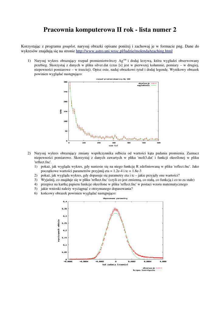Pracownia komputerowa II rok lista numer 2 Korzystając z programu gnuplot, narysuj obrazki opisane poniżej i zachowaj je w formacie png. Dane do wykresów znajdują się na stronie http://www.astro.uni.wroc.pl/ludzie/molenda/teaching.html 1) Narysuj wykres obrazujący rozpad promieniotwórczy Ag108 i dodaj krzywą, która wygładzi obserwowany przebieg. Skorzystaj z danych w pliku silver.dat (czas [s] jest w pierwszej kolumnie, pomiary – w drugiej, niepewności pomiarowe – w trzeciej). Opisz osie, nadaj obrazkowi tytuł i dodaj legendę. Wynikowy obrazek powinien wyglądać następująco: 2) Narysuj wykres obrazujący zmiany współczynnika odbicia od wartości kąta padania promienia. Zaznacz niepewności pomiarowe. Skorzystaj z danych zawartych w pliku 'moli3.dat' i funkcji określonej w pliku 'reflect.fnc'. 1) pokaż, jak wygląda wykres, gdy naniesie się na niego funkcję R zdefiniowaną w pliku 'reflect.fnc'. Jako początkowe wartości parametrów przyjmij eta = 1.2e4 i tc = 1.8e3 2) pokaż, jak wygląda wykres, gdy dopasuje się parametry eta i tc – jakie przyjęły one wartości? 3) Wyjaśnij, co znajduje się w pliku 'reflect.fnc' (czyli co jest zmienną, co stałą, co funkcją i co to za stałe) 4) przepisz na kartkę papieru funkcje określone w pliku 'reflect.fnc' w postaci wzoru matematycznego 5) jakie wnioski należy wyciągnąć z otrzymanego dopasowania? 6) końcowy obrazek powinien wyglądać następująco: