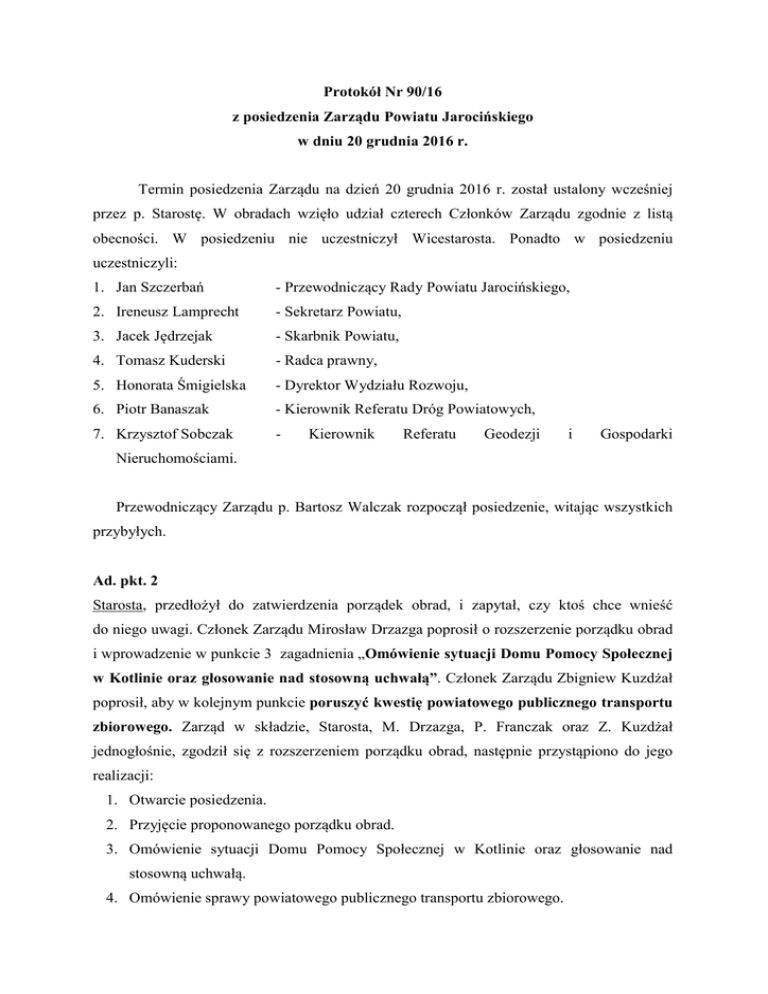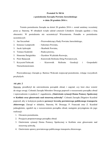 Protokół Nr 90/16 z posiedzenia Zarządu Powiatu Jarocińskiego w dniu 20 grudnia 2016 r. Termin posiedzenia Zarządu na dzień 20 grudnia 2016 r. został ustalony wcześniej przez p. Starostę. W obradach wzięło udział czterech Członków Zarządu zgodnie z listą obecności. W posiedzeniu nie uczestniczył Wicestarosta. Ponadto w posiedzeniu uczestniczyli: 1. Jan Szczerbań - Przewodniczący Rady Powiatu Jarocińskiego, 2. Ireneusz Lamprecht - Sekretarz Powiatu, 3. Jacek Jędrzejak - Skarbnik Powiatu, 4. Tomasz Kuderski - Radca prawny, 5. Honorata Śmigielska - Dyrektor Wydziału Rozwoju, 6. Piotr Banaszak - Kierownik Referatu Dróg Powiatowych, 7. Krzysztof Sobczak - Kierownik Referatu Geodezji i Gospodarki Nieruchomościami. Przewodniczący Zarządu p. Bartosz Walczak rozpoczął posiedzenie, witając wszystkich przybyłych. Ad. pkt. 2 Starosta, przedłożył do zatwierdzenia porządek obrad, i zapytał, czy ktoś chce wnieść do niego uwagi. Członek Zarządu Mirosław Drzazga poprosił o rozszerzenie porządku obrad i wprowadzenie w punkcie 3 zagadnienia „Omówienie sytuacji Domu Pomocy Społecznej w Kotlinie oraz głosowanie nad stosowną uchwałą”. Członek Zarządu Zbigniew Kuzdżał poprosił, aby w kolejnym punkcie poruszyć kwestię powiatowego publicznego transportu zbiorowego. Zarząd w składzie, Starosta, M. Drzazga, P. Franczak oraz Z. Kuzdżał jednogłośnie, zgodził się z rozszerzeniem porządku obrad, następnie przystąpiono do jego realizacji: 1. Otwarcie posiedzenia. 2. Przyjęcie proponowanego porządku obrad. 3. Omówienie sytuacji Domu Pomocy Społecznej w Kotlinie oraz głosowanie nad stosowną uchwałą. 4. Omówienie sprawy powiatowego publicznego transportu zbiorowego. 5. Rozpatrzenie pisma Referatu Dróg Powiatowych w Jarocinie nr R-DP.3026. 37.2016.KB w sprawie wyrażenia zgody na przedłużenie terminu umowy na wykonanie dodatkowych materiałów niezbędnych do uzyskania decyzji środowiskowej dla projektu drogi łączącej drogę krajową nr 11 z drogą nr 12- wariant II oraz o wyrażenie zgody na umieszczenie w wykazie wydatków "niewygasających" zadania pod nazwą "Budowa łącznika drogi krajowej nr 11 z drogą krajową nr 12- projekt". 6. Rozpatrzenie pisma Referatu Dróg Powiatowych w Jarocinie nr R-DP.3026.36. 2016.KBw sprawie zmian w planie finansowym na 2016 r. 7. Rozpatrzenie interpelacji Klubu radnych Porozumienie Obywatelskie w nr A-OB-BR. 0003.24.2016 w sprawie zadania pt. "Przebudowa ul. Podchorążych i Malinowskiego". 8. Rozpatrzenie pisma Referatu Geodezji i Gospodarki Nieruchomościami nr R-GNNG.3026. 17.2016.ZM w sprawie dokonania zmian w planie finansowym na 2016 r. 9. Rozpatrzenie pisma Referatu Geodezji i Gospodarki Nieruchomościami nr R-GNNG.3020. 1.2016.ZM w sprawie wprowadzenia zmian w budżecie jednostki na rok 2017 oraz w Wieloletniej Prognozie Finansowej na lata 2017- 2030. 10. Rozpatrzenie pisma Referatu Geodezji i Gospodarki Nieruchomościami nr R-GNNG.6845. 24.2016.ZM w sprawie wyrażenia zgody na przeprowadzenie postępowania o udzielenie zamówienia publicznego polegającego na wyłonieniu agencji ochrony obiektów w Zakrzew 52 na 2017 rok. 11. Rozpatrzenie pisma Referatu Geodezji i Gospodarki Nieruchomościami nr R-GNNG.3026. 15.2016.ZM w sprawie zmian w planie finansowym na 2016 r. 12. Rozpatrzenie pisma Referatu Budownictwa i Środowiska nr R-BS.3032.10.2016.FS w sprawie zmian w planie finansowym na 2016 r. 13. Rozpatrzenie wniosku Burmistrza Jarocina nr WR-ROI.6721.6.4.2016 w sprawie zaakceptowania projektu miejscowego planu zagospodarowania przestrzennego lądowiska w obrębie geodezyjnym Siedlemin. 14. Rozpatrzenie pisma Referatu Organizacyjnego i Bezpieczeństwa nr A-OB.3026. 23.2016 w sprawie zmian w planie finansowym na 2016 r. 15. Rozpatrzenie projektu uchwały Zarządu Powiatu Jarocińskiego w sprawie ustalenia wysokości dodatku motywacyjnego dla dyrektorów szkół i placówek prowadzonych przez Powiat Jarociński. 16. Rozpatrzenie projektu uchwały Zarządu Powiatu Jarocińskiego w sprawie ustalenia wysokości dodatku funkcyjnego dla dyrektorów szkół i placówek prowadzonych przez Powiat Jarociński. 17. Rozpatrzenie projektu uchwały Zarządu Powiatu Jarocińskiego w sprawie ustalenia wysokości dotacji dla Niepublicznego Młodzieżowego Domu Kultury Olimp, dla Międzyszkolnego Ośrodka Sportowego w Jarocinie i Niepublicznego Młodzieżowego Domu Kultury Akademia Kultury. 18. Rozpatrzenie projektu uchwały Zarządu Powiatu Jarocińskiego w sprawie ustalenia wysokości dotacji dla Społecznego Liceum Ogólnokształcącego w Jarocinie, Niepublicznego Liceum Ogólnokształcącego dla Dorosłych w Jarocinie, Szkoły Policealnej dla Dorosłych w Jarocinie. 19. Rozpatrzenie projektu uchwały Zarządu Powiatu Jarocińskiego w sprawie ustalenia wysokości dotacji dla Szkolnego Schroniska Młodzieżowego w Roszkowie, Całorocznego Szkolnego Schroniska Młodzieżowego „TĘCZA” im. Macieja Kostki w Radlinie, Szkolnego Sezonowego Schroniska Młodzieżowego „TĘCZA” im. Macieja Kostki w Radlinie Oddział w Cielczy, Szkolnego Schroniska Młodzieżowego w Wilkowyi, Niepublicznego Schroniska Młodzieżowego- Pałac Radolińskich. 20. Rozpatrzenie wniosku Stowarzyszenia Razem dla Żerkowa w sprawie zorganizowania zadania pod nazwą "Iluminacja świetlna z okazji 98. Rocznicy Powstania Wielkopolskiego w Żerkowie", z pominięciem otwartego konkursu ofert. 21. Rozpatrzenie projektu uchwały Zarządu Powiatu Jarocińskiego w sprawie ogłoszenia oferty Stowarzyszenia Razem dla Żerkowa na realizację zadania publicznego z pominięciem otwartego konkursu ofert. 22. Rozpatrzenie projektu uchwały Zarządu Powiatu Jarocińskiego w sprawie ogłoszenia otwartego konkursu ofert na realizację zadań powiatu jarocińskiego o charakterze pożytku publicznego w 2017 r. 23. Rozpatrzenie pisma Dyrektora Zespołu Szkół Specjalnych nr ZSS.3101.15.2016 w sprawie zmian w planie finansowym na 2016 r. 24. Rozpatrzeni