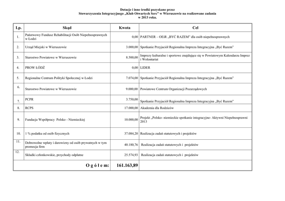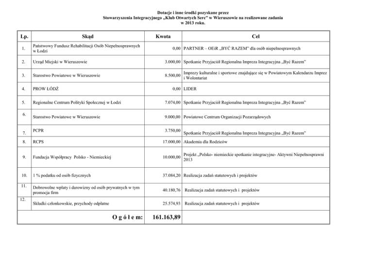 Dotacje i inne środki pozyskane przez Stowarzyszenia Integracyjnego „Klub Otwartych Serc” w Wieruszowie na realizowane zadania w 2013 roku. Skąd Lp. Kwota Cel 1. Państwowy Fundusz Rehabilitacji Osób Niepełnosprawnych w Łodzi 2. Urząd Miejski w Wieruszowie 3.000,00 Spotkanie Przyjaciół Regionalna Impreza Integracyjna „Być Razem” 3. Starostwo Powiatowe w Wieruszowie 8.500,00 4. PROW ŁÓDŹ 5. Regionalne Centrum Polityki Społecznej w Łodzi 7.074,00 Spotkanie Przyjaciół Regionalna Impreza Integracyjna „Być Razem” Starostwo Powiatowe w Wieruszowie 9.000,00 Powiatowe Centrum Organizacji Pozarządowych PCPR 3.750,00 6. 7. 0,00 PARTNER – OEiR „BYĆ RAZEM” dla osób niepełnosprawnych Imprezy kulturalne i sportowe znajdujące się w Powiatowym Kalendarzu Imprez i Wolontariat 0,00 LIDER Spotkanie Przyjaciół Regionalna Impreza Integracyjna „Być Razem” 8. RCPS 17.000,00 Akademia dla Rodziców 9. Fundacja Współpracy Polsko - Niemieckiej 10.000,00 10. 1 % podatku od osób fizycznych 37.084,20 Realizacja zadań statutowych i projektów 11. Dobrowolne wpłaty i darowizny od osób prywatnych w tym promocja firm 40.180,76 Realizacja zadań statutowych i projektów Składki członkowskie, przychody odpłatne 25.574,93 Realizacja zadań statutowych i projektów 12. O g ó ł e m: 161.163,89 Projekt „Polsko- niemieckie spotkanie integracyjne- Aktywni Niepełnosprawni 2013