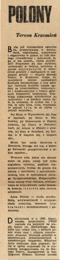 p NY Teresa Krzemień yła już wielokrotnie opisywana, przepytywana w wywiadach, nagradzana, podziwiana i obgadywna w plotce, co lubi każ dego rozwałkować i spłaszczyć, by 10. w ten sposób... chyba przybliżyć? Przyznano jej laur wybitnej osobowości w teatrze, zaliczono w poczet n a j l e p s z y c h w aktorstwie polskim i najlepszych w najlepszej grupie ~ zespole Starego Teatru w Krakowie. Grała we wszystkich niemal spektaklach Konrada Swinarskiego, a role jakie tam tworzyła krytyka uznała zgodnie za zwierciadlane, wieloznaczne i konkurencyjne z rolami głów nych bohaterów (mężczyzn). Telewizja · pokazywała wielokrotnie jeJ możliwości i za każdym razem było to olśnienie, że można tak i az tak. że taka inna, silna, wspaniała, że potrafi t y l e, że aż chyba potrafi wszystko... Jej Muza w Wyzwoleniu, jej Joas w Sędziach, jej Orcio w Nieboskiej, jej Dziewczyna w Zegnaj, Judaszu, jej Claire w Pokojówkach, jej Alisan w 1\filo.łct t gnte· w~. jej Ewa w Dziadach, jej DuJ. ska w Z biegiem lat, z biegiem dni..• Miała być także Gertruda w Hamlecie, którego nie ma, a którelO Swinarslti przygotoWywał z ta~im zapałem..• B Wreszcie role, które nie dawały 1zans na popis, miały być tyllro sygnałem, cytatem, znakiem rozpoznawczym, trudne do grania dla aktora z dorobkiem i samoświado mością. role w spektaklacb J:erze80 Grzegorzewskiego, Podponądko wana sennej Wi7.ji reżysera, ;reduko· wa.na do kilku kwestii, nadal ~ ła kreacje, i s t n i a ł a jako swoista odrębność. Anna Polony - muza, arcykobieta, arcywrażliwość i arcypr~e cheia sceniczna, fenomen t e atra l n o ś c i skondensowanej i łlb aolutnej. w r. 1960. Ahsolkrakowskiej PWST . znal~a się najpierw na scenie teatru im. Słowackiego. Spę dziła tatn cztery lata, o których powie wiele razy i różnym rozmówcom: stracone. Grywała subretki w D ebiutowała wentka nieciekawlich nieciekawych przedstawieniach reż11ser6w. u Właściwe życie sceniczne (ona popraw1: ży· cie w ogóle) rozpoczęło się w momencie zaangażowania się do St.arego Teatru. Zaangażował ją tam Zygmunt Hiibner. Grywać zaczęła role ciekawsze: u Bardiniego, Hubnera, Jarockiego, Maciejowskieg9. I te najważniejsze - u Swinarskiego, który ją odkrył, ukształtował, wytyczył drogę. Grała Katrio w Matce Courage, wymienionych już Orcia i Joasa, Młodą w Klątwie Wyspiańskiego, Claire · w Pokojiw1cach, Stellę w Fantazym... Wszystko przemiennie, równocześnie, na róznych rejestrach i w różnych barwach. Rosła z roku na rok by w Wyf:WOZeniu. "błysnąć" kreacją co :;iE: zowie syn~tyczną. Od tej syntezy w Muzie jest już aktorką, która wdarła się na Olimpy i Panteony polskie. Więlkość nie kwestionowana, zadziwia raz po raz nowymi odcieniami wizerunków U·· czuciowych jalęie stwarta. Została Dulską i była to Dulska nad I)ulskie, b~bska, zajadła, agresywna matka włlezyea plelunuJiłea gdzieś tam wspomndenia młodości i joej WZT\aW!ń. ~laka, babsko niespożyte i pasku· ~ •ale jakie cudownie witalne, jednak - j d WI!Paniale teleaceniczne, 'nieme', ~elowo teo.tralne telege· Zwierzyła się kiedyś: mój profesor ukoły teatralnej stwierdził od razu - warunki masz średnie, musisz duto pracować..• ~acowała i pracuje. Wykrepwał' st•ble. Sprosta dziś każdemu e11lploł, choć istotnie nie ma ani twarzy ani postawy heroin l amantek. napl,ala Bodajże Elżbieta kiedyś Morawtec o niej: .,aama tta: tura okrelliła kobłecol~ ;e; akto7.rtwa jako ekspre.r;t pavchikf, sukce.r - ~ko junkcJt pracv: bez tadMj taf"Jdv ulgowe; Polonv muriała się stworzvć. Wazvatko za wszvatko albo nłc - za nłc - taka bvła alternatywa qf111stvczne; drogt''. Pisze się o niej dzisia! z telllly: niebanalna uroda, nłepospottta kobiecość, 1łos tajemniczy ·i niepokojący. Dlaczego przypominam te - oczywistości? ju! .1e11t przyczyna główna, bo nie jedyna: nasz poczet aktorów (Idyby takt spor~dzono współcześnie) maleje z dnia na dzień. Pustoszy 10 śmier~ ale tiardziej - skostnienie w i e l k 1 e l!, petryfikacja ich sukcesów, które - tymczasem kruszejll z wolą nie pomnażając się o nowe••. Weryfikacja uznanycli wielkości w polskim aktorstwie przyniosłaby zapewne interesujące rezultaty..• Anna Polony jest wielkościĄ w ruchu, energią ktoetyczną w stałym rozwoju. Nadal Jest - jak w cza~ach, kiedy ją kanonizowano r.A świętą teatru btlrżą i żywiołem sceny. To warto p~iętać, wiedzieć, widzieć. Albo tylko ;przypominać sobie. Z pociech~, że bywa 1 tak, że nie zawsze. laur się ~ruszy i więdnie. Wreszcie: 'każda okazja do teco, żeby ucieszyć się szczerym talentem (ile ich mamy!) popartym p r a c ą (ile jej obserwujemy?) jest dobra. W powodzi obecnych słusz nych i gorzkich żalów - }.est to pozytyw, który po prostu wcią:.: JEST. B londynka, niewyS()ka, szczupła l drobna. Wydatne usta; c!emny, łamliwy glos. O sob:~ mó- wi: konfliktowa. jestem, 'zazdroszczę. Chcę. Wyraźnię: tego i te:;t>, lak . i tak. Ma kfn!likty - tak twierdzi - z każdym reżyserem ale tak muli 1>11ć. 'co jeszcze ·sit, o niej wie, z wywiadów na przykład? Ze teatr· to sztuka elity i bardzo dobrze, te ·filmu nie 1ub1 raczej albo jet z nim 'nie wychodzi, że uważa', iż kobieta w teatrz( aby się wybić mulli 'grać, grać, grat i 'grać ... Ze kluczem do ka;dej roll jel!t - dla niej - zrozurńienie in· tertcji postaci, że na scenie giną j~ własne kompleksy, te ~am . włe.śnle niczego nie musi się bać ani wstydzić'" Kiedy analizowano Wvzwoleniu, jej kreacjil świadómą?) rolę 'Muzy, w podkreślano często, że była (mimowiedną. Cl:Y pochwałą teatru ·j ako pola g i e r, p oz o r ó w, masek i tałSzu. Błyskotliwa i rozwibrowana Muza Anny Poion)' okazywala się być wierna jedynie żywiołowi gry, jedynie fenomenowi konwencji albo, wręcz - teatru. Małymi gestami rozbudowywala tam Polony wielość tych - pozornie psvchologicznych masek: kąpryśnica, kabotynka, ko