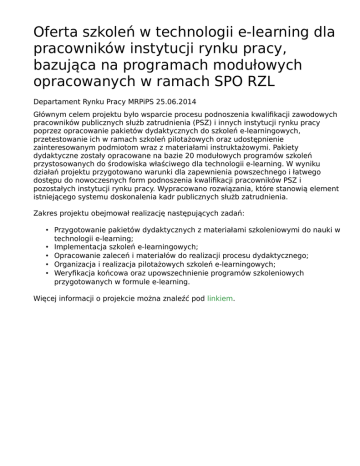 Oferta szkoleń w technologii e-learning dla pracowników instytucji rynku pracy, bazująca na programach modułowych opracowanych w ramach SPO RZL Departament Rynku Pracy MRPiPS 25.06.2014 Głównym celem projektu było wsparcie procesu podnoszenia kwalifikacji zawodowych pracowników publicznych służb zatrudnienia (PSZ) i innych instytucji rynku pracy poprzez opracowanie pakietów dydaktycznych do szkoleń e-learningowych, przetestowanie ich w ramach szkoleń pilotażowych oraz udostępnienie zainteresowanym podmiotom wraz z materiałami instruktażowymi. Pakiety dydaktyczne zostały opracowane na bazie 20 modułowych programów szkoleń przystosowanych do środowiska właściwego dla technologii e-learning. W wyniku działań projektu przygotowano warunki dla zapewnienia powszechnego i łatwego dostępu do nowoczesnych form podnoszenia kwalifikacji pracowników PSZ i pozostałych instytucji rynku pracy. Wypracowano rozwiązania, które stanowią element istniejącego systemu doskonalenia kadr publicznych służb zatrudnienia. Zakres projektu obejmował realizację następujących zadań: • Przygotowanie pakietów dydaktycznych z materiałami szkoleniowymi do nauki w technologii e-learning; • Implementacja szkoleń e-learningowych; • Opracowanie zaleceń i materiałów do realizacji procesu dydaktycznego; • Organizacja i realizacja pilotażowych szkoleń e-learningowych; • Weryfikacja końcowa oraz upowszechnienie programów szkoleniowych przygotowanych w formule e-learning. Więcej informacji o projekcie można znaleźć pod linkiem.