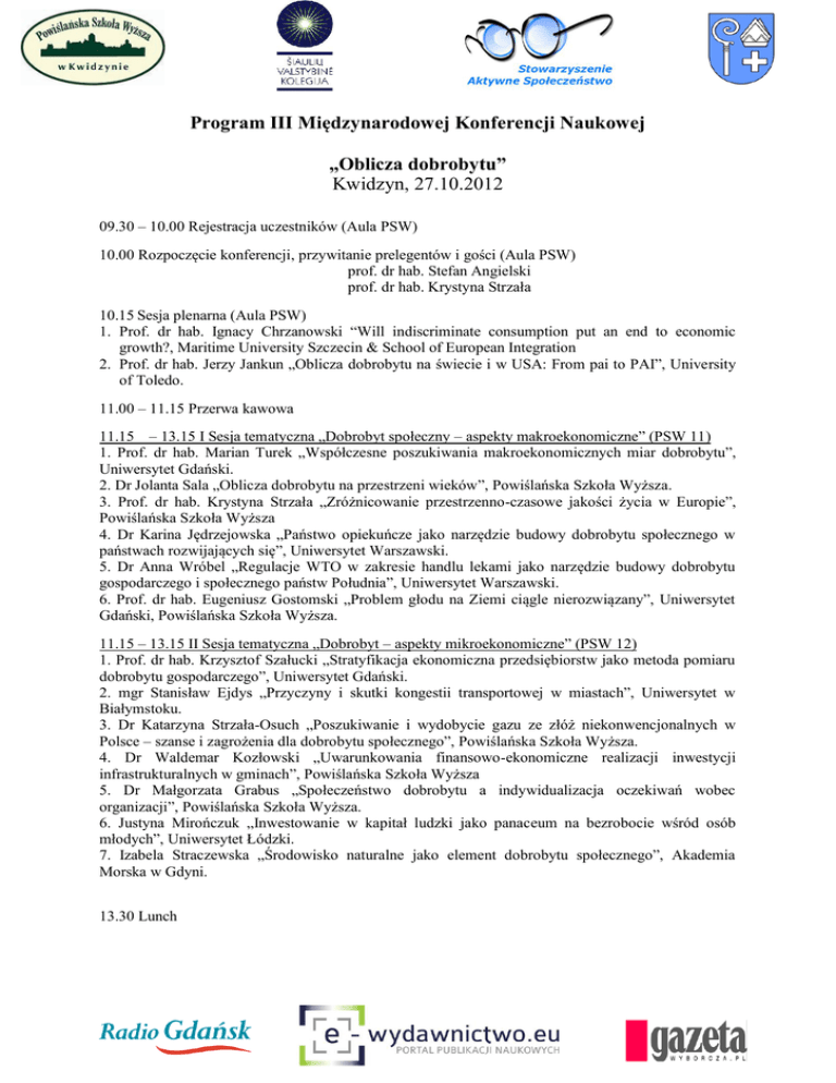 Program III Międzynarodowej Konferencji Naukowej „Oblicza dobrobytu” Kwidzyn, 27.10.2012 09.30 – 10.00 Rejestracja uczestników (Aula PSW) 10.00 Rozpoczęcie konferencji, przywitanie prelegentów i gości (Aula PSW) prof. dr hab. Stefan Angielski prof. dr hab. Krystyna Strzała 10.15 Sesja plenarna (Aula PSW) 1. Prof. dr hab. Ignacy Chrzanowski “Will indiscriminate consumption put an end to economic growth?, Maritime University Szczecin & School of European Integration 2. Prof. dr hab. Jerzy Jankun „Oblicza dobrobytu na świecie i w USA: From pai to PAI”, University of Toledo. 11.00 – 11.15 Przerwa kawowa 11.15 – 13.15 I Sesja tematyczna „Dobrobyt społeczny – aspekty makroekonomiczne” (PSW 11) 1. Prof. dr hab. Marian Turek „Współczesne poszukiwania makroekonomicznych miar dobrobytu”, Uniwersytet Gdański. 2. Dr Jolanta Sala „Oblicza dobrobytu na przestrzeni wieków”, Powiślańska Szkoła Wyższa. 3. Prof. dr hab. Krystyna Strzała „Zróżnicowanie przestrzenno-czasowe jakości życia w Europie”, Powiślańska Szkoła Wyższa 4. Dr Karina Jędrzejowska „Państwo opiekuńcze jako narzędzie budowy dobrobytu społecznego w państwach rozwijających się”, Uniwersytet Warszawski. 5. Dr Anna Wróbel „Regulacje WTO w zakresie handlu lekami jako narzędzie budowy dobrobytu gospodarczego i społecznego państw Południa”, Uniwersytet Warszawski. 6. Prof. dr hab. Eugeniusz Gostomski „Problem głodu na Ziemi ciągle nierozwiązany”, Uniwersytet Gdański, Powiślańska Szkoła Wyższa. 11.15 – 13.15 II Sesja tematyczna „Dobrobyt – aspekty mikroekonomiczne” (PSW 12) 1. Prof. dr hab. Krzysztof Szałucki „Stratyfikacja ekonomiczna przedsiębiorstw jako metoda pomiaru dobrobytu gospodarczego”, Uniwersytet Gdański. 2. mgr Stanisław Ejdys „Przyczyny i skutki kongestii transportowej w miastach”, Uniwersytet w Białymstoku. 3. Dr Katarzyna Strzała-Osuch „Poszukiwanie i wydobycie gazu ze złóż niekonwencjonalnych w Polsce – szanse i zagrożenia dla dobrobytu społecznego”, Powiślańska Szkoła Wyższa. 4. Dr Waldemar Kozłowski „Uwarunkowania finansowo-ekonomiczne realizacji inwestycji infrastrukturalnych w gminach”, Powiślańska Szkoła Wyższa 5. Dr Małgorzata Grabus „Społeczeństwo dobrobytu a indywidualizacja oczekiwań wobec organizacji”, Powiślańska Szkoła Wyższa. 6. Justyna Mirończuk „Inwestowanie w kapitał ludzki jako panaceum na bezrobocie wśród osób młodych”, Uniwersytet Łódzki. 7. Izabela Straczewska „Środowisko naturalne jako element dobrobytu społecznego”, Akademia Morska w Gdyni. 13.30 Lunch 14.15 – 16.00 I Sesja tematyczna „Bezpieczeństwo żywieniowe” (PSW 11) 1. Dr hab. Sylwia Małgorzewicz, D. Kaczerska, prof. dr hab. Wiesława Łysiak-Szydłowska „Bezpieczeństwo żywieniowe w populacji osób zdrowych w Polsce”, Gdański Uniwersytet Medyczny, Powiślańska Szkoła Wyższa. 2. Dr Magdalena Zarzycka “Cyanobacterias - superfood and medicine of the future world?”, Polskie Towarzystwo Nauk o Rozdzielaniu, Dom Pracy Twórczej "Reymontówka". 3. Dr hab. Paweł Zarzycki “Dealing with hormone disrupting phenomenon - challenging problem for the both poor and rich countries”, Politechnika Koszalińska. 4. Dr hab. Ewa Król „Nerki ofiarą dobrobytu”, Gdański Uniwersytet Medyczny. 5. mgr Agnieszka Kruk, mgr Aneta Muczyń, mgr Agnieszka Habel, dr n. med. Janina Książek, mgr Magdalena Leyk „Problem nikotynizmu wśród młodzieży szkolnej w kontekście wiary chrześcijańskiej”, Gdański Uniwersytet Medyczny. 6. Prof. dr hab. Wiesława Łysiak-Szydłowska "Ukryty głód – niedobory mikroskładników”, Powiślańska Szkoła Wyższa. 14.15 – 16.00 II Sesja tematyczna „Choroby cywilizacyjne” (PSW 12) 1. mgr Sylwia Terech, dr n.med. Janina Książek, Paulina Bałdowska, mgr Magdalena Leyk „Leczenie otyłości patologicznej a opieka pielęgniarska-studium przypadku”, Gdański Uniwersytet Medyczny. 2. Dr Irena Kin-Dittmann „Zróżnicowanie i zmienność umieralności mieszkańców Dolnego Śląska z powodu chorób układu krążenia”, Uniwersytet Wrocławski. 3. Mariola Ejdys, Beata Fischer, Anna Szypulska „Niwelowanie zaburzeń depresyjnych wśród pacjentów z reumatoidalnym zapaleniem stawów wyzwaniem dla ochrony zdrowia”, UWM w Olsztynie. 4. mgr Dariusz Łyżwiński, dr hab. Sylwia Małgorzewicz, mgr Alicja Łyżwińska „Rola witaminy D3 w wybranych chorobach cywilizacyjnych”, Powiślańska Szkoła Wyższa, Gdański Uniwersytet Medyczny. 5. Halyna Tkachenko, Katarzyna Zółcińska, prof. dr hab. Natalia Kurhaluk „Zależność między poziomem jodu w organizmie a stanem samopoczucia, aktywności i nastroju młodzieży z Pomorza Środkowego”, Akademia Pomorska w Słupsku. 6. Dr Marcin Kęsy „Poziom rzeczywistej wiedzy zawodowej oraz umiejętności interpersonalnych personelu medycznego”, Uniwersytet Jagielloński. 15.45 – 16.00 Przerwa kawowa 16.00 Dyskusja panelowa - „Oblicza dobrobytu w ujęciu poszczególnych dyscyplin naukowych” Stefan Angielski, Ignacy Chrzanowski, Jerzy Jankun, Wiesława Łysiak-Szydłowska, Marian Turek, Krystyna Strzała, 16.30 Zakończenie konferencji