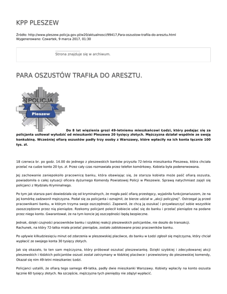 KPP PLESZEW Źródło: http://www.pleszew.policja.gov.pl/w20/aktualnosci/99417,Para-oszustow-trafila-do-aresztu.html Wygenerowano: Czwartek, 9 marca 2017, 01:30 Strona znajduje się w archiwum. PARA OSZUSTÓW TRAFIŁA DO ARESZTU. Do 8 lat więzienia grozi 49-letniemu mieszkańcowi Łodzi, który podając się za policjanta usiłował wyłudzić od mieszkanki Pleszewa 20 tysięcy złotych. Mężczyzna działał wspólnie ze swoją konkubiną. Wcześniej ofiarą oszustów padły trzy osoby z Warszawy, które wpłaciły na ich konta łącznie 100 tys. zł. 18 czerwca br. po godz. 14.00 do jednego z pleszewskich banków przyszła 72-letnia mieszkanka Pleszewa, która chciała przelać na cudze konto 20 tys. zł. Przez cały czas rozmawiała przez telefon komórkowy. Kobieta była podenerwowana. Jej zachowanie zaniepokoiło pracownicę banku, która obawiając się, że starsza kobieta może paść ofiarą oszusta, powiadomiła o całej sytuacji oficera dyżurnego Komendy Powiatowej Policji w Pleszewie. Sprawą natychmiast zajęli się policjanci z Wydziału Kryminalnego. Po tym jak starsza pani dowiedziała się od kryminalnych, że mogła paść ofiarą przestępcy, wyjaśniła funkcjonariuszom, że na jej komórkę zadzwonił mężczyzna. Podał się za policjanta i oznajmił, że bierze udział w „akcji policyjnej”. Ostrzegał ją przed pracownikami banku, w którym trzyma swoje oszczędności. Zapewnił, że chcą ją oszukać i przywłaszczyć sobie wszystkie zaoszczędzone przez nią pieniądze. Rzekomy policjant polecił kobiecie udać się do banku i przelać pieniądze na podane przez niego konto. Gwarantował, że na tym koncie jej oszczędności będą bezpieczne. Jednak, dzięki czujności pracowników banku i szybkiej reakcji pleszewskich policjantów, nie doszło do transakcji. Rachunek, na który 72-latka miała przelać pieniądze, zostało zablokowane przez pracowników banku. Po upływie kilkudziesięciu minut od zdarzenia w pleszewskiej placówce, do banku w Łodzi zgłosił się mężczyzna, który chciał wypłacić ze swojego konta 30 tysięcy złotych. Jak się okazało, to ten sam mężczyzna, który próbował oszukać pleszewiankę. Dzięki szybkiej i zdecydowanej akcji pleszewskich i łódzkich policjantów oszust został zatrzymany w łódzkiej placówce i przewieziony do pleszewskiej komendy, Okazał się nim 49-letni mieszkaniec Łodzi. Policjanci ustalili, że ofiarą tego samego 49-latka, padły dwie mieszkanki Warszawy. Kobiety wpłaciły na konto oszusta łącznie 60 tysięcy złotych. Na szczęście, mężczyzna tych pieniędzy nie zdążył wypłacić. Jak ustalili policjanci, 49-latek nie działał sam. Następnego dnia w Łodzi mundurowi zatrzymali 52-latkę. Na jej konto, w połowie czerwca mieszkanka Warszawy wpłaciła 41 tys. złotych. Do tej pory na Policję zgłosiły się cztery osoby. Nie wykluczone jednak, że pokrzywdzonych jest znacznie więcej. Para usłyszała zarzuty oszustwa. Przestępstwo to jest zagrożone karą do 8 lat więzienia. Sąd aresztował ich na 3 miesiące. Ocena: 0/5 (0) Tweetnij