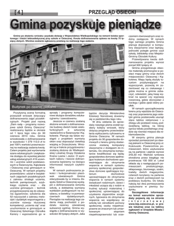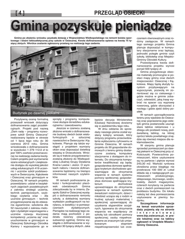 [4] PRZEGLĄD OSIECKI Gmina pozyskuje pieniądze Gmina po złożeniu wniosku uzyskała dotację z Województwa Wielkopolskiego na remont boiska sportowego i bieżni lekkoatletycznej przy szkole w Osiecznej. Kwota dofinansowania opiewa na kwotę 75 tysięcy złotych. Wkrótce zostanie ogłoszony przetarg na realizację tego zadania. Budynek po dawnej piekarni Pozytywną ocenę formalną przeszedł wniosek dotyczący dofinansowania zajęć pozalekcyjnych. Projekt pod nazwą „Dam radę – programy rozwojowe szkół Gminy Osieczna” realizowany będzie w okresie od 1 lipca tego roku do 30 czerwca 2013 roku. Gmina wnioskowała o dofinansowanie w wysokości 1 279 112,0 zł to jest 100% wartości przeznaczonej na realizację zadania kwoty. Celem projektu jest wyrównanie szans edukacyjnych i zwiększenie dostępu do wysokiej jakości usług edukacyjnych 419 uczennic i uczniów szkół podstawowych w Świerczynie, Kąkolewie i Osiecznej oraz gimnazjum w Osiecznej. W ramach projektu przewidziano: udział w bezpłatnych zajęciach pozalekcyjnych z zakresu strategii uczenia, technik pamięciowych, szybkiego czytania oraz – dla uczniów gimnazjum – technik przygotowywania się do zdawania egzaminów; szkolenia dla 52 nauczycieli z zakresu metodyki i dydaktyki wspomagania u uczniów rozwoju kluczowej kompetencji „uczenia się” oraz uruchomienie w gimnazjum w Osiecznej Szkolnego Ośrodka Kariery i wyposażenie go w sprzęty i programy komputerowe służące doradztwu edukacyjnemu i zawodowemu. Jeszcze w czerwcu zostaną złożone wnioski o dofinansowanie budowy dwóch boisk wielofunkcyjnych o sztucznej nawierzchni w Świerczynie i Kąkolewie. Planuje się także wystąpić z projektem wymiany okien oraz doposażyć świetlicę wiejską w Drzeczkowie. Wnioski są w trakcie przygotowania i zostaną złożone do Wielkopolskiej Lokalnej Grupy Działania Kraina Lasów i Jezior. O wynikach naboru i kwocie dofinansowania będziemy na bieżąco informować naszych czytelników. W ramach podnoszenia jakości i funkcjonalności placówek oświatowych Gmina zdecydowała by w imieniu Zespołu Szkół w Osiecznej wystąpić o dofinansowanie remontu szkoły, a dokładniej wymiany wykładzin podłogowych na korytarzu, w świetlicy i w pomieszczeniach dydaktycznych. Pieniądze na realizację tego zadania mają pochodzić z podziału rezerwy oświatowej subwencji ogólnej. Gmina wystąpiła o dofinansowanie w wysokości 30 tysięcy złotych. Jaka będzie decyzja Ministerstwa Edukacji Narodowej dowiemy się w październiku tego roku. W dniu oddania do sprzedaży naszego pisma został wysłany kolejny wniosek, który dotyczy programu przeciwdziałania wykluczeniu cyfrowemu w Gminie Osieczna. W ramach projektu do 30 gospodarstw domowych z terenu gminy dostarczone zostaną komputery stacjonarne z dostępem do internetu. Do otrzymania komputerów kwalifikować się będą: gospodarstwa domowe spełniające kryterium dochodowe upoważniające do otrzymania wsparcia w ramach systemu pomocy społecznej; gospodarstwa domowe spełniające kryterium dochodowe upoważniające do otrzymania wsparcia w ramach systemu świadczeń rodzinnych; dzieci i młodzież ucząca się z rodzin w trudnej sytuacji materialnej i społecznej uprawniającej do uzyskania stypendiów socjalnych, typowana do otrzymania wsparcia we współpracy ze szkołą lub ośrodkami pomocy społecznej; osoby niepełnosprawne ze znacznym lub umiarkowanym stopniem niepełnosprawności lub orze- czeniem równoważnym oraz rodziny zastępcze. W ramach tego samego projektu Gmina planuje doposażyć w komputery stacjonarne oraz laptopy, jednostki poległe gminie czyli szkoły, bibliotekę oraz MiejskoGminny Ośrodek Kultury. Przewidywana kwota dofinansowania projektu wynosi ponad 500 tysięcy zł. Gmina przygotowuje obecnie materiały promocyjne w postaci mapy gminy oraz dwóch miejscowości: Osiecznej i Kąkolewa. Mapy będą służyły turystom przybywającym na wypoczynek, pozwolą im zorientować się co ciekawego i gdzie można w gminie zobaczyć, odwiedzić, jaką trasę wybrać na spacer czy wyprawę rowerową, gdzie skorzystać z noclegu i gdzie zjeść dobry posiłek. W ramach uporządkowania terenu przy wjeździe do Osiecznej oraz poprawienia jego estetyki gmina postanowiła usunąć stare tablice reklamowe i u zbiegu ulic postawić nową, podświetlaną tablicę, na której oprócz tekstu powitalnego znajdzie się również miejsce dla reklamodawców. W sierpniu gmina planuje sprzedaż pomieszczeń po dawnej piekarni w Osiecznej przy ul. Kościuszki. Powierzchnia pomieszczeń, które usytuowane są na parterze i piętrze wynosi 243,30 m2. Wartość rynkowa określona przez biegłego nie przekracza 100 000 zł. Lokal składa się z następujących pomieszczeń: produkcyjnego, sklepowego, biurowego, szatni, toalety, dwóch magazynów, czterech korytarzy na parterze oraz z dwóch pomieszczeń na poddaszu budynku. Do lokalu należą też dwa pomieszczenia usytuowane w piwnicy budynku. Szczegółowe informacje na temat warunków sprzedaży pojawią się na stronie i n t e r n e t o w e j www.bip.osieczna.pl, w prasie lokalnej oraz na tablicy ogłoszeń w Urzędzie Miasta i Gminy Osieczna.