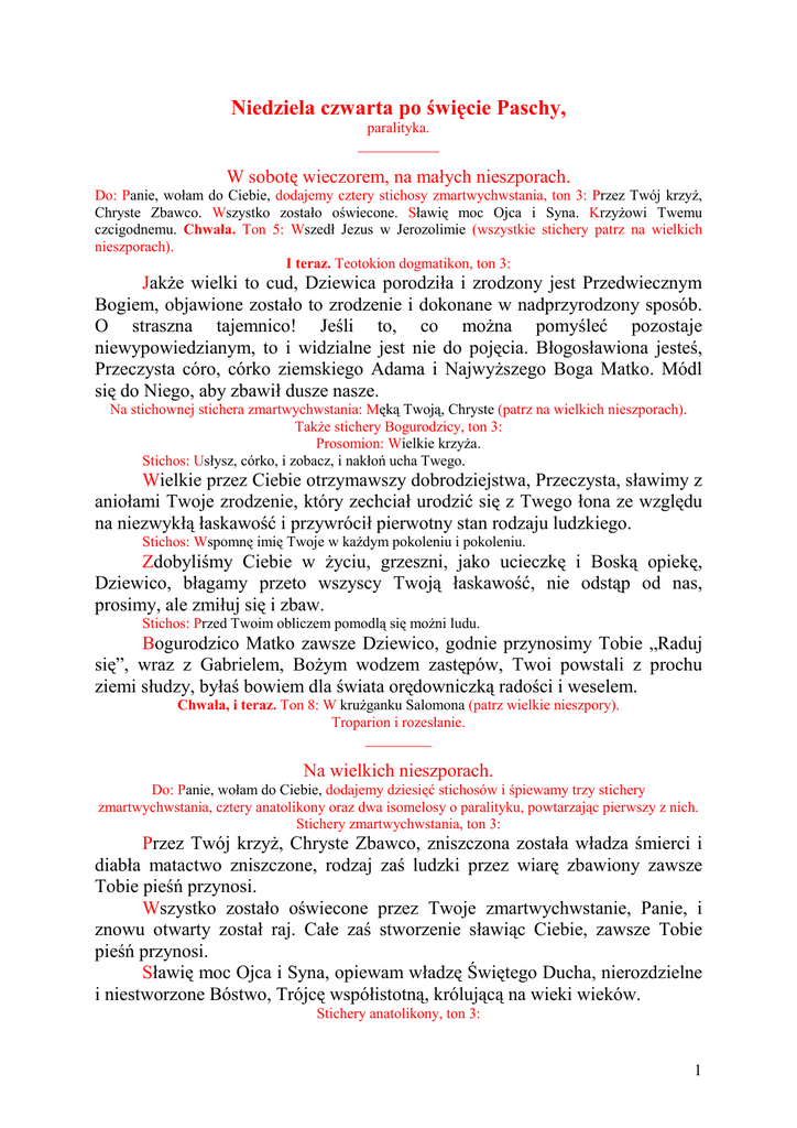 Niedziela czwarta po święcie Paschy, paralityka. ___________ W sobotę wieczorem, na małych nieszporach. Do: Panie, wołam do Ciebie, dodajemy cztery stichosy zmartwychwstania, ton 3: Przez Twój krzyŜ, Chryste Zbawco. Wszystko zostało oświecone. Sławię moc Ojca i Syna. KrzyŜowi Twemu czcigodnemu. Chwała. Ton 5: Wszedł Jezus w Jerozolimie (wszystkie stichery patrz na wielkich nieszporach). I teraz. Teotokion dogmatikon, ton 3: JakŜe wielki to cud, Dziewica porodziła i zrodzony jest Przedwiecznym Bogiem, objawione zostało to zrodzenie i dokonane w nadprzyrodzony sposób. O straszna tajemnico! Jeśli to, co moŜna pomyśleć pozostaje niewypowiedzianym, to i widzialne jest nie do pojęcia. Błogosławiona jesteś, Przeczysta córo, córko ziemskiego Adama i NajwyŜszego Boga Matko. Módl się do Niego, aby zbawił dusze nasze. Na stichownej stichera zmartwychwstania: Męką Twoją, Chryste (patrz na wielkich nieszporach). TakŜe stichery Bogurodzicy, ton 3: Prosomion: Wielkie krzyŜa. Stichos: Usłysz, córko, i zobacz, i nakłoń ucha Twego. Wielkie przez Ciebie otrzymawszy dobrodziejstwa, Przeczysta, sławimy z aniołami Twoje zrodzenie, który zechciał urodzić się z Twego łona ze względu na niezwykłą łaskawość i przywrócił pierwotny stan rodzaju ludzkiego. Stichos: Wspomnę imię Twoje w kaŜdym pokoleniu i pokoleniu. Zdobyliśmy Ciebie w Ŝyciu, grzeszni, jako ucieczkę i Boską opiekę, Dziewico, błagamy przeto wszyscy Twoją łaskawość, nie odstąp od nas, prosimy, ale zmiłuj się i zbaw. Stichos: Przed Twoim obliczem pomodlą się moŜni ludu. Bogurodzico Matko zawsze Dziewico, godnie przynosimy Tobie „Raduj się”, wraz z Gabrielem, BoŜym wodzem zastępów, Twoi powstali z prochu ziemi słudzy, byłaś bowiem dla świata orędowniczką radości i weselem. Chwała, i teraz. Ton 8: W kruŜganku Salomona (patrz wielkie nieszpory). Troparion i rozesłanie. _________ Na wielkich nieszporach. Do: Panie, wołam do Ciebie, dodajemy dziesięć stichosów i śpiewamy trzy stichery zmartwychwstania, cztery anatolikony oraz dwa isomelosy o paralityku, powtarzając pierwszy z nich. Stichery zmartwychwstania, ton 3: Przez Twój krzyŜ, Chryste Zbawco, zniszczona została władza śmierci i diabła matactwo zniszczone, rodzaj zaś ludzki przez wiarę zbawiony zawsze Tobie pieśń przynosi. Wszystko zostało oświecone przez Twoje zmartwychwstanie, Panie, i znowu otwarty został raj. Całe zaś stworzenie sławiąc Ciebie, zawsze Tobie pieśń przynosi. Sławię moc Ojca i Syna, opiewam władzę Świętego Ducha, nierozdzielne i niestworzone Bóstwo, Trójcę współistotną, królującą na wieki wieków. Stichery anatolikony, ton 3: 1 KrzyŜowi Twemu czcigodnemu kłaniamy się, Chryste, i zmartwychwstanie Twoje opiewamy i sławimy, bowiem Twoją raną wszyscy zostaliśmy uleczeni. Śpiewamy Zbawcy zrodzonemu z Dziewicy, bowiem dla nas został ukrzyŜowany i zmartwychwstał trzeciego dnia, dając nam wielkie miłosierdzie. Chrystus zstąpił do będących w otchłani głosząc i mówiąc: Bądźcie odwaŜni, teraz zwycięŜyłem, Ja jestem zmartwychwstanie, Ja was wyprowadzę zniszczywszy bramy śmierci. Stojąc, niegodni, w przeczystym domu Twoim, zanosimy wieczorną pieśń, z głębokości wołając, Chryste BoŜe: Oświeciwszy świat Twoim zmartwychwstaniem trzeciego dnia, wyrwij lud Twój z ręki wrogów Twoich, Przyjacielu człowieka. Inna stichera isomelos o paralityku, ton 1: Ty, który przeczystą dłonią stworzyłeś człowieka, przyszedłeś Łaskawco uleczyć chorych, Chryste, paralityka w owczej sadzawce słowem Twoim podniosłeś, uleczyłeś chorobę cierpiącej na krwotok, zmiłowałeś się nad cierpiącą córką Kananejki i nie pogardziłeś prośbą setnika, przeto wołamy: Wszechmocny Panie, chwała Tobie (dwa razy). Ten niepogrzebany martwy paralityk widząc Ciebie, zawołał: Zmiłuj się nade mną, Panie, albowiem moje łoŜe jest dla mnie grobem. Po cóŜ mi bogactwa w Ŝyciu? Nie potrzebuję owczej sadzawki, nie mam bowiem nikogo, kto by mnie do niej włoŜył, gdy porusza się woda, przeto przychodzę do Ciebie, Źródła uzdrowień, abym i ja z wszystkimi wołał: Wszechmocny Panie, chwała Tobie. Chwała. Ton 5: Wszedł Jezus w Jerozolimie do owczej sadzawki, zwanej po hebrajsku Betezda, mającej pięć kruŜganków, w których leŜało mnóstwo chorych, anioł bowiem Pański kaŜdego roku zstępował i poruszał wodę dając zdrowie przystępującym z wiarą. Pan ujrzał człowieka, który od wielu lat czekał i mówi do niego: „Czy chcesz być zdrowym?” Chory odpowiedział: „Panie, nie mam człowieka, który wrzuciłby mnie do sadzawki, gdy poruszy się woda. Na lekarzy wydałem cały swój majątek i nie otrzymałem miłosierdzia”, a Lekarz dusz i ciał mówi do niego: „Weź swoje łoŜe i idź, głosząc moją moc i wielkie miłosierdzie na krańcach ziemi”. I teraz. Teotokion, ton 3: JakŜe nie dziwić się Twemu BoŜemu zrodzeniu, Przeczysta? Nie przyjęłaś bowiem, Najczystsza, pokusy męŜczyzny, zrodziłaś bez ojca Boga w ciele, Przedwiecznie z Ojca zrodzonego bez matki, który nie doznał Ŝadnej zmiany, lub pomieszania, ale cechy obu natur zachował w całości. Przeto, Matko Dziewico, Władczyni, módl się do Niego, aby zbawił dusze prawowiernie Ciebie wyznających, Bogurodzico. Wejście. Pogodna Światłości. Prokimenon: Pan zakrólował, z jego stichosami. Na litii stichera świątyni. Chwała. Ton 5: Przy owczej sadzawce leŜał człowiek w niemocy i widząc Ciebie, Panie, zawołał: „Nie mam człowieka, który wrzuciłby mnie do sadzawki, gdy poruszy się woda. Gdy ja dochodzę, inny mnie wyprzedza i 2 przyjmuje uzdrowienie, a ja leŜę w niemocy”. Zbawiciel ulitowawszy się mówi do niego: „Ze względu na ciebie stałem się człowiekiem, ze względu na ciebie przyoblokłem się w ciało, a ty mówisz, Ŝe nie masz człowieka? Weź więc swoje łoŜe i idź”. Ty wszystko moŜesz, wszystko sł