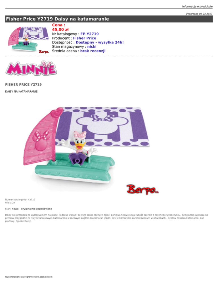 Informacje o produkcie Utworzono 09-03-2017 Fisher Price Y2719 Daisy na katamaranie Cena : 45,00 zł Nr katalogowy : FP.Y2719 Producent : Fisher Price Dostępność : Dostępny - wysyłka 24h! Stan magazynowy : niski Średnia ocena : brak recenzji FISHER PRICE Y2719 DAISY NA KATAMARANIE Numer katalogowy: Y2719 Wiek: 2+ Stan: nowe - oryginalnie zapakowane Daisy nie przepada za wylegiwaniem na plaży. Podczas wakacji zawsze szuka różnych zajęć, ponieważ największą radość czerpie z czynnego wypoczynku. Tym razem wyrusza na przeciw przygodzie na swym turkusowym katamaranie z różowym żaglem (katamaran jeździ, dzięki kółeczkom zamontowanym w pływakach). Zestaw zawiera katamaran, koc plażowy, figurke Daisy. Wygenerowano w programie www.oscGold.com Dostępność w salonach: Ilość sztuk: Sklep - Złotniki: 1 Sklep - zlikwidowany: 0 Sklep - Szczepankowo: 0 Dostępne opcje Fisher Price Y2719 Daisy na katamaranie » Wiek: 2 lata, 3 - 4 lat.