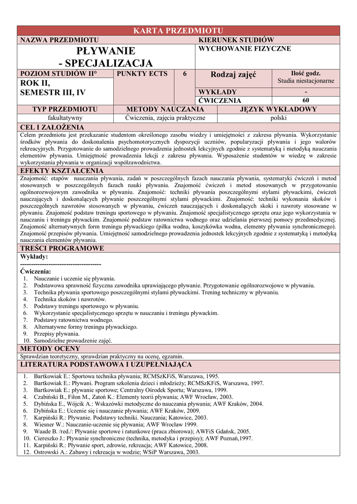 KARTA PRZEDMIOTU KIERUNEK STUDIÓW WYCHOWANIE FIZYCZNE NAZWA PRZEDMIOTU PŁYWANIE - SPECJALIZACJA POZIOM STUDIÓW II° ROK II, SEMESTR III, IV TYP PRZEDMIOTU fakultatywny PUNKTY ECTS 6 Rodzaj zajęć Ilość godz. Studia niestacjonarne WYKŁADY 60 ĆWICZENIA METODY NAUCZANIA JĘZYK WYKŁADOWY Ćwiczenia, zajęcia praktyczne polski CEL I ZAŁOŻENIA Celem przedmiotu jest przekazanie studentom określonego zasobu wiedzy i umiejętności z zakresu pływania. Wykorzystanie środków pływania do doskonalenia psychomotorycznych dyspozycji uczniów, popularyzacji pływania i jego walorów rekreacyjnych. Przygotowanie do samodzielnego prowadzenia jednostek lekcyjnych zgodnie z systematyką i metodyką nauczania elementów pływania. Umiejętność prowadzenia lekcji z zakresu pływania. Wyposażenie studentów w wiedzę w zakresie wykorzystania pływania w organizacji współzawodnictwa. EFEKTY KSZTAŁCENIA Znajomość: etapów nauczania pływania, zadań w poszczególnych fazach nauczania pływania, systematyki ćwiczeń i metod stosowanych w poszczególnych fazach nauki pływania. Znajomość ćwiczeń i metod stosowanych w przygotowaniu ogólnorozwojowym zawodnika w pływaniu. Znajomość: techniki pływania poszczególnymi stylami pływackimi, ćwiczeń nauczających i doskonalących pływanie poszczególnymi stylami pływackimi. Znajomość: techniki wykonania skoków i poszczególnych nawrotów stosowanych w pływaniu, ćwiczeń nauczających i doskonalących skoki i nawroty stosowane w pływaniu. Znajomość podstaw treningu sportowego w pływaniu. Znajomość specjalistycznego sprzętu oraz jego wykorzystania w nauczaniu i treningu pływackim. Znajomość podstaw ratownictwa wodnego oraz udzielania pierwszej pomocy przedmedycznej. Znajomość alternatywnych form treningu pływackiego (piłka wodna, koszykówka wodna, elementy pływania synchronicznego). Znajomość przepisów pływania. Umiejętność samodzielnego prowadzenia jednostek lekcyjnych zgodnie z systematyką i metodyką nauczania elementów pływania. TREŚCI PROGRAMOWE Wykłady: ------------------------------------Ćwiczenia: 1. 2. 3. 4. 5. 6. 7. 8. 9. 10. Nauczanie i uczenie się pływania. Podstawowa sprawność fizyczna zawodnika uprawiającego pływanie. Przygotowanie ogólnorozwojowe w pływaniu. Technika pływania sportowego poszczególnymi stylami pływackimi. Trening techniczny w pływaniu. Technika skoków i nawrotów. Podstawy treningu sportowego w pływaniu. Wykorzystanie specjalistycznego sprzętu w nauczaniu i treningu pływackim. Podstawy ratownictwa wodnego. Alternatywne formy treningu pływackiego. Przepisy pływania. Samodzielne prowadzenie zajęć. METODY OCENY Sprawdzian teoretyczny, sprawdzian praktyczny na ocenę, egzamin. LITERATURA PODSTAWOWA I UZUPEŁNIAJĄCA 1. 2. 3. 4. 5. 6. 7. 8. 9. 10. 11. 12. Bartkowiak E.: Sportowa technika pływania; RCMSzKFiS, Warszawa, 1995. Bartkowiak E.: Pływani. Program szkolenia dzieci i młodzieży; RCMSzKFiS, Warszawa, 1997. Bartkowiak E.: pływanie sportowe; Centralny Ośrodek Sportu; Warszawa, 1999. Czabiński B., Fiłon M., Zatoń K.: Elementy teorii pływania; AWF Wrocław, 2003. Dybińska E., Wójcik A.: Wskazówki metodyczne do nauczania pływania; AWF Kraków, 2004. Dybińska E.: Uczenie się i nauczanie pływania; AWF Kraków, 2009. Karpiński R.: Pływanie. Podstawy techniki. Nauczania; Katowice, 2003. Wiesner W.: Nauczanie-uczenie się pływania; AWF Wrocław 1999. Waade B. /red./: Pływanie sportowe i ratunkowe (praca zbiorowa); AWFiS Gdańsk, 2005. Ciereszko J.: Pływanie synchroniczne (technika, metodyka i przepisy); AWF Poznań,1997. Karpiński R.: Pływanie sport, zdrowie, rekreacja; AWF Katowice, 2008. Ostrowski A.: Zabawy i rekreacja w wodzie; WSiP Warszawa, 2003.