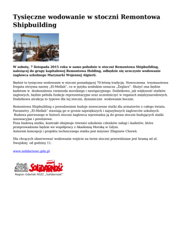 Tysięczne wodowanie w stoczni Remontowa Shipbuilding W sobotę, 7 listopada 2015 roku w samo południe w stoczni Remontowa Shipbuilding, należącej do grupy kapitałowej Remontowa Holding, odbędzie się uroczyste wodowanie żaglowca szkolnego Marynarki Wojennej Algierii. Będzie to tysięczne wodowanie w stoczni posiadającej 70-letnią tradycję. Nowoczesna trzymasztowa fregata otrzyma nazwę „El-Mellah”, co w języku arabskim oznacza „Żeglarz”. Służyć ona będzie kadetom w doskonaleniu rzemiosła morskiego i nawigacyjnego. Dodatkowo, jak większość statków żaglowych, będzie pełniła funkcje reprezentacyjne oraz uczestniczyć w regatach międzynarodowych. Dodatkowa atrakcja to typowe dla tej stoczni, dynamiczne wodowanie boczne. Remontowa Shipbuilding z powodzeniem buduje nowoczesne statki dla armatorów z całego świata. Parametry „El-Mellah” stawiają go w gronie największych i najszybszych żaglowców szkolnych. Budowa pierwszego w historii stoczni żaglowca wprowadza ją do grona stoczni budujących statki innowacyjne i prestiżowe. Poza budową statku, kontrakt obejmuje również szkolenie członków załogi i kadetów, które przeprowadzone będzie we współpracy z Akademią Morską w Gdyni. Autorem koncepcji i projektu technicznego statku jest inżynier Zbigniew Choreń. Dla chcących obserwować wodowanie wejście na teren stoczni przewidziane jest bramą od ul. Swojskiej od godziny 11. www.solidarnosc.gda.pl