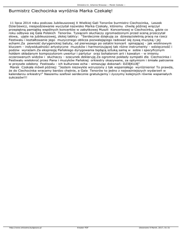 Orkiestra im. Johanna Straussa :: Marek Czekała :: Burmistrz Ciechocinka wyróżnia Marka Czekałę! 11 lipca 2014 roku podczas Jubileuszowej X Wielkiej Gali Tenorów burmistrz Ciechocinka, Leszek Dzierżewicz, niespodziewanie wyczytał nazwisko Marka Czekały, któremu chwilę później wręczył przepiękną pamiątkę wspólnych koncertów w zabytkowej Muszli Koncertowej w Ciechocinku, gdzie co roku odbywa się Gala Polskich Tenorów. Tysiącom słuchaczy zgromadzonym przed sceną przeczytał słowa, ujęte na jubileuszowej, złotej tablicy: "Serdecznie dziękuję za dziesięcioletnią pracę na rzecz Festiwalu i kształtowanie jego muzycznego oblicza pozwalającego radować się żywą muzyką i jej echami.Za pewność dyrygenckiej batuty, od pierwszego po ostatni koncert spinającej - jak wiolinowym kluczem - indywidualności artystyczne muzyków i harmonizującej tak różne instrumenty - wdzięczność i podziw wyrażam.Za ekspresję Pańskiego dyrygowania będącą sztuką samą w sobie i specyficznym hołdem składanym kompozytorom uwertur i partytur oraz bohaterom arii i kawatyn - w imieniu oczarowanych widzów i słuchaczy - szacunek deklaruję.Za ogromne pokłady sympatii dla Ciechocinka i Festiwalu wielokroć przez Pana i muzyków Pańskiej orkiestry okazywane, za optymizm i śmiałe patrzenie w przyszłe odsłony Festiwalu - ich kulturowe echa - winszując dokonań: DZIĘKUJĘ" Marek Czekała mówił później: "Jestem niezwykle wzruszony z tak wspaniałego wyróżnienia! To prawda, że do Ciechocinka wracamy bardzo chętnie, a Gala Tenorów to jedno z najważniejszych wydarzeń w kalendarzu orkiestry!" Naszemu szefowi serdecznie gratulujemy i życzymy kolejnych równie wspaniałych sukcesów!!! http://www.orkiestra.bydgoszcz.pl Kreator PDF Utworzono 9 March, 2017, 01:31