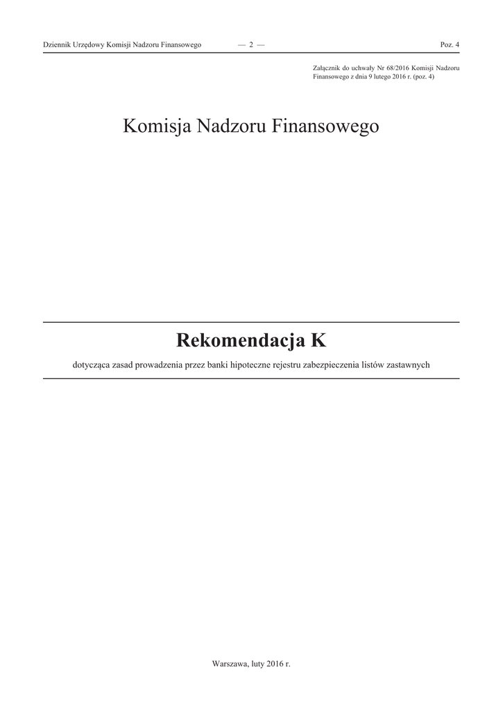 Dziennik Urzędowy Komisji Nadzoru Finansowego — 2 — Poz. 4 Załącznik do uchwały Nr 68/2016 Komisji Nadzoru Finansowego z dnia 9 lutego 2016 r. (poz. 4) Komisja Nadzoru Finansowego Rekomendacja K dotycząca zasad prowadzenia przez banki hipoteczne rejestru zabezpieczenia listów zastawnych Warszawa, luty 2016 r. Dziennik Urzędowy Komisji Nadzoru Finansowego — 3 — Poz. 4 WSTĘP Na podstawie przepisów ustawy z dnia 29 sierpnia 1997 r. o listach zastawnych i bankach hipotecznych (Dz. U. z 2015 r. poz. 1588) (zwanej dalej „ustawą”) banki hipoteczne zobowiązane są do prowadzenia rejestru zabezpieczenia listów zastawnych. Rejestr ten odgrywa niezwykle istotną rolę dla działalności banku hipotecznego, zawiera informacje pozwalające zidentyfikować składniki stanowiące podstawę emisji listów zastawnych, a także środki tworzące nadwyżkę, o której mowa w art. 18 ust. 3a ustawy. Na podstawową działalność specjalistycznych banków hipotecznych należy patrzeć pod kątem charakteru podejmowanych przez nie czynności. Banki hipoteczne z założenia udzielają kredytów długoterminowych i refinansują je poprzez emisje zwykle długoterminowych listów zastawnych. Wymaga to zarówno od banków hipotecznych, jak i od nadzoru bankowego odpowiedniego podejścia do zapewnienia bezpieczeństwa ich działalności. Rekomendacja obejmuje zestaw jakościowych zaleceń stanowiących ogólne zasady prowadzenia rejestru zabezpieczenia listów zastawnych i jego kontroli. Zalecenia dotyczą formy rejestru, upoważnień dla osób posiadających dostęp do rejestru, ochrony przed utratą danych oraz innych wymogów związanych z zapewnieniem: poprawności, podlegania badaniom audytu, ciągłości funkcjonowania, bezpieczeństwa rejestru oraz innych kwestii porządkowych. Delegacja dla Komisji Nadzoru Finansowego zawarta w ustawie pozwala jedynie na określenie wzoru rejestru, nie determinując formy jego prowadzenia, w związku z czym banki hipoteczne mają praktycznie dowolność formy jego prowadzenia – w formie papierowej lub elektronicznej. Rekomendacja przywołuje te formy oraz zwraca uwagę na dodatkowe wymogi w przypadku prowadzenia rejestru w formie elektronicznej. W przypadku prowadzenia rejestru w formie elektronicznej Rekomendacja wskazuje na konieczność spełnienia specyficznych wymogów związanych z tą formą oraz z bezpieczeństwem informatycznym takiego rozwiązania, przewidzianych w Rekomendacji D dotyczącej zarządzania obszarami technologii informacyjnej i bezpieczeństwa środowiska teleinformatycznego w bankach. W przypadku dokonywania wpisów do rejestru przez bank hipoteczny, w skali dla której powiernik stosuje badanie próby zamiast pojedynczego badania każdego z wpisów (co może być wykorzystane np. w sytuacji istotnego zwiększenia skali działalności kredytowej banku hipotecznego lub transferu portfela wierzytelności do banku hipotecznego), bank hipoteczny powinien gromadzić dokumentację dotyczącą metodologii i procesu ustalania przez powiernika wielkości próby do badania. Rekomendacja zawiera niezbędne wskazówki dla banku hipotecznego i oczekiwania organu nadzoru w tym zakresie. Celem Rekomendacji K jest wskazanie przez Komisję Nadzoru Finansowego bankom hipotecznym podstawowych zasad prowadzenia rejestru zabezpieczenia listów zastawnych. Dziennik Urzędowy Komisji Nadzoru Finansowego — 4 — Poz. 4 I. Rejestr zabezpieczenia listów zastawnych – wymogi ogólne 1. Rejestr zabezpieczenia może być prowadzony w formie papierowej lub elektronicznej. 2. Rejestr zabezpieczenia podlega szczególnej ochronie przed nieuprawnionym dostępem, jak i przed uszkodzeniem lub zniszczeniem przez czynniki zewnętrzne. 3. Bank hipoteczny utrzymuje co najmniej jedną kompletną kopię bezpieczeństwa danych każdego rejestru zabezpieczenia listów zastawnych. 4. Wpisy mogą być dokonywane jedynie przez osoby upoważnione; upoważnienia i ewentualne zmiany w nich powinny być dokumentowane. W odniesieniu do każdej osoby dokumentacja dotycząca upoważnienia powinna być przechowywana przez okres co najmniej 10 lat po odwołaniu upoważnienia. 5. Każda zmiana wpisu w rejestrze zabezpieczenia listów zastawnych wymaga zgody powiernika i może być dokonana jedynie poprzez wykreślenie istniejącego wpisu i wprowadzenie do rejestru nowego wpisu uwzględniającego zmianę. II. Dodatkowe wymogi dla rejestru w formie elektronicznej 1. Treść elektronicznego rejestru powinna być uwidaczniana na monitorze komputera jak i na wydrukach w sposób, który przedstawia wpisy w sposób kompletny pod względem formy i treści. Elektroniczny rejestr zabezpieczeń powinien każdorazowo pozwalać na kompletny wydruk całości zawartości. 2. Konieczne jest zapewnienie przez bank hipoteczny stałej możliwości odtworzenia treści rejestru zabezpieczenia prowadzonego w formie elektronicznej w niezmienionej, czytelnej formie oraz musi ona być trwale archiwizowana w sposób, który w każdym momencie zapewnia możliwość poddania badaniu audytu. 3. W przypadku prowadzenia rejestru w formie elektronicznej, kopia zapasowa powinna być przechowywana na innym nośniku danych niż nośnik przechowujący rejestr i aktualizowana pod względem statusu rejestru zabezpieczenia na dany moment nie rzadziej niż na koniec każdego dnia roboczego. 4. Zastosowane systemy przetwarzania danych powinny spełniać wymogi określone w Rekomendacji D dotyczącej zarządzania obszarami technologii informacyjnej i bezpieczeństwa środowiska teleinformatycznego w bankach. Ważne jest zwrócenie uwagi na aspekty Rekomendacji D, które są istotne ze względu na szczególny charakter rejestru zabezpieczenia, w szczególności dotyczące utrzymania i eksploatacji systemu informatycznego. III. Wymogi dotyczące wprowadzania wpisów do rejestru 1. Wpisy wprowadzane są do rejestru dopiero wtedy, gdy zostają spełnione wszystkie przesłanki dotyczące włączenia ich do rejestru. Wstec
