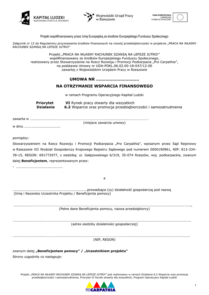 Projekt współfinansowany przez Unię Europejską ze środków Europejskiego Funduszu Społecznego Załącznik nr 12 do Regulaminu przyznawania środków finansowych na rozwój przedsiębiorczości w projekcie „PRACA NA WŁASNY RACHUNEK SZANSĄ NA LEPSZE JUTRO!” Projekt „PRACA NA WŁASNY RACHUNEK SZANSĄ NA LEPSZE JUTRO!” współfinansowany ze środków Europejskiego Funduszu Społecznego, realizowany przez Stowarzyszenie na Rzecz Rozwoju i Promocji Podkarpacia „Pro Carpathia”, na podstawie Umowy nr UDA-POKL.06.02.00-18-047/12-00 zawartej z Wojewódzkim Urzędem Pracy w Rzeszowie UMOWA NR ………………………….. NA OTRZYMANIE WSPARCIA FINANSOWEGO w ramach Programu Operacyjnego Kapitał Ludzki Priorytet Działanie VI Rynek pracy otwarty dla wszystkich 6.2 Wsparcie oraz promocja przedsiębiorczości i samozatrudnienia zawarta w ………………………………………………………………………………………………………………………… (miejsce zawarcia umowy) w dniu …………………………………… pomiędzy: Stowarzyszeniem na Rzecz Rozwoju i Promocji Podkarpacia „Pro Carpathia”, wpisanym przez Sąd Rejonowy w Rzeszowie XII Wydział Gospodarczy Krajowego Rejestru Sądowego pod numerem 0000190961, NIP: 813-33439-15, REGON: 691772977, z siedzibą: ul. Gałęzowskiego 6/319, 35-074 Rzeszów, woj. podkarpackie, zwanym dalej Beneficjentem, reprezentowanym przez: - …………………………………………….. a …………………………………………………………………………..prowadząca (cy) działalność gospodarczą pod nazwą (Imię i Nazwisko Uczestnika Projektu / Beneficjenta pomocy) ……………………………………………………………………………………………………………………………...………………………………………….……….., (Pełne dane Beneficjenta pomocy, nazwa przedsiębiorcy) …………………………….………………….………………………………………………………………………………………….…………………………………..….. (adres siedziby działalności gospodarczej) …………………………….………………….……………………………………………………………………………………………………….………………….…….. (NIP, REGON) zwanym dalej „Beneficjentem pomocy” / „Uczestnikiem projektu” Strony uzgodniły co następuje: Projekt „PRACA NA WŁASNY RACHUNEK SZANSĄ NA LEPSZE JUTRO!” jest realizowany w ramach Działania 6.2 Wsparcie oraz promocja przedsiębiorczości i samozatrudnienia, Priorytet VI Rynek otwarty dla wszystkich, Program Operacyjny Kapitał Ludzki 1 Projekt współfinansowany przez Unię Europejską ze środków Europejskiego Funduszu Społecznego §1 Przedmiot umowy 1. Przedmiotem niniejszej Umowy jest udzielenie przez Beneficjenta wsparcia finansowego na rozpoczęcie działalności gospodarczej, zwanego dalej „dotacją”. 2. Dotacja, polega na udzieleniu Beneficjentowi pomocy jednorazowego wsparcia finansowego ułatwiającego sfinansowanie pierwszych wydatków inwestycyjnych umożliwiających funkcjonowanie nowopowstałego przedsiębiorstwa, zgodnie z Wnioskiem Beneficjenta pomocy nr ……………….……………, stanowiącym załącznik nr 1 do niniejszej Umowy. 3. Dotacja jest udzielana w oparciu o zasadę de minimis, zgodnie z Rozporządzenia Ministra Rozwoju Regionalnego z dnia 15 grudnia 2010 roku w sprawie udzielania pomocy publicznej w ramach Programu Operacyjnego Kapitał Ludzki (Dz. U. Nr 239, poz. 1598 z 2010 r. z późn. zm.), zwanym dalej „Rozporządzeniem”. 4. Beneficjent pomocy otrzymuje dotację na zasadach i warunkach określonych w niniejszej Umowie oraz załączniku, który stanowi integralną część Umowy. 5. Beneficjent pomocy przyjmuje dotację i zobowiązuje się do jej wykorzystania zgodnie z harmonogramem rzeczowo-finansowym inwestycji będącej przedmiotem Wniosku, o którym mowa w ust. 2, w zakresie zaakceptowanym przez uprawnionego przedstawiciela Instytucji Pośredniczącej. 6. Beneficjent pomocy ponosi wyłączną odpowiedzialność za szkody wyrządzone wobec osób trzecich w związku z realizowaną inwestycją. §2 Finansowanie dotacji i płatności 1. Całkowite wydatki inwestycyjne wynoszą brutto ................................... PLN (słownie: .................................................................................................................... PLN). Wydatki kwalifikowane inwestycji wynoszą brutto ………………… PLN (słownie: ………………..………….……………… ……………………………………………………… PLN). 2. Kwota dotacji wynosi .......................................... PLN (słownie: ...................................... ....................................................................... PLN), co stanowi ..................... % wydatków kwalifikowanych inwestycji 1. 3. Beneficjent wypłaci Beneficjentowi pomocy kwotę dotacji, o której mowa w ust. 2 w następujący sposób: 1) zaliczka w wysokości 80% kwoty dotacji, tj. ............................ PLN (słownie: .........................................……………………………….PLN), zostanie przekazana w terminie do 14 dni od dnia złożenia zabezpieczenia, o którym mowa w § 4, ust. 2, pkt. 2, pod warunkiem dostępności środków na rachunku bankowym Beneficjenta. 2) płatność końcowa w formie refundacji poniesionych przez Beneficjenta Ostatecznego całkowitych wydatków na realizację inwestycji, o których mowa w § 2, ust. 1, w wysokości nie większej niż 20% kwoty dotacji, tj. ............................. PLN (słownie: .......................................................................... PLN), dokonana będzie w terminie 14 dni od dnia zatwierdzenia przez Beneficjenta całościowego rozlic