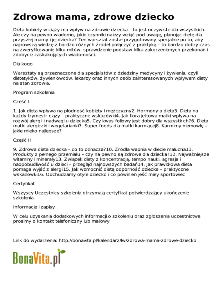 Zdrowa mama, zdrowe dziecko Dieta kobiety w ciąży ma wpływ na zdrowie dziecka – to jest oczywiste dla wszystkich. Ale czy na pewno wiadomo, jakie czynniki należy wziąć pod uwagę, planując dietę dla przyszłej mamy i jej dziecka? Ten warsztat został przygotowany specjalnie po to, aby najnowszą wiedzę z bardzo różnych źródeł połączyć z praktyką – to bardzo dobry czas na zweryfikowanie kilku mitów, sprawdzenie podstaw kilku zakorzenionych przekonań i zdobycie zaskakujących wiadomości. Dla kogo Warsztaty są przeznaczone dla specjalistów z dziedziny medycyny i żywienia, czyli dietetyków, żywieniowców, lekarzy oraz innych osób zainteresowanych wpływem diety na stan zdrowia. Program szkolenia Cześć I 1. Jak dieta wpływa na płodność kobiety i mężczyzny2. Hormony a dieta3. Dieta na każdy trymestr ciąży – praktyczne wskazówki4. Jak flora jelitowa matki wpływa na rozwój alergii i nadwagi u dziecka5. Czy kwas foliowy jest dobry dla wszystkich?6. Dieta matki alergiczki i wegetarianki7. Super foods dla matki karmiącej8. Karmimy niemowlę – jakie mleko najlepsze? Część II 9. Zdrowa dieta dziecka – co to oznacza?10. Źródła wapnia w diecie malucha11. Produkty z pełnego przemiału – czy na pewno są zdrowe dla dziecka?12. Najważniejsze witaminy i minerały13. Związek diety z koncentracją, tempo nauki, agresja i nadpobudliwość u dzieci – przegląd najnowszych badań14. Jak prawidłowa dieta pomaga wyjść z alergii15. Jak wzmocnić dietą odporność dziecka – praktyczne wskazówki16. Odchudzamy otyłe dziecko i co powinien jeść mały sportowiec Certyfikat Wszyscy Uczestnicy szkolenia otrzymają certyfikat potwierdzający ukończenie szkolenia. Informacje i zapisy W celu uzyskania dodatkowych informacji o szkoleniu oraz zgłoszenia uczestnictwa prosimy o kontakt telefoniczny lub mailowy Link do wydarzenia: http://bonavita.pl/kalendarz/lw/zdrowa-mama-zdrowe-dziecko