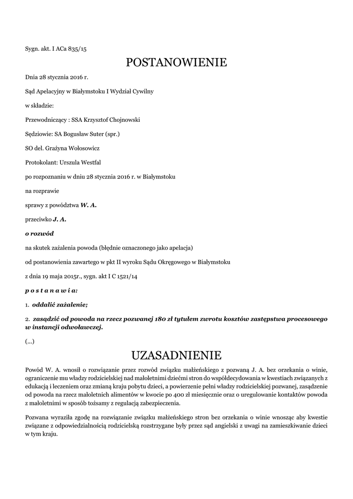 Sygn. akt. I ACa 835/15 POSTANOWIENIE Dnia 28 stycznia 2016 r. Sąd Apelacyjny w Białymstoku I Wydział Cywilny w składzie: Przewodniczący : SSA Krzysztof Chojnowski Sędziowie: SA Bogusław Suter (spr.) SO del. Grażyna Wołosowicz Protokolant: Urszula Westfal po rozpoznaniu w dniu 28 stycznia 2016 r. w Białymstoku na rozprawie sprawy z powództwa W. A. przeciwko J. A. o rozwód na skutek zażalenia powoda (błędnie oznaczonego jako apelacja) od postanowienia zawartego w pkt II wyroku Sądu Okręgowego w Białymstoku z dnia 19 maja 2015r., sygn. akt I C 1521/14 p o s t a n a w i a: 1. oddalić zażalenie; 2. zasądzić od powoda na rzecz pozwanej 180 zł tytułem zwrotu kosztów zastępstwa procesowego w instancji odwoławczej. (...) UZASADNIENIE Powód W. A. wnosił o rozwiązanie przez rozwód związku małżeńskiego z pozwaną J. A. bez orzekania o winie, ograniczenie mu władzy rodzicielskiej nad małoletnimi dziećmi stron do współdecydowania w kwestiach związanych z edukacją i leczeniem oraz zmianą kraju pobytu dzieci, a powierzenie pełni władzy rodzicielskiej pozwanej, zasądzenie od powoda na rzecz małoletnich alimentów w kwocie po 400 zł miesięcznie oraz o uregulowanie kontaktów powoda z małoletnimi w sposób tożsamy z regulacją zabezpieczenia. Pozwana wyraziła zgodę na rozwiązanie związku małżeńskiego stron bez orzekania o winie wnosząc aby kwestie związane z odpowiedzialnością rodzicielską rozstrzygane były przez sąd angielski z uwagi na zamieszkiwanie dzieci w tym kraju. Wyrokiem z dnia 19 maja 2015 roku Sąd Okręgowy w Białymstoku rozwiązał przez rozwód związek małżeński stron bez orzekania o winie, odrzucił pozew w zakresie odpowiedzialności rodzicielskiej oraz orzekł o kosztach postępowania. Uzasadniając postanowienie o odrzuceniu pozwu sąd I instancji wskazał, iż rozporządzenie w sprawie jurysdykcji oraz uznawania i wykonywania orzeczeń w sprawach małżeńskich oraz w sprawach dotyczących odpowiedzialności rodzicielskiej wyraźnie rozłącznie traktuje jurysdykcję w zakresie żądania orzeczenia rozwodu i jurysdykcję dotyczącą szeroko rozumianej odpowiedzialności rodzicielskiej. Co do zasady, posiadanie jurysdykcji w sprawie o rozwód nie przesądza jej istnienia również w odniesieniu do żądań dotyczących rozstrzygania w przedmiocie odpowiedzialności rodzicielskiej. Zgodnie bowiem z art. 8 ust. 1 Rozporządzenia w sprawach odpowiedzialności rodzicielskiej jurysdykcję mają sądy państwa członkowskiego, w którym w chwili wniesienia pozwu lub wniosku dziecko ma zwykły pobyt. Pojęcie zwykłego pobytu nie został w rozporządzeniu zdefiniowane. W orzecznictwie Trybunału Sprawiedliwości Unii Europejskiej pod tym pojęciem rozumie się: miejsce gdzie zainteresowany je ustanowił z zamiarem, że będzie ono miało trwały charakter; stałe lub zwykłe centrum jego interesów ( (...) v (...), Case C-452/93 P); miejsce w którym znajduje się zwykłe centrum interesów (R. A.-V. v B. für A., C-372/02); miejsce, w którym pobyt wykazuje pewną stałość lub regularność, miejsce które wskazuje na pewien stopień integracji, w którym osoba zamierza założyć stałe lub zwykłe centrum swoich interesów z nastawieniem, że będzie miało trwały charakter; należy przy tym brać pod uwagę czas trwania, regularność, warunki I przyczyny przebywania na terytorium danego państwa (B. M. v R. C., C-497/10 (...)). Biorąc pod uwagę łącznik obywatelstwa, powództwo w sprawach dotyczących rozwodu, separacji lub unieważnienia małżeństwa można wytoczyć w sądach państwa członkowskiego, którego obywatelstwo posiadają oboje małżonkowie lub, w przypadku Zjednoczonego Królestwa i Irlandii, w którym mają swój wspólny "domicile". W odniesieniu do wskazanego rozumienia miejsca pobytu dzieci, zdaniem Sądu Okręgowego nie ulega wątpliwości, iż znajduje się ono w Wielkiej Brytanii. Tam jest bowiem centrum życiowe dzieci, tam się urodziły, tam chodzą do szkoły i przedszkola, i tam poza sporadycznymi wyjazdami do Polski spędziły większość swego życia. Nadto z twierdzeń pozwanej wynika, że z tym krajem łączy również przyszłość swoją i dzieci. Zatem ogólna jurysdykcja do orzekania w sprawie odpowiedzialności rodzicielskiej należała do sądu brytyjskiego. Dalej Sąd Okręgowy wskazał, że wprawdzie możliwym było poddanie kwestii odpowiedzialności rodzicielskiej jurysdykcji sądu polskiego przy jej uznaniu przez powódkę (art. 12 rozporządzenia), jednak powódka odmówiła uznania jurysdykcji polskiego sądu w sprawie odpowiedzialności rodzicielskiej wnosząc o rozstrzygnięcie tych kwestii przez Sąd Wielkiej Brytanii. W konsekwencji, w ocenie Sądu Okręgowego, pozew w tej części podlegał odrzuceniu. Zażalenie na postanowienie w przedmiocie odrzucenia pozwu – błędnie nazwane apelacją – złożył powód, zarzucając zaskarżonemu orzeczeniu: 1) naruszenie prawa materialnego; - art. 58 kro w związku z art. 12 ust. 1 Rozporządzenia Rady Europy Nr (...) z 27 listopada 2003 r. w sprawie jurysdykcji oraz uznawania i wykonywania orzeczeń w sprawach małżeńskich oraz w sprawach odpowiedzialności rodzicielskiej (Dz.U.UE.L. 2003-338.1 ze zm.) oraz art. 91 Konstytucji RP przez jego niezastosowanie i nie wydanie przez Sąd rozstrzygnięcia w zakresie odpowiedzialności rodzicielskiej pomimo występowania w niniejszej sprawie jurysdykcji Sądu Okręgowego w Białymstoku jako sądu właściwego do rozpoznania powództwa o rozwód oraz Sądu właściwego do orzekania w każdej sprawie odnoszącej się do odpowiedzialności rodzicielskiej związanej z tym powództwem wobec wyraźnego zaakceptowania przez pozwaną właściwości tegoż Sądu w chwili wniesienia powództwa w odpowiedzi na pozew oraz mimo obligatoryjnego nakazu wynikającego z art. 58 kro zamieszczenia w wyroku rozwodowym stosownych rozstrzygnięć; - art. 8 ust. 1 powołanego Rozporządzenia przez 
