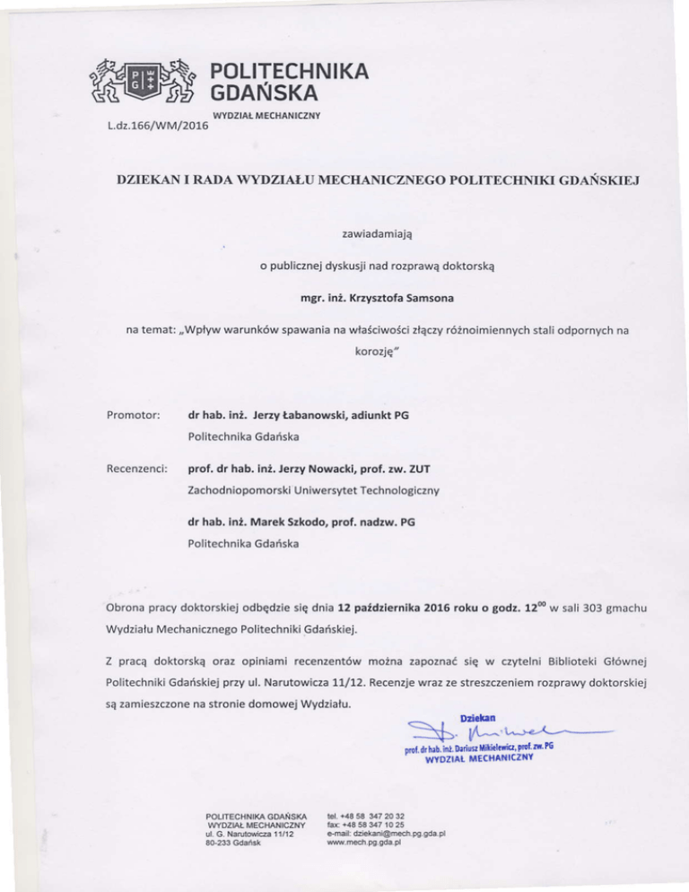 POLITECHNIKA GDAŃsKA L.d2.766/WM/2076 WYDZIALMECHANICZNY DZIEKAN I RADA WYDZIAŁU MECHANICZNEGo PoLITECHMKI GDANSKIEJ zawiadamiają o publicznejdyskusjinadrofprawądoktorską mgr.inź.K.zyśztofa samśona natemat:,,WpłyW Warunków spawania nawłaściwości złączy róźnoimiennych staIiodpornych na koro'ję" Promotor: dr hab. inż.lerry tabanowśk|, adiunktPG PoIitechnika Gdań5ka Recenrenci: prof.dj hab.|nż'Je''y Nowacki,p.of' zw. zuT Zachodniopomorski UniwersytetTechnologiczny d. hab' inż'Marek szkodo,prof.nadfw.PG PoIitechnika Gdańska obrona pracydoktorskiejodbędfiesię dnia 12 paźdrternika 2016 roku o 8odz. 12mw sali 3o3 8machu WydziałuMechaniczne8o PolitechnikiGdańskie.i. z pracą doktorskąoraz opiniami recenzentówmożnazapoznać5ię w czytelniBib|iotekiGłównej PoIitechniki Gdańskiejprzyu|.Narutowicza11/12'Recenzje wrazze streszczeniem rozprawy doktorskiej sązamieszczon€na stroniedomowejWydzialu. ---t*- . D'l!Łn l^ -'L'-r'-'(-- lulllllklnb'rroltll tt .btd'tub;niD ' wYDZlAL MEtHAnlczllY PollT€clN|KĄ GoA|ts(A wYDz|AlM€cMN|czNY eff]l df iek.ni@meó.pg, gd.,p|
