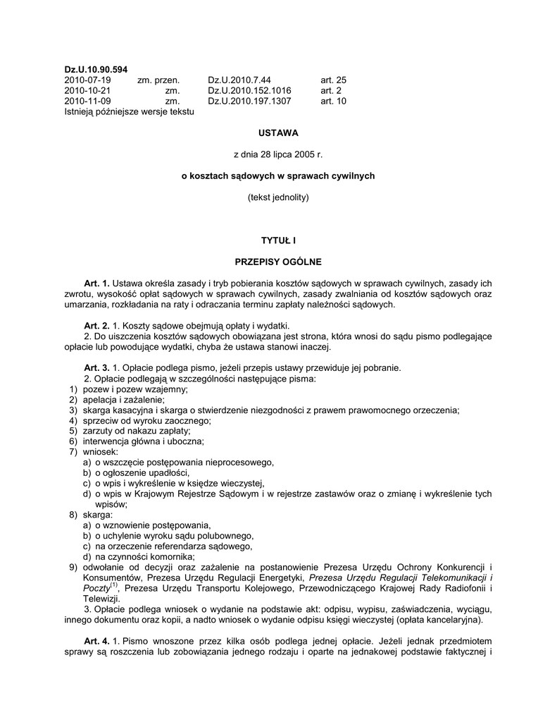 Dz.U.10.90.594 2010-07-19 zm. przen. 2010-10-21 zm. 2010-11-09 zm. Istnieją późniejsze wersje tekstu Dz.U.2010.7.44 Dz.U.2010.152.1016 Dz.U.2010.197.1307 art. 25 art. 2 art. 10 USTAWA z dnia 28 lipca 2005 r. o kosztach sądowych w sprawach cywilnych (tekst jednolity) TYTUŁ I PRZEPISY OGÓLNE Art. 1. Ustawa określa zasady i tryb pobierania kosztów sądowych w sprawach cywilnych, zasady ich zwrotu, wysokość opłat sądowych w sprawach cywilnych, zasady zwalniania od kosztów sądowych oraz umarzania, rozkładania na raty i odraczania terminu zapłaty należności sądowych. Art. 2. 1. Koszty sądowe obejmują opłaty i wydatki. 2. Do uiszczenia kosztów sądowych obowiązana jest strona, która wnosi do sądu pismo podlegające opłacie lub powodujące wydatki, chyba że ustawa stanowi inaczej. Art. 3. 1. Opłacie podlega pismo, jeżeli przepis ustawy przewiduje jej pobranie. 2. Opłacie podlegają w szczególności następujące pisma: 1) pozew i pozew wzajemny; 2) apelacja i zażalenie; 3) skarga kasacyjna i skarga o stwierdzenie niezgodności z prawem prawomocnego orzeczenia; 4) sprzeciw od wyroku zaocznego; 5) zarzuty od nakazu zapłaty; 6) interwencja główna i uboczna; 7) wniosek: a) o wszczęcie postępowania nieprocesowego, b) o ogłoszenie upadłości, c) o wpis i wykreślenie w księdze wieczystej, d) o wpis w Krajowym Rejestrze Sądowym i w rejestrze zastawów oraz o zmianę i wykreślenie tych wpisów; 8) skarga: a) o wznowienie postępowania, b) o uchylenie wyroku sądu polubownego, c) na orzeczenie referendarza sądowego, d) na czynności komornika; 9) odwołanie od decyzji oraz zażalenie na postanowienie Prezesa Urzędu Ochrony Konkurencji i Konsumentów, Prezesa Urzędu Regulacji Energetyki, Prezesa Urzędu Regulacji Telekomunikacji i (1) Poczty , Prezesa Urzędu Transportu Kolejowego, Przewodniczącego Krajowej Rady Radiofonii i Telewizji. 3. Opłacie podlega wniosek o wydanie na podstawie akt: odpisu, wypisu, zaświadczenia, wyciągu, innego dokumentu oraz kopii, a nadto wniosek o wydanie odpisu księgi wieczystej (opłata kancelaryjna). Art. 4. 1. Pismo wnoszone przez kilka osób podlega jednej opłacie. Jeżeli jednak przedmiotem sprawy są roszczenia lub zobowiązania jednego rodzaju i oparte na jednakowej podstawie faktycznej i prawnej (współuczestnictwo formalne), każdy współuczestnik uiszcza opłatę oddzielnie, stosownie do swojego roszczenia lub zobowiązania. 2. Opłatę od wniosku o dokonanie wpisu w księdze wieczystej pobiera się od osoby, która wystąpiła z takim wnioskiem, także wówczas, gdy na jego podstawie mają być ujawnione prawa osób, które nie są wnioskodawcami. 3. Nie pobiera się opłaty od wniosku o sporządzenie uzasadnienia oraz doręczenie odpisu orzeczenia z uzasadnieniem, zgłoszonego w terminie tygodniowym od dnia ogłoszenia sentencji. Art. 5. 1. Wydatki obejmują w szczególności: 1) koszty podróży strony zwolnionej od kosztów sądowych związane z nakazanym przez sąd jej osobistym stawiennictwem; 2) zwrot kosztów podróży i noclegu oraz utraconych zarobków lub dochodów świadków; 3) wynagrodzenie i zwrot kosztów poniesionych przez biegłych, tłumaczy oraz kuratorów ustanowionych dla strony w danej sprawie; 4) wynagrodzenie należne innym osobom lub instytucjom oraz zwrot poniesionych przez nie kosztów; 5) koszty przeprowadzenia innych dowodów; 6) koszty przewozu zwierząt i rzeczy, utrzymywania ich lub przechowywania; 7) koszty ogłoszeń; 8) koszty osadzenia i pobytu w areszcie; 9) ryczałty należne kuratorom sądowym za przeprowadzenie wywiadu środowiskowego w sprawach: o unieważnienie małżeństwa, o rozwód oraz separację, a także za uczestniczenie przy ustalonych przez sąd kontaktach rodziców z dziećmi; 10) koszty wystawienia zaświadczenia przez lekarza sądowego. 2. Wydatki związane z doręczaniem pism sądowych nie obciążają stron. 3. Wydatki związane ze zwrotem opłat nie obciążają stron. Art. 6. Koszty mediacji nie stanowią wydatków. Art. 7. 1. Stroną w rozumieniu ustawy jest każdy uczestnik postępowania sądowego, w tym także świadek, biegły i tłumacz, a kosztami procesu są również koszty innych rodzajów postępowania. 2. Przez pismo wnoszone do sądu rozumie się również składany ustnie do protokołu pozew, wniosek wszczynający innego rodzaju postępowanie lub inny wniosek, jeżeli podlega opłacie. Art. 8. 1. W postępowaniu dotyczącym kosztów sądowych stosuje się przepisy Kodeksu postępowania cywilnego, chyba że ustawa stanowi inaczej. 2. Postanowienie sądu lub referendarza sądowego w przedmiocie kosztów sądowych może być wydane na posiedzeniu niejawnym. Art. 9. Minister Sprawiedliwości określi, w drodze rozporządzenia: 1) sposób uiszczania opłat sądowych w sprawach cywilnych, w tym wnoszonych na rachunek bankowy sądu lub w formie znaków opłaty sądowej według ustalonego wzoru, mając na względzie łatwość uiszczenia opłat przez strony oraz skutek w postaci zwrotu lub odrzucenia pisma, od którego przy jego wniesieniu nie została uiszczona należna opłata; 2) wzór oświadczenia o stanie rodzinnym, majątku, dochodach i źródłach utrzymania, o którym mowa w art. 102 ust. 2, a także sposób udostępniania osobom fizycznym wzoru druków tych oświadczeń w siedzibach sądów, mając na względzie komunikatywność niezbędnych pouczeń dla stron co do sposobu wypełnienia, skutków niezłożenia lub złożenia nieprawdziwego oświadczenia; 3) wysokość wynagrodzenia i zwrot wydatków poniesionych przez biegłych, kuratorów ustanowionych dla strony w danej sprawie oraz innych osób i instytucji, mając na względzie nakład pracy i kwalifikacje niezbędne do wykonywania zleconych przez sąd czynności oraz poziom wynagrodzeń uzyskiwanych przez pracowników wykonujących podobne zawody. TYTUŁ II OPŁATY DZIAŁ 1 PRZEPISY OGÓLNE Art. 10. Opłatę należy uiścić przy wniesieniu do sądu pisma podlegającego opłacie. Art.