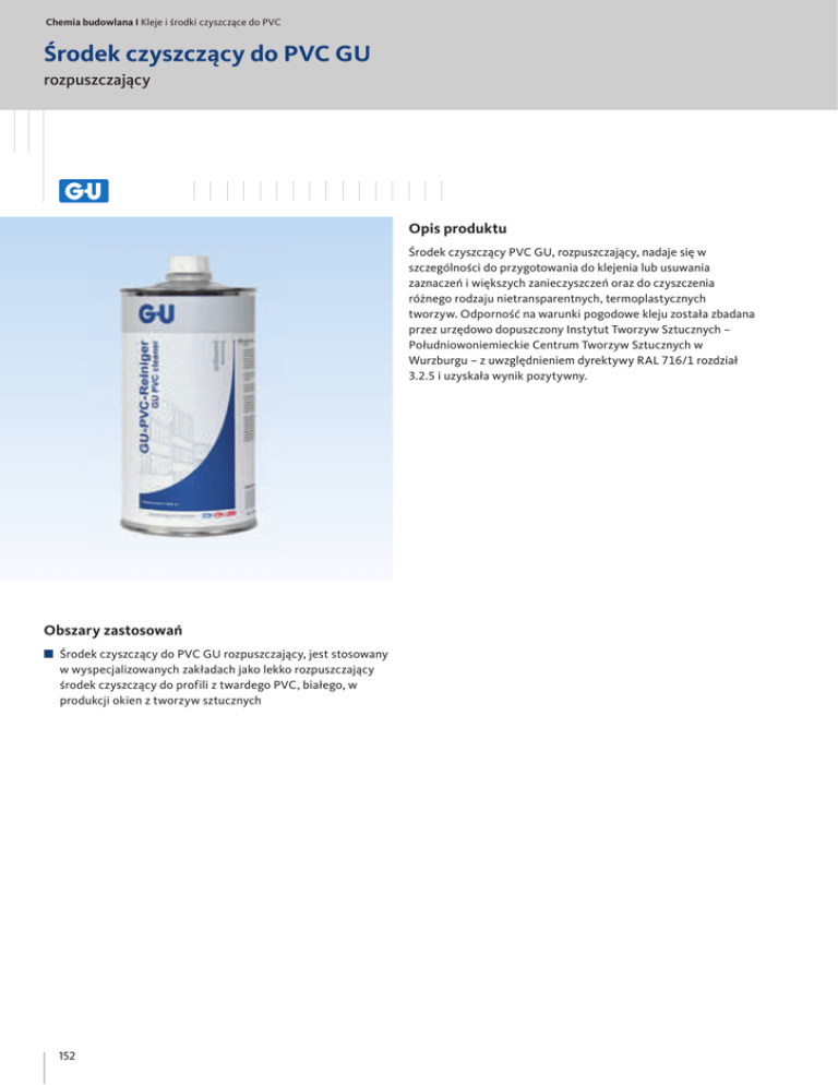 Chemia budowlana І Kleje i środki czyszczące do PVC Środek czyszczący do PVC GU rozpuszczający Opis produktu Środek czyszczący PVC GU, rozpuszczający, nadaje się w szczególności do przygotowania do klejenia lub usuwania zaznaczeń i większych zanieczyszczeń oraz do czyszczenia różnego rodzaju nietransparentnych, termoplastycznych tworzyw. Odporność na warunki pogodowe kleju została zbadana przez urzędowo dopuszczony Instytut Tworzyw Sztucznych – Południowoniemieckie Centrum Tworzyw Sztucznych w Wurzburgu – z uwzględnieniem dyrektywy RAL 716/1 rozdział 3.2.5 i uzyskała wynik pozytywny. Obszary zastosowań ■ Środek czyszczący do PVC GU rozpuszczający, jest stosowany w wyspecjalizowanych zakładach jako lekko rozpuszczający środek czyszczący do profili z twardego PVC, białego, w produkcji okien z tworzyw sztucznych 152 Dane i wymagania techniczne Środek czyszczący do PVC GU, rozpuszczający Klasyfikacje i zaklasyfikowania Baza mieszane estry kwasów monokarboksylowych, bezwonne i niezawierające chlorowanych węglowodorów Gęstość [1] ok. 0,90 g/cm3 Minimalna temperatura zastosowania ok +5 °C Temperatura zapłonu -4 °C Temperatura samozapłonu +460 °C [1] Norma NF / ISO / DIN DIN EN 542 Zmierzona przy 20°C. Informacje zamówienia Oznaczenie Opakowanie Zawartość Kolor Jedn. opak./ Kart.* Numer katalogowy Środek czyszczący do PVC GU, rozpuszczający Butelka metalowa 1000 ml – 10 poz. 9-38970-00-0-0 * Inne rozmiary opakowań dostępne na życzenie. Informacje zamówienia – akcesoria Oznaczenie Jedn. opak. Numer katalogowy Nawilżacz na wkłady GU, bez zawartości, pojemność maks. 4 litry 1 poz. H-01177-00-0-0 Sposób zastosowania Magazynowanie ■ Czyszczenie suchej, odpylonej powierzchni materiału odbywa się przy pomocy niepylących i niebarwiących szmatek z celulozy lub bawełny. W przypadku mocno zakurzonych powierzchni konieczne jest wstępne czyszczenie przy pomocy środka czyszczącego do PVC GU, nierozpuszczającego ■ Oryginalne opakowania przechowywać szczelnie zamknięte, w suchym miejscu, przy temperaturach od +15°C do +25°C bez bezpośredniego nasłonecznienia ■ Ze względu na higroskopijne działanie rozpuszczonego PVC rozpuszczające środki czyszczące z zasady mogą być stosowane wyłącznie w suchych warunkach! Z reguły wystarczające jest jednorazowe zmycie czyszczonej powierzchni, ewentualnie w przypadku bardziej intensywnego zabrudzenia czynność czyszczenia może zostać powtórzona po utwardzeniu powierzchni materiału Wskazówki bezpieczeństwa ■ Środek czyszczący do PVC GU, rozpuszczający, musi być oznakowany w rozumieniu rozporządzenia o materiałach niebezpiecznych (GefStoffV) 153