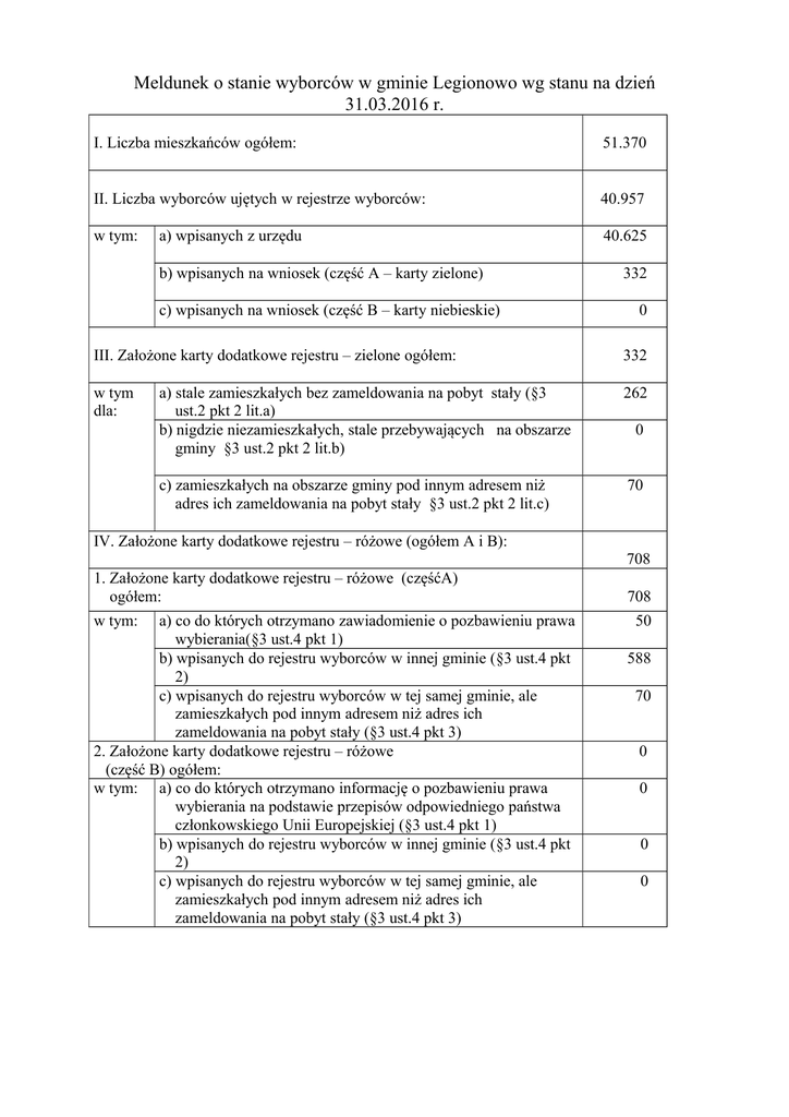Meldunek o stanie wyborców w gminie Legionowo wg stanu na dzień 31.03.2016 r. I. Liczba mieszkańców ogółem: 51.370 II. Liczba wyborców ujętych w rejestrze wyborców: 40.957 w tym: 40.625 a) wpisanych z urzędu b) wpisanych na wniosek (część A – karty zielone) c) wpisanych na wniosek (część B – karty niebieskie) 332 0 III. Założone karty dodatkowe rejestru – zielone ogółem: 332 w tym dla: a) stale zamieszkałych bez zameldowania na pobyt stały (§3 ust.2 pkt 2 lit.a) b) nigdzie niezamieszkałych, stale przebywających na obszarze gminy §3 ust.2 pkt 2 lit.b) 262 c) zamieszkałych na obszarze gminy pod innym adresem niż adres ich zameldowania na pobyt stały §3 ust.2 pkt 2 lit.c) 70 0 IV. Założone karty dodatkowe rejestru – różowe (ogółem A i B): 708 1. Założone karty dodatkowe rejestru – różowe (częśćA) ogółem: w tym: a) co do których otrzymano zawiadomienie o pozbawieniu prawa wybierania(§3 ust.4 pkt 1) b) wpisanych do rejestru wyborców w innej gminie (§3 ust.4 pkt 2) c) wpisanych do rejestru wyborców w tej samej gminie, ale zamieszkałych pod innym adresem niż adres ich zameldowania na pobyt stały (§3 ust.4 pkt 3) 2. Założone karty dodatkowe rejestru – różowe (część B) ogółem: w tym: a) co do których otrzymano informację o pozbawieniu prawa wybierania na podstawie przepisów odpowiedniego państwa członkowskiego Unii Europejskiej (§3 ust.4 pkt 1) b) wpisanych do rejestru wyborców w innej gminie (§3 ust.4 pkt 2) c) wpisanych do rejestru wyborców w tej samej gminie, ale zamieszkałych pod innym adresem niż adres ich zameldowania na pobyt stały (§3 ust.4 pkt 3) 708 50 588 70 0 0 0 0 Meldunek nr 2a Gmina: LEGIONOWO Meldunek na dzień 31.03.2016 r. Nr 1 2 3 4 5 6 7 8 9 10 11 12 13 14 15 16 17 18 19 20 21 22 23 Razem Okręg Mieszkańcy Wyborcy 2017 1599 2425 1918 2385 1912 2410 1749 2845 2285 2783 2148 2938 2360 2457 1982 2632 2078 2835 2248 1310 1050 2049 1633 1628 1263 2073 1664 2081 1633 1946 1524 2267 1871 2250 1877 1952 1561 1885 1520 2135 1759 2441 2042 1626 1281 51.370 40.957 Nr 1 2 3 4 5 6 7 8 9 10 11 12 13 14 15 16 17 18 19 20 21 22 23 Razem Obwód Mieszkańcy Wyborcy 2017 1599 2425 1918 2385 1912 2410 1749 2845 2285 2783 2148 2938 2360 2457 1982 2632 2078 2835 2248 1310 1050 2049 1633 1628 1263 2073 1664 2081 1633 1946 1524 2267 1871 2250 1877 1952 1561 1885 1520 2135 1759 2441 2042 1626 1281 51.370 40.957 INFORMACJA Prezydent Miasta Legionowo uprzejmie informuje, że zgodnie z art.19 §1 ustawy z dnia 5 stycznia 2011r. – Kodeks wyborczy (Dz. U. Nr 21, poz.112 ze zm.) wyborcy stale zamieszkali na obszarze miasta Legionowa bez zameldowania na pobyt stały mogą być wpisani do rejestru wyborców, jeżeli złożą pisemny wniosek w tej sprawie. Wnioski należy składać w Biurze Obsługi Klienta Urzędu Miasta Legionowo, ul.marsz. Józefa Piłsudskiego 41 w godzinach pracy urzędu. Druk wniosku można uzyskać w Biurze Obsługi Klienta Urzędu Miasta Legionowo bądź w Wydziale Spraw Obywatelskich – ul. marsz. Józefa Piłsudskiego 41 (stanowisko nr 3 i 4) oraz na stronie internetowej www.bip.legionowo.pl. Prezydent Miasta /-/ mgr Roman Smogorzewski