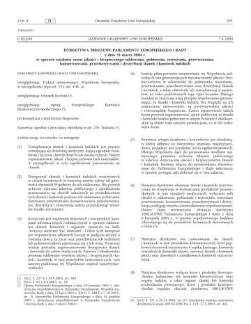 15/t. 8 Dziennik Urzędowy Unii Europejskiej PL 291 32004L0023 L 102/48 DZIENNIK URZĘDOWY UNII EUROPEJSKIEJ 7.4.2004 DYREKTYWA 2004/23/WE PARLAMENTU EUROPEJSKIEGO I RADY z dnia 31 marca 2004 r. w sprawie ustalenia norm jakości i bezpiecznego oddawania, pobierania, testowania, przetwarzania, konserwowania, przechowywania i dystrybucji tkanek i komórek ludzkich PARLAMENT EUROPEJSKI I RADA UNII EUROPEJSKIEJ, (4) Istnieje pilna potrzeba ustanowienia we Wspólnocie jednolitych ram gwarantujących wysokie normy jakości i bezpieczeństwa w odniesieniu do pobierania, testowania, przetwarzania, przechowywania oraz dystrybucji tkanek i komórek, a także ułatwienia ich transplantacji u pacjentów, co roku poddawanych tego typu leczeniu. Dlatego zasadnicze znaczenie mają przepisy wspólnotowe gwarantujące, że tkanki i komórki ludzkie, bez względu na ich zamierzone zastosowanie, są porównywalnej jakości i równorzędnie bezpieczne. Zatem ustanowienie takich norm pozwala zagwarantować opinii publicznej, że tkanki i komórki ludzkie pobierane w innym Państwie Członkowskim są objęte tymi samymi gwarancjami, co w ich rodzimym kraju. (5) Ponieważ terapia tkankowa i komórkowa jest dziedziną, w której odbywa się intensywna wymiana międzynarodowa, pożądane jest uzyskanie norm ogólnoświatowych. Dlatego Wspólnota dąży do promowania możliwie najwyższego poziomu ochrony zdrowia publicznego w zakresie dotyczącym jakości i bezpieczeństwa tkanek i komórek. Komisja włącza do sprawozdania skierowanego do Parlamentu Europejskiego i Rady informacje w sprawie postępu, jaki dokonał się w tym zakresie. (6) Niniejsza dyrektywa obejmuje tkanki i komórki przeznaczone do stosowania w wytwarzaniu produktów przemysłowych, w tym urządzeń medycznych, wyłącznie jeśli chodzi o oddawanie, pobieranie i testowanie, natomiast przetwarzanie, konserwowanie, przechowywanie i dystrybucja podlegają innemu ustawodawstwu wspólnotowemu. Dalsze etapy wytwarzania obejmuje dyrektywa 2001/83/WE Parlamentu Europejskiego i Rady z dnia 6 listopada 2001 r., w sprawie wspólnotowego kodeksu odnoszącego się do produktów leczniczych stosowanych u ludzi (4). (7) Niniejsza dyrektywa ma zastosowanie do tkanek i komórek, w tym produktów krwiotwórczych, krwi pępkowej i komórek macierzystych szpiku kostnego, komórek rozrodczych (komórki jajowe, sperma), tkanek i komórek płodu oraz dorosłych i zarodkowych komórek macierzystych. (8) Niniejsza dyrektywa wyłącza krew i produkty krwiopochodne (odmienne niż komórki krwiotwórcze) oraz organy ludzkie, a także organy, tkanki lub komórki pochodzenia zwierzęcego. Krew i produkty krwiopochodne reguluje obecnie dyrektywa 2001/83/WE uwzględniając Traktat ustanawiający Wspólnotę Europejską, w szczególności jego art. 152 ust. 4 lit. a), uwzględniając wniosek Komisji (1), uwzględniając opinię Ekonomiczno-Społecznego (2), Europejskiego Komitetu po konsultacji z Komitetem Regionów, stanowiąc zgodnie z procedurą określoną w art. 251 Traktatu (3), a także mając na uwadze, co następuje: (1) Transplantacja tkanek i komórek ludzkich jest prężnie rozwijającą się dziedziną medycyny, dającą ogromne możliwości leczenia chorób dotychczas nieuleczalnych. Należy zagwarantować jakość i bezpieczeństwo tych materiałów, w szczególności w celu zapobieżenia przenoszeniu się chorób. (2) Dostępność tkanek i komórek ludzkich stosowanych w celach leczniczych w znacznej mierze zależy od gotowości obywateli Wspólnoty do ich oddawania. Dla potrzeb ochrony ochrona zdrowia publicznego i zapobieżenia przenoszeniu się chorób zakaźnych za pośrednictwem tych tkanek i komórek podczas ich oddawania, pobierania, testowania, przetwarzania, konserwowania, przechowywania, dystrybucji i stosowania należy przedsięwziąć wszelkie środki ostrożności. (3) Konieczne jest wspieranie krajowych i europejskich kampanii informacyjnych i edukacyjnych w sprawie oddawania tkanek, komórek i organów, opartych na haśle „wszyscy możemy być dawcami”. Celem tych kampanii jest wspomożenie obywateli Europy w podjęciu decyzji o zostaniu dawcą za życia oraz umożliwienie ich rodzinom lub pełnomocnikom zapoznania się z ich wolą. Ponieważ istnieje potrzeba zagwarantowania dostępności tkanek i komórek do celów medycznych, Państwa Członkowskie promują oddawanie wysokiej jakości i bezpiecznych tkanek i komórek, w tym materiałów krwiotwórczych, tym samym podnosząc we Wspólnocie stopień samowystarczalności. ( ) Dz.U. C 227 E z 24.9.2002, str. 505. (2) Dz.U. C 85 z 8.4.2003, str. 44. (3) Opinia Parlamentu Europejskiego z dnia 10 kwietnia 2003 r. (dotychczas niepublikowana w Dzienniku Urzędowym). Wspólne stanowisko Rady z dnia 22 lipca 2003 r. (Dz.U. C 240 E z 7.10.2003., str. 3), stanowisko Parlamentu Europejskiego z dnia 16 grudnia 2003 r. (dotychczas niepublikowane w Dzienniku Urzędowym) i decyzja Rady z dnia 2 marca 2004 r. 1 (4) Dz.U. L 311 z 28.11.2001, str. 67. Dyrektywa ostatnio zmieniona dyrektywą Komisji 2003/63/WE Dz. L 159, 27.5.2003, str. 46). 292 PL Dziennik Urzędowy Unii Europejskiej i 2000/70/WE (1), zalecenie 98/463/WE (2) i dyrektywa 2002/98/WE (3). Tkanki i komórki stosowane do autoprzeszczepu (tkanki usunięte i ponownie przeszczepione tej samej osobie) w ramach jednego zabiegu chirurgicznego oraz bez poddawania ich przechowywaniu w banku tkanek, również wyłącza się z niniejszej dyrektywy. Zagadnienia jakości i bezpieczeństwa związane z tym procesem są zupełnie odmienne. (9) (10) (11) (12) Wykorzystywanie organów do pewnego stopnia podnosi te same zagadnienia, co stosowanie tkanek i komórek, chociaż istnieją między nimi poważne różnice, a zatem nie należy ujmować obu tych zagadnień w jednej dyrektywie. Niniejsza dyrektywa obejmuje tkanki i komórki przeznaczone do stosowania u ludzi, w tym tkanki i komórki ludzkie używane do wytwarzania produktów kosmetycznych. Jednakże w świ