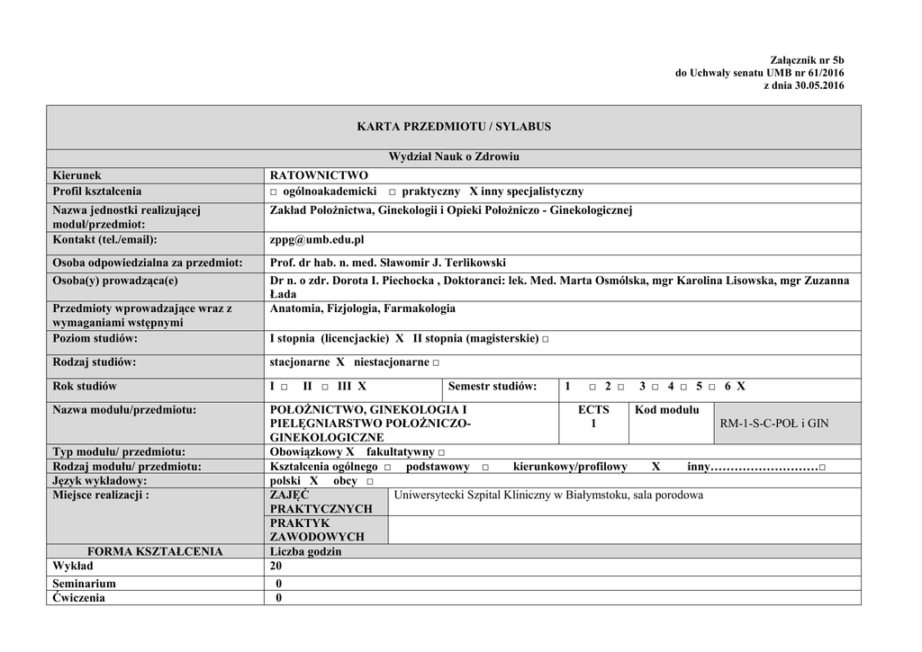 Załącznik nr 5b do Uchwały senatu UMB nr 61/2016 z dnia 30.05.2016 KARTA PRZEDMIOTU / SYLABUS Wydział Nauk o Zdrowiu Kierunek Profil kształcenia RATOWNICTWO □ ogólnoakademicki □ praktyczny X inny specjalistyczny Nazwa jednostki realizującej moduł/przedmiot: Kontakt (tel./email): Zakład Położnictwa, Ginekologii i Opieki Położniczo - Ginekologicznej Osoba odpowiedzialna za przedmiot: Osoba(y) prowadząca(e) Prof. dr hab. n. med. Sławomir J. Terlikowski Dr n. o zdr. Dorota I. Piechocka , Doktoranci: lek. Med. Marta Osmólska, mgr Karolina Lisowska, mgr Zuzanna Łada Anatomia, Fizjologia, Farmakologia Przedmioty wprowadzające wraz z wymaganiami wstępnymi Poziom studiów: [email protected] I stopnia (licencjackie) X II stopnia (magisterskie) □ Rodzaj studiów: stacjonarne X niestacjonarne □ Rok studiów I □ Nazwa modułu/przedmiotu: POŁOŻNICTWO, GINEKOLOGIA I ECTS Kod modułu RM-1-S-C-POŁ i GIN PIELĘGNIARSTWO POŁOŻNICZO1 GINEKOLOGICZNE Obowiązkowy X fakultatywny □ Kształcenia ogólnego □ podstawowy □ kierunkowy/profilowy X inny………………………□ polski X obcy □ Uniwersytecki Szpital Kliniczny w Białymstoku, sala porodowa ZAJĘĆ PRAKTYCZNYCH PRAKTYK ZAWODOWYCH Liczba godzin 20 0 0 Typ modułu/ przedmiotu: Rodzaj modułu/ przedmiotu: Język wykładowy: Miejsce realizacji : FORMA KSZTAŁCENIA Wykład Seminarium Ćwiczenia II □ III X Semestr studiów: 1 □ 2 □ 3 □ 4 □ 5 □ 6 X Samokształcenie Laboratorium E-learning Zajęcia praktyczne Praktyki zawodowe Inne …………………… RAZEM Założenia i cel przedmiotu: Opis przedmiotu: 0 0 0 10 0 0 30 Pielęgnacja i opieka nad ciężarną przyjętą do oddziału sali porodowej Rozpoznawanie ciąży prawidłowej -przebieg porodu fizjologicznego oraz postępowanie z rodzącą Sposoby rozpoznawania ciąży mnogiej, opieka i pielęgnacja kobiety rodzącej Pielęgnacja rodzącej w wodzie -znajomość zasad kwalifikowania do porodu Umiejętność badania zewnętrznego i per vaginam -rozpoznawanie ułożeń odgięciowych płodu w przebiegu porodu Znajomość zasad działania urządzeń i narzędzi wykorzystywanych podczas porodów powikłanych –kleszcze położnicze i vacuum extractor Umiejętność sprawowania fachowej opieki i pielęgnacji nad rodzącą i płodem w poszczególnych okresach porodu Prowadzenie porodu oraz pielęgnacja rodzącej z ciążą obumarłą Przygotowanie pacjentki oraz zestawów do badań diagnostycznych wykonywanych w oddziale sali porodowej -KTG, OC-test, amnioskopia, amniocenteza Umiejętność wykonania zapisu oraz jego odczytania i interpretacji Wykład multimedialny, ćwiczenia na fantomach, ćwiczenia z użyciem narzędzi, pogadanka, pokaz praktyczny, filmy edukacyjne rzutnik multimedialny, plansze, fantomy / symulatory, narzędzia, materiał opatrunkowy, sprzęt medyczny, aparatura Narzędzia medyczna (m. in. KTG, pompa infuzyjna) dydaktyczne MACIERZ EFEKTÓW KSZTAŁCENIA DLA MODUŁU /PRZEDMIOTU W ODNIESIENIU DO KIERUNKOWYCH EFEKTÓW KSZTAŁCENIA, METOD WERYFIKACJI ZAMIERZONYCH EFEKTÓW KSZTAŁCENIA ORAZ FORMY REALIZACJI ZAJĘĆ. Symbol i numer Student, który zaliczy moduł (przedmiot) wie/umie/potrafi: Odniesienie do Metody weryfikacji osiągnięcia Forma zajęć przedmiotowego kierunkowych zamierzonych efektów dydaktycznych* efektu efektów kształcenia: wpisz symbol kształcenia kształcenia Formujące Podsumowujące *** ** WIEDZA IV W_01 wykazuje znajomość prawidłowych struktur organizmu ludzkiego: OM1_ W01 Zaliczenie Test W komórek, tkanek, narządów, układów; dopasowania, T/N wstępne lub uzupełniania odpowiedzi IV W_09 zna i rozumie mechanizmy prowadzące do nagłych OM1_W03 Zaliczenie Testy W zagrożeń wstępne dopasowania, T/N Metody dydaktyczne zdrowia i życia; IV W_12 zna metody ograniczania bólu; OM1_W03, OM1_W05 UMIEJĘTNOŚCI potrafi ocenić stan pacjenta w celu ustalenia postępowania OM1_U01 IV U_1 IV U_3 posiada umiejętność układania pacjenta w pozycji właściwej dla rodzaju schorzenia lub odniesionych obrażeń ciała; OM1_U04 OM1_U05 Zaliczenie wstępne Zal. każdego ćwiczenia Zaliczenie poszczególnych czynności Zal. każdego ćwiczenia Zaliczenie poszczególnych czynności Zaliczenie poszczególnych czynności IV U_4 potrafi prowadzić podstawowe czynności resuscytacyjne u dorosłych i dzieci OM1_U01 OM1_U05 IV U_5 potrafi prowadzić zaawansowane czynności resuscytacyjne u dorosłych i dzieci OM1_U01 OM1_U05 IV U_23 potrafi oznaczać poziom glukozy z użyciem glukometru IV U_32 potrafi odebrać poród nagły w warunkach pozaszpitalnych; OM1_U01 OM1_U02 OM1_U05 OM1_U01 OM1_U02 OM1_U05 IV K_01 KOMPETENCJE SPOŁECZNE / POSTAWY jest przygotowany do aktywnego uczestniczenia w grupach OM1_K01 (zespołach) i organizacjach, realizujących cele społeczne; lub uzupełniania odpowiedzi Test dopasowania, T/N lub uzupełniania odpowiedzi W Obserwacja pracy studenta podczas zajęć Ć, ZP, Realizacja zleconego zadania Obserwacja pracy studenta podczas zajęć Ć,ZP, Realizacja zleconego zadania Obserwacja pracy studenta podczas zajęć Ć,ZP, Realizacja zleconego zadania Ocena 360, samoocena IV K_09 Potrafi określić priorytety w działaniu OM1_K05 NAKŁAD PRACY STUDENTA (BILANS PUNKTÓW ECTS) Forma nakładu pracy studenta (udział w zajęciach, aktywność, przygotowanie sprawdzenie, itp.) Godziny kontaktowe z nauczycielem akademickim (wg planu studiów) Udział w wykładach (wg planu studiów) Udział w ćwiczeniach(wg planu studiów) Udział w seminariach (wg planu studiów) Udział w konsultacjach związanych z zajęciami Obciążenie studenta na zajęciach wymagających bezpośredniego udziału nauczycieli akademickich (zajęcia praktyczne) (wg planu studiów) Samodzielna praca studenta (przykładowa forma pracy studenta) Samodzielne przygotowanie do ćwiczeń Samodzielne przygotowanie do seminariów Wykonanie projektu, dokumentacji, opisu przypadku, samokształcenia itd………………………………. Przygotowa