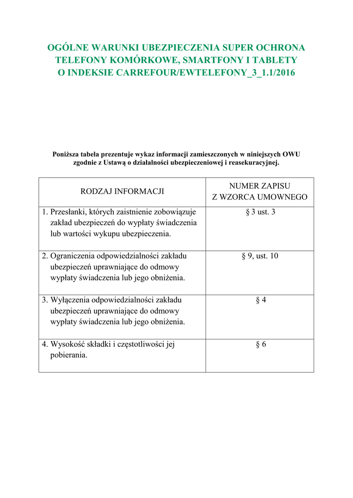 OGÓLNE WARUNKI UBEZPIECZENIA SUPER OCHRONA TELEFONY KOMÓRKOWE, SMARTFONY I TABLETY O INDEKSIE CARREFOUR/EWTELEFONY_3_1.1/2016 Poniższa tabela prezentuje wykaz informacji zamieszczonych w niniejszych OWU zgodnie z Ustawą o działalności ubezpieczeniowej i reasekuracyjnej. RODZAJ INFORMACJI 1. Przesłanki, których zaistnienie zobowiązuje zakład ubezpieczeń do wypłaty świadczenia lub wartości wykupu ubezpieczenia. NUMER ZAPISU Z WZORCA UMOWNEGO § 3 ust. 3 2. Ograniczenia odpowiedzialności zakładu ubezpieczeń uprawniające do odmowy wypłaty świadczenia lub jego obniżenia. § 9, ust. 10 3. Wyłączenia odpowiedzialności zakładu ubezpieczeń uprawniające do odmowy wypłaty świadczenia lub jego obniżenia. §4 4. Wysokość składki i częstotliwości jej pobierania. §6 §1 POSTANOWIENIA OGÓLNE 1. 2. 3. Ogólne Warunki Ubezpieczenia telefonów komórkowych, smartfonów i tabletów (dalej „OWU”) stosuje się w Umowach ubezpieczenia zawieranych pomiędzy Cardif Assurances Risques Divers S.A. Oddział w Polsce, z siedzibą w Warszawie przy pl. Piłsudskiego 2 (dalej: „Ubezpieczyciel) z Ubezpieczającymi, które dotyczą ubezpieczenia telefonów komórkowych, smartfonów i tabletów zakupionych w sieci marketów firmy Carrefour Polska Sp. z o.o. z siedzibą w Warszawie, ulica Targowa 72 (dalej: „Carrefour”). Do realizacji postanowień niniejszych OWU w imieniu i na rzecz Ubezpieczyciela uprawnione jest SPB Polska Sp. z o.o. z siedzibą w Warszawie, ul. Grzybowska 45 (dalej „Centrum Autoryzacji Szkód” lub „CAS”). Do zakresu uprawnień CAS należy: 1) weryfikacja ważności uprawnień wynikających z Umowy ubezpieczenia na warunkach określonych w OWU, 2) przyjmowanie zgłoszenia szkody, 3) przyznawanie lub odmowa odszkodowania wynikającego z Umowy ubezpieczenia w imieniu Ubezpieczyciela, 4) przyjmowanie odstąpień od Umowy ubezpieczenia, 5) przyjmowanie wniosków o zmianę danych osobowych. §2 DEFINICJE Terminom użytym w OWU oraz we wszelkich innych dokumentach składających się na treść Umowy ubezpieczenia nadano następujące znaczenia: 1) Akcesoria dodatkowe: zdefiniowane przez producenta doposażenie niestanowiące kompletu eksploatacyjnego z ubezpieczonym Sprzętem. 2) Cena zakupu: kwota brutto (wraz z podatkiem VAT), za którą Konsumentowi jest oferowany Sprzęt, nieuwzględniająca rabatu przyznanego przez Carrefour . 3) Centrum Autoryzacji Szkód („CAS”): SPB Polska Sp. z o.o. z siedzibą w Warszawie, ul. Grzybowska 45, podmiot współpracujący z Ubezpieczycielem wskazany do kontaktu z Ubezpieczonymi w celu przyjęcia zgłoszenia szkody, przeprowadzenia procesu likwidacji szkody i/lub udzielenia świadczenia według OWU. 4) Karta upominkowa Carrefour: plastikowa karta typu pre-paid lub bon papierowy, wystawiane na okaziciela, o równowartości odpowiadającej Wartości wymiany umożliwiające dokonywanie zakupu towarów z oferty handlowej Carrefour. 5) Konsument: osoba fizyczna dokonująca czynności prawnej niezwiązanej bezpośrednio z jej działalnością gospodarczą lub zawodową, w rozumieniu art. 221 Kodeksu cywilnego. 6) Kradzież: za kradzież rozumie się kradzież z włamaniem, o którym mowa w art. 279 k. k tj. zabór Sprzętu przez sprawcę z zamkniętego budynku, pomieszczenia lub z pojazdu poprzez pokonanie zabezpieczeń przy użyciu siły lub/i narzędzi lub oryginalnym kluczem zdobytym wskutek przestępstwa lub kluczem podrobionym. 7) Materiały eksploatacyjne: materiały zdefiniowane przez producenta jako materiał eksploatacyjny lub zużywająca się część, podlegająca okresowej wymianie, niezbędne do funkcjonowania Sprzętu. 8) Nieszczęśliwy wypadek: nagłe zdarzenie, które nastąpiło w okresie odpowiedzialności Ubezpieczyciela, wywołane wyłącznie i bezpośrednio przyczyną zewnętrzną, przypadkowe, niezależne od woli i stanu zdrowia Ubezpieczonego, polegające na nagłym działaniu mechanicznej siły zewnętrznej, powodującej przerwanie funkcji lub nieprawidłowe funkcjonowanie Sprzętu lub którejkolwiek z jego części, wymagające naprawy w celu przywrócenia prawidłowej funkcjonalności Sprzętu. 9) Osoby bliskie: osoby zamieszkałe na stałe z Ubezpieczającym i prowadzące z nim wspólne gospodarstwo domowe (współmałżonek lub konkubent, wstępni, zstępni, rodzeństwo, teściowie, zięciowie, synowe, przysposabiający i przysposobieni). 10) Osoba składająca Skargę: – Ubezpieczający, Ubezpieczony lub Uprawniony z Umowy Ubezpieczenia. 11) Osoba trzecia: uważa się wszystkie osoby pozostające poza stosunkiem ubezpieczeniowym, niewymienione w pkt 9) powyżej. 12) Rabunek Sprzętu: zabór Sprzętu przez sprawcę poprzez użycie siły lub groźbę użycia siły wobec Użytkownika, noszący znamiona czynu określonego w art. 280 Kodeksu karnego, dokonany względem Użytkownika przez osobę trzecią. 13) Skarga: wystąpienie Osoby składającej Skargę dotyczące jakości usług świadczonych przez Ubezpieczyciela, w tym zawarcia i realizacji Umowy ubezpieczenia lub wykonywanej przez Ubezpieczyciela działalności. Przez Skargę należy również rozumieć reklamację, zażalenie lub odwołanie od decyzji Ubezpieczyciela. 14) Składka: kwota należna Ubezpieczycielowi od Ubezpieczającego z tytułu udzielania ochrony ubezpieczeniowej. 15) Sprzęt: fabrycznie nowy sprzęt zakupiony przez Ubezpieczającego w sieci marketów Carrefour, którego dane figurują we Wnioskopolisie i w dokumencie zakupu potwierdzającym dokonanie opłaty za Sprzęt oraz uiszczenie Składki za jego ubezpieczenie. Ochroną ubezpieczeniową może być objęty Sprzęt, którego Cena zakupu nie przekracza kwoty 4.000 zł. Za Sprzęt uznaje się: telefony komórkowe, smartfony, tablety. 16) Suma ubezpieczenia: kwota będąca podstawą ustalania wysokości świadczenia ubezpieczeniowego w przypadku zajścia zdarzenia ubezpieczeniowego, objętego odpowiedzialnością Ubezpieczyciela, w stosunku do Ubezpieczonego. 17) Sz