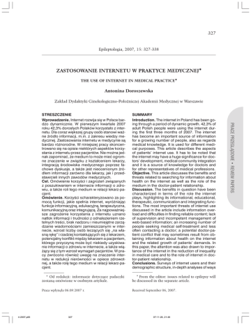 327 Epileptologia, 2007, 15: 327-338 ZASTOSOWANIE INTERNETU W PRAKTYCE MEDYCZNEJ * THE USE OF INTERNET IN MEDICAL PRACTICE * Antonina Doroszewska Zakład Dydaktyki Ginekologiczno-Położniczej Akademii Medycznej w Warszawie SUMMARY Wprowadzenie. Internet rozwija się w Polsce bardzo dynamicznie. W pierwszym kwartale 2007 roku 42,3% dorosłych Polaków korzystało z internetu. Dla coraz większej grupy osób stanowi ważne źródło informacji, m.in. z zakresu wiedzy medycznej. Zastosowania internetu w medycynie są bardzo różnorodne. W niniejszej pracy skoncentrowano się na opisie niektórych aspektów korzystania z internetu przez pacjentów. Nie można jednak zapominać, że medium to może mieć ogromne znaczenie w związku z kształceniem lekarzy, integracją środowiska medycznego poprzez fachowe dyskusje, a także jest nieocenionym źródłem informacji zarówno dla lekarzy, jak i przedstawicieli innych zawodów medycznych. Cel. Omówienie korzyści i zagrożeń związanych z poszukiwaniem w internecie informacji o zdrowiu, a także roli tego medium w relacji lekarz-pacjent. Omówienie. Korzyści scharakteryzowano za pomocą funkcji, jakie spełnia internet, wyróżniając funkcje informacyjną, edukacyjną, terapeutyczna, komunikacyjną oraz integrującą. Za najpoważniejsze zagrożenie korzystania z internetu uznano natłok informacji i trudności z odnalezieniem rzetelnych treści, brak nadzoru i nieumiejętne zarządzanie wiadomościami zamieszczanymi w internecie, wzrost liczby osób leczących się „na własną rękę” i rzadziej kontaktujących się z lekarzem, potencjalny konflikt między lekarzem a pacjentem, którego przyczyną może być niekiedy uzyskiwanie informacji o zdrowiu w internecie, a także wiążący się z tym wzrost wymagań pacjentów. W pracy zwrócono również uwagę na znaczenie internetu w redukcji nierówności w opiece zdrowotnej, a także rolę tego medium w relacji lekarz-pacjent. Introduction. The internet in Poland has been going through a period of dynamic growth. 42,3% of adult Polish people were using the internet during the first three months of 2007. The internet has become an important source of information for a growing number of people, also as regards medical knowledge. It is used for different medical purposes. This article describes the aspects of patients’ internet use. It has to be noted that the internet may have a huge significance for doctors’ development, medical community integration and it is a source of knowledge for doctors and for other representatives of medical professions. Objective. This article discusses the benefits and threats related to searching for information about health on the internet as well as the role of the medium in the doctor-patient relationship. Discussion. The benefits in question have been characterized in terms of the role the internet plays, highlighting its informational, educational, therapeutic, communication and integrating functions. The most important threats of internet use discussed in the article include information overload and difficulties in finding reliable content; lack of supervision and incompetent management of web-based information; an increasing number of people seeking medical self-treatment and less often contacting a doctor; a potential doctor-patient conflict that may sometimes result from obtaining information about health on the internet and the related growth of patients’ demands. In this paper, the attention was also drawn to importance of the internet in the reduction of inequality in medical care and to the role of internet in doctor-patient relationship. Conclusions. Surveys of internet users and their demographic structure, in-depth analyses of ways * Od redakcji: informacje dotyczące padaczki zostaną omówione w osobnym artykule. * From the editor: issues related to epilepsy will be discussed in the separate article. Praca wpłynęła 06.09.2007 r. Received September 06, 2007. 327 07-11-26, 21:48 PRACE PRZEGLĄDOWE • REVIEW PAPERS 4-2007.p65 STRESZCZENIE 328 Antonina Doroszewska Wnioski. Badanie użytkowników internetu, ich struktury demograficznej i dokładna analiza poszukiwania informacji o zdrowiu w internecie, a także znaczenie tego medium w relacji lekarz-pacjent mogą być bardzo pomocne dla przedstawicieli wielu dyscyplin związanych z opieką zdrowotną. PRACE PRZEGLĄDOWE • REVIEW PAPERS Słowa kluczowe: Socjologia medycyny – Internet – Relacja lekarz-pacjent – Komunikacja medyczna – Samokształcenie WPROWADZENIE Z a początek internetu w Polsce uznaje się sierpień 1991 roku, kiedy z naszego kraju została wysłana pierwsza wiadomość elektroniczna. Od tego czasu powstało tysiące stron poświęconych różnorodnej tematyce, oprócz polskich serwisów internauci mają dostęp do milionów zagranicznych. internet to medium, którego możliwości mogą wykorzystywać osoby z różnych grup społecznych, przedstawiciele wszystkich zawodów, dla coraz większej grupy osób stanowi on codzienne narzędzie pracy, nauki i rozrywki. Liczba internautów w Polsce wzrasta z każdym rokiem. W marcu 2002 roku z internetu korzystało 17% dorosłych Polaków. Pięć lat później, w marcu 2007 roku, odsetek ten wzrósł do 37%1, a według innych badań w pierwszym kwartale 2007 roku wyniósł 42,3%2, co w przeliczeniu na liczbę bezwzględną daje 12 mln 479 tys. Polaków. W czerwcu 2007 roku wśród internautów odnotowano nieznaczną przewagę mężczyzn (50,7%), większość stanowią osoby poniżej 40. rż – 70,4% w wieku 15-39 lat, 37,5% w wieku 15-24 lat, a 32,9% 1 Komunikat z badań „Korzystanie z internetu i komputerów”, CBOS, Warszawa kwiecień 2007. 2 Badanie NetTrack SMG/KRC, luty-kwiecień 2007, osoby w wieku 15-75 lat, N = 4547; http:// www.internetstandard.pl/news/113841.html 4-2007.p65 328 information about health is sought on the internet as well as the understanding of the role of that medium in the patient-doctor 