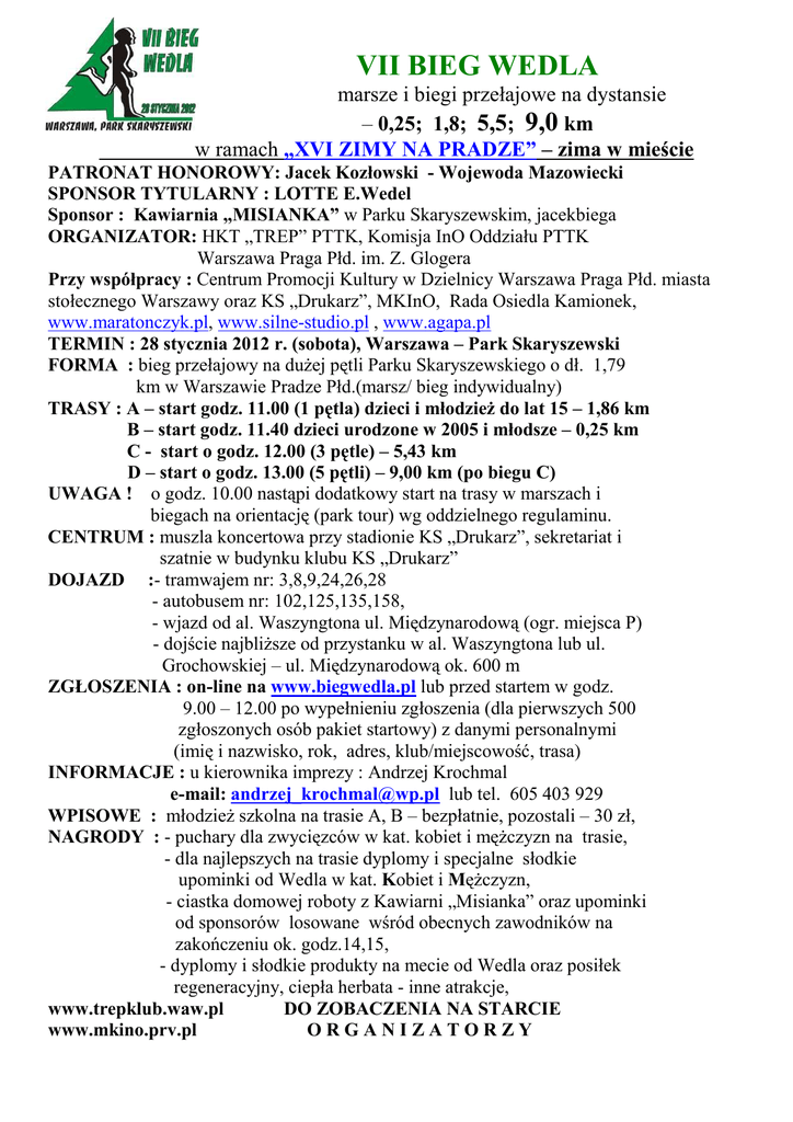 VII BIEG WEDLA marsze i biegi przełajowe na dystansie – 0,25; 1,8; 5,5; 9,0 km w ramach „XVI ZIMY NA PRADZE” – zima w mieście PATRONAT HONOROWY: Jacek Kozłowski - Wojewoda Mazowiecki SPONSOR TYTULARNY : LOTTE E.Wedel Sponsor : Kawiarnia „MISIANKA” w Parku Skaryszewskim, jacekbiega ORGANIZATOR: HKT „TREP” PTTK, Komisja InO Oddziału PTTK Warszawa Praga Płd. im. Z. Glogera Przy współpracy : Centrum Promocji Kultury w Dzielnicy Warszawa Praga Płd. miasta stołecznego Warszawy oraz KS „Drukarz”, MKInO, Rada Osiedla Kamionek, www.maratonczyk.pl, www.silne-studio.pl , www.agapa.pl TERMIN : 28 stycznia 2012 r. (sobota), Warszawa – Park Skaryszewski FORMA : bieg przełajowy na dużej pętli Parku Skaryszewskiego o dł. 1,79 km w Warszawie Pradze Płd.(marsz/ bieg indywidualny) TRASY : A – start godz. 11.00 (1 pętla) dzieci i młodzież do lat 15 – 1,86 km B – start godz. 11.40 dzieci urodzone w 2005 i młodsze – 0,25 km C - start o godz. 12.00 (3 pętle) – 5,43 km D – start o godz. 13.00 (5 pętli) – 9,00 km (po biegu C) UWAGA ! o godz. 10.00 nastąpi dodatkowy start na trasy w marszach i biegach na orientację (park tour) wg oddzielnego regulaminu. CENTRUM : muszla koncertowa przy stadionie KS „Drukarz”, sekretariat i szatnie w budynku klubu KS „Drukarz” DOJAZD :- tramwajem nr: 3,8,9,24,26,28 - autobusem nr: 102,125,135,158, - wjazd od al. Waszyngtona ul. Międzynarodową (ogr. miejsca P) - dojście najbliższe od przystanku w al. Waszyngtona lub ul. Grochowskiej – ul. Międzynarodową ok. 600 m ZGŁOSZENIA : on-line na www.biegwedla.pl lub przed startem w godz. 9.00 – 12.00 po wypełnieniu zgłoszenia (dla pierwszych 500 zgłoszonych osób pakiet startowy) z danymi personalnymi (imię i nazwisko, rok, adres, klub/miejscowość, trasa) INFORMACJE : u kierownika imprezy : Andrzej Krochmal e-mail: [email protected] lub tel. 605 403 929 WPISOWE : młodzież szkolna na trasie A, B – bezpłatnie, pozostali – 30 zł, NAGRODY : - puchary dla zwycięzców w kat. kobiet i mężczyzn na trasie, - dla najlepszych na trasie dyplomy i specjalne słodkie upominki od Wedla w kat. Kobiet i Mężczyzn, - ciastka domowej roboty z Kawiarni „Misianka” oraz upominki od sponsorów losowane wśród obecnych zawodników na zakończeniu ok. godz.14,15, - dyplomy i słodkie produkty na mecie od Wedla oraz posiłek regeneracyjny, ciepła herbata - inne atrakcje, www.trepklub.waw.pl DO ZOBACZENIA NA STARCIE www.mkino.prv.pl ORGANIZATORZY