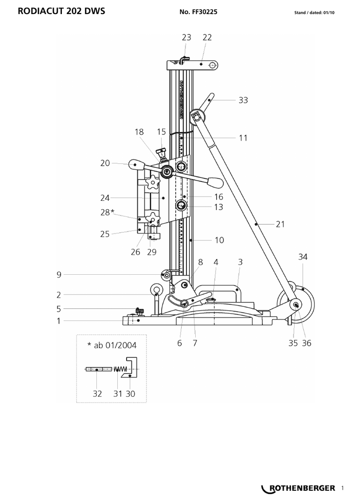 RODIACUT 202 DWS No. FF30225 Stand / dated: 01/10 1 RODIACUT 202 DWS Nr. / No. 1 2 3 4 5 6 7 8 9 10 11 13 15 16 18 20 21 22 23 24 25 26 28 29 30 31 32 33 34 35 36 WICHTIG! No. FF30225 Stand / dated: 01/10 Bezeichnung Bodenplatte Ösenschraube M10 Bügelgriff mit 2 Schrauben M6x30 Entlüftungsventil kpl. (Bodenplatte) Bohrloch-Mittenanzeiger kpl. Stellschraube Kipp-Klemmhebel M10 Achse für Säule kpl. Mit Mutter Tiefenanschlag kpl. Profil-Säule inkl. Libelle Maßlineal Justierset für Führungsleisten Arretierbolzen für Ritzelwelle Führungsleiste (Paar) inkl. Buchsen Ritzelwelle mit 2 Lagerbuchsen Description Ground plate Adjustment screw M10 Handle with 2 screws M6x30 Ventilation valve compl. (ground plate) Center hole indicator compl. Set screw Clamping lever M10 Axle compl. with nut for column Depth stop compl. Column incl. spirit-level Drilling depth indicator Adjustment set for guides Lock bolt for pinion shaft Guide (pair) incl. bushings Pinion shaft with 2 bushings Menge /QTY. 1 4 1 1 1 1 1 1 1 1 1 1 1 1 1 Art.-Nr / No. H8.2821P FF50803 F8.2930 F8.2931 H8.2802 F8.5114 H8.7997 F8.2932 F8.5109 F8.5159 F8.5310 F8.2936 F8.5141 F8.2935 F8.2937 Vorschubhebel kpl. Abstützung kpl. Mit Rollen Tragegriff inkl. 4 Schrauben M4x25 Inbusschlüssel 6 DIN 911 Vorschubeinheit (Gussteil) inkl. Libellen Schwalbenschwanzplatte Sterngriff Klemmstück (bis 12/2003) Anschlag D= 32mm (bis 12/2003) Anschlag D= 40mm (ab 01/2004) Klemmstück (ab 01/2004) Druckfeder (ab 01/2004) Stiftschraube M8x35 (ab 01/2004) Kipp- Klemmhebel Transportrad D= 100mm Achse Sicherungsscheibe 9 DIN 6799 Feed lever cpl. Support compl. With pulley Carrying handle incl. 4 screws M4x25 Wrench 6 DIN 911 Guiding device (casting) incl. spirit-level Mounting plate Star knob Clamping piece (until 12/2003) Stop D= 32mm (until 12/2003) Stop D= 40mm (since 01/2004) Clamping piece (since 01/2004) Spring (since 01/2004) Stud bolt M8x35 (since 01/2004) Clamping lever Wheel D= 100mm Axis Lock washer 9 DIN 6799 1 1 1 1 1 1 2 2 1 1 2 2 2 1 2 1 2 FF50863 H8.2827 F8.2939 32.1216 FF57046 FF35000 FF57049 FF57047 FF57048 H8.1301 FF54048 FF54046 FF54043 FF54047 H8.2809 H8.2803 H8.2810 Um die Sicherheit und Zuverlässigkeit des Produktes zu erhalten, dürfen Reparaturen, Überholungs- und Einstellarbeiten nur von ROTHENBERGER, Kelkheim oder autorisierten Service-Werkstätten ausgeführt werden. Verwenden Sie nur Original-Ersatzteile. Bestellen Sie Ihre Zubehör und Ersatzteile bei Ihrem Fachhändler oder bei unserer Hotline Service After Sales Tel. +49 6195 99 52 14 Fax: +49 6195 99 52 15 IMPORTANT! To assure safety and reliability, repairs, maintenance and adjustment must be performed by ROTHENBERGER Kelkheim, or authorized Service-Centers. Always use Original-Service-Parts. Order your accessories and spare parts from your specialist retailer or using our Service After Sales hotline Tel. +49 6195 99 52 14 2 Fax: +49 6195 99 52 15