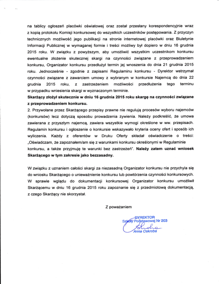 na tablicy ogłoszeń placówki oświatowej oraz został pzesłany korespondencyjnie wraz z kopią protokołu Komisji konkursowej do wszystkich uczestników postępowania. Z pżyczyn technicznych możliwośćjego publikacji na stronie internetowej placówki oraz Biuletynie lnformacji Publicznej w wymaganej formie i treścimozliwy był dopiero w dniu 16 grudnia 2015 roku. W związku z powyższym, aby umożliwić wszystkim uczestnikom konkursu ewentualne złożenieskutecznej skargi na czynnościzwiązane z pzeprowadzeniem konkursu, Organizator konkursu przedłużyłtermin jej wnoszenia do dnia 21 grudnia 2015 roku, Jednocześnie - zgodnie z zapisami Regulaminu konkursu - Dyrektor wstzymał z zawarciem umowy z wybranym w konkursie Najemcą do grudnia 2015 roku, z zastrzeżeniem możliwościprzedłużeniatego czynnościzwiązane dnia 22 terminu w pzypadku wniesienia skargi w Wznaczonym terminie. Skażący złożyłskutecznie w dniu 16 grudnia 2015 roku skargę na czynności związane z pzeprowadzeniem konkursu. 2. Pzywołane pżez Skażącego pzepisy prawne nie regulują procesów wyboru najemców (konkursów) lecz dotyczą sposobu prowadzenia żywienia, Należy podkreślić,że umowa zawierana z przyszĘm najemcą, zawiera wszystkie wymogi określonew vvw. pzepisach. Regulamin konkursu i ogłoszenie o konkursie wskazywało kryteria oceny ofeń i sposób ich wyliczenia. Każdy z oferentów w Druku Ofeńy składałoświadczenie o treŚci: ,,Oświadczam, że zapoznałemlam się z warunkami konkursu określonymi w Regulaminie konkursu, a także pzyjmuję te warunki bez zastrzeżeń". Należy zatem uznać wniosek Skaźącego w tym zakresie jako bezzasadny. W związku z uznaniem całościskargi za niezasadną Organizator konkursu nie przychyla się do wniosku Skażącego o unieważnienie konkursu lub poMórzenia czynności konkursowych. W sprawie wglądu do dokumentacji konkursowej Organizator konkursu umożliwił Skażącemu w dniu ,l6 grudnia 2015 roku zapoznanie się z pzedmiotową dokumentacją, z czego Skażący nie skozystał, Z poważaniem sĘwowej Nr203