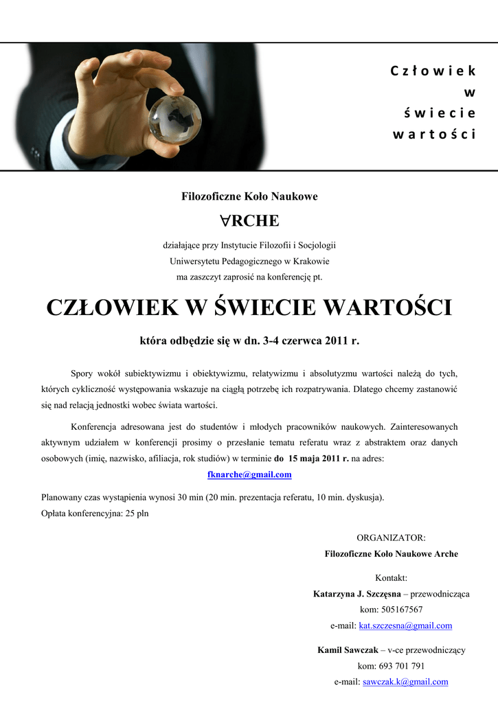 Człowiek w świecie wartości Filozoficzne Koło Naukowe RCHE działające przy Instytucie Filozofii i Socjologii Uniwersytetu Pedagogicznego w Krakowie ma zaszczyt zaprosić na konferencję pt. CZŁOWIEK W ŚWIECIE WARTOŚCI która odbędzie się w dn. 3-4 czerwca 2011 r. Spory wokół subiektywizmu i obiektywizmu, relatywizmu i absolutyzmu wartości należą do tych, których cykliczność występowania wskazuje na ciągłą potrzebę ich rozpatrywania. Dlatego chcemy zastanowić się nad relacją jednostki wobec świata wartości. Konferencja adresowana jest do studentów i młodych pracowników naukowych. Zainteresowanych aktywnym udziałem w konferencji prosimy o przesłanie tematu referatu wraz z abstraktem oraz danych osobowych (imię, nazwisko, afiliacja, rok studiów) w terminie do 15 maja 2011 r. na adres: [email protected] Planowany czas wystąpienia wynosi 30 min (20 min. prezentacja referatu, 10 min. dyskusja). Opłata konferencyjna: 25 pln ORGANIZATOR: Filozoficzne Koło Naukowe Arche Kontakt: Katarzyna J. Szczęsna – przewodnicząca kom: 505167567 e-mail: [email protected] Kamil Sawczak – v-ce przewodniczący kom: 693 701 791 e-mail: [email protected]