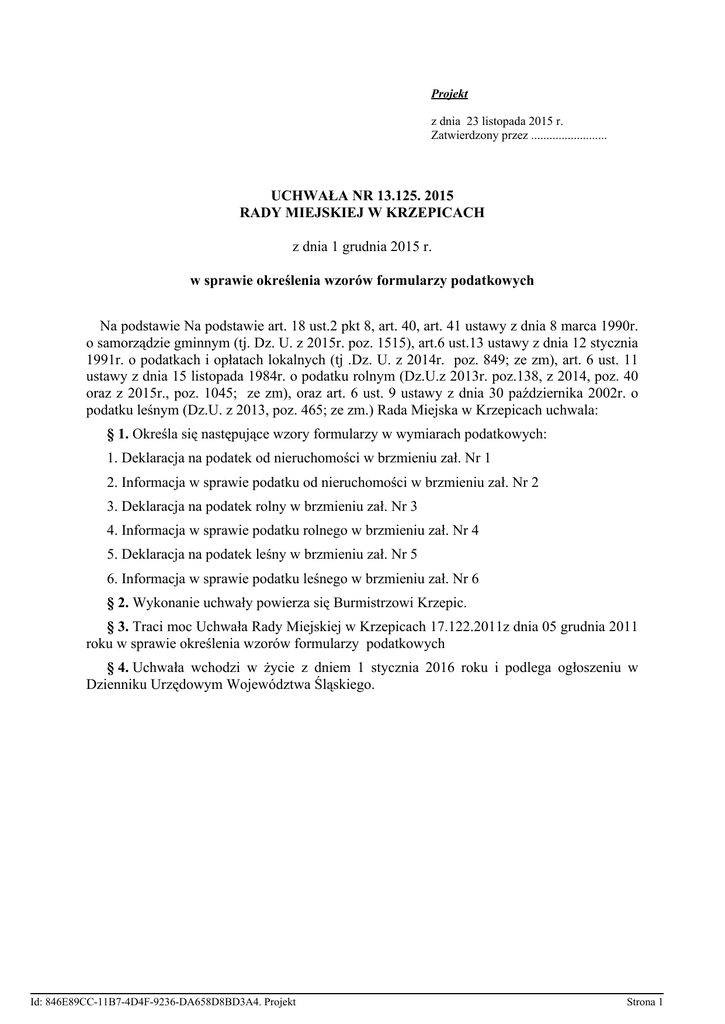Projekt z dnia 23 listopada 2015 r. Zatwierdzony przez ......................... UCHWAŁA NR 13.125. 2015 RADY MIEJSKIEJ W KRZEPICACH z dnia 1 grudnia 2015 r. w sprawie określenia wzorów formularzy podatkowych Na podstawie Na podstawie art. 18 ust.2 pkt 8, art. 40, art. 41 ustawy z dnia 8 marca 1990r. o samorządzie gminnym (tj. Dz. U. z 2015r. poz. 1515), art.6 ust.13 ustawy z dnia 12 stycznia 1991r. o podatkach i opłatach lokalnych (tj .Dz. U. z 2014r. poz. 849; ze zm), art. 6 ust. 11 ustawy z dnia 15 listopada 1984r. o podatku rolnym (Dz.U.z 2013r. poz.138, z 2014, poz. 40 oraz z 2015r., poz. 1045; ze zm), oraz art. 6 ust. 9 ustawy z dnia 30 października 2002r. o podatku leśnym (Dz.U. z 2013, poz. 465; ze zm.) Rada Miejska w Krzepicach uchwala: § 1. Określa się następujące wzory formularzy w wymiarach podatkowych: 1. Deklaracja na podatek od nieruchomości w brzmieniu zał. Nr 1 2. Informacja w sprawie podatku od nieruchomości w brzmieniu zał. Nr 2 3. Deklaracja na podatek rolny w brzmieniu zał. Nr 3 4. Informacja w sprawie podatku rolnego w brzmieniu zał. Nr 4 5. Deklaracja na podatek leśny w brzmieniu zał. Nr 5 6. Informacja w sprawie podatku leśnego w brzmieniu zał. Nr 6 § 2. Wykonanie uchwały powierza się Burmistrzowi Krzepic. § 3. Traci moc Uchwała Rady Miejskiej w Krzepicach 17.122.2011z dnia 05 grudnia 2011 roku w sprawie określenia wzorów formularzy podatkowych § 4. Uchwała wchodzi w życie z dniem 1 stycznia 2016 roku i podlega ogłoszeniu w Dzienniku Urzędowym Województwa Śląskiego. Id: 846E89CC-11B7-4D4F-9236-DA658D8BD3A4. Projekt Strona 1