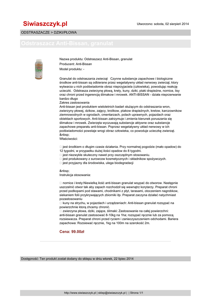 Siwiaszczyk.pl Utworzono: sobota, 02 sierpień 2014 ODSTRASZACZE > DZIKI/PŁOWA Odstraszacz Anti-Bissan, granulat Nazwa produktu: Odstraszacz Anti-Bissan, granulat Producent: Anti-Bissan Model produktu: Granulat do odstraszania zwierząt Czynne substancje zapachowe i biologiczne środkow anti-bissan są odbierane przez wegetatywny układ nerwowy zwierząt, ktory wytwarza u nich podświadomie obraz nieprzyjaciela (człowieka), powodując reakcję ucieczki. Odstrasza zwierzynę płową, krety, kuny, dziki, ptaki drapieżne, nornice, lisy oraz chroni przed ingerencją ślimakow i mrowek. ANTI-BISSAN - działa nieprzerwanie bardzo długo Zakres zastosowania Anti-bissan jest produktem wieloletnich badań służącym do odstraszania wron, zwierzyny płowej, dzikow, zajęcy, krolikow, ptakow drapieżnych, kretow, karczownikow ziemnowodnych w ogrodach, cmentarzach, polach uprawnych, pojazdach oraz obiektach sportowych. Anti-bissan zatrzymuje i zmienia kierunek poruszania się ślimakow i mrowek. Zwierzęta wyczuwają substancje aktywne oraz substancje zapachowe preparatu anti-bissan. Poprzez wegetatywny układ nerwowy w ich podświadomości powstaje wrogi obraz człowieka, co powoduje ucieczkę zwierząt. Właściwości: jest środkiem o długim czasie działania. Przy normalnej pogodzie (mało opadow) do 12 tygodni, w przypadku dużej ilości opadow do 8 tygodni. jest niezwykle skuteczny nawet przy oszczędnym stosowaniu. jest produkowany z surowcow kosmetycznych i składnikow spożywczych. jest przyjazny dla środowiska, ulega biodegradacji Instrukcja stosowania: nornice i krety:Niewielką ilość anti-bissan granulat wsypać do otworow. Następnie uszczelnić otwor tak aby zapach rozchodził się wewnątrz korytarzy. Preparat chroni przed podkopami pod stawami, chodnikami z płyt, tarasami, otoczeniem nagrobkow, siekaniem folii przykrywających zbiorniki itp. Preparat zaczyna działać natychmiast pozastosowaniu kuny na strychu, w pojazdach i urządzeniach: Anti-bissan granulat rozsypać na powierzchnie ktorą chcemy chronić. zwierzyna płowa, dziki, zające, ślimaki: Zastosowanie na całej powierzchni: anti-bissan granulat zastosować 8-10kg na 1ha; rozsypać ręcznie lub za pomocą rozsiewacza. Preparat chroni przed ryciem i zanieczyszczeniem odchodami. Bariera zapachowa: Rozsiewać ręcznie, 1kg na 100m na szerokość 2m. Cena: 99.00zł Dostępność: Ten produkt został dodany do sklepu w dniu wtorek, 22 lipiec 2014 http://www.siwiaszczyk.pl | [email protected] | | Strona 1/1