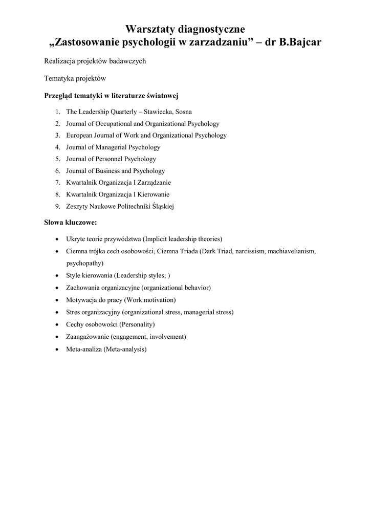 Warsztaty diagnostyczne „Zastosowanie psychologii w zarzadzaniu” – dr B.Bajcar Realizacja projektów badawczych Tematyka projektów Przegląd tematyki w literaturze światowej 1. The Leadership Quarterly – Stawiecka, Sosna 2. Journal of Occupational and Organizational Psychology 3. European Journal of Work and Organizational Psychology 4. Journal of Managerial Psychology 5. Journal of Personnel Psychology 6. Journal of Business and Psychology 7. Kwartalnik Organizacja I Zarządzanie 8. Kwartalnik Organizacja I Kierowanie 9. Zeszyty Naukowe Politechniki Śląskiej Słowa kluczowe: Ukryte teorie przywództwa (Implicit leadership theories) Ciemna trójka cech osobowości, Ciemna Triada (Dark Triad, narcissism, machiavelianism, psychopathy) Style kierowania (Leadership styles; ) Zachowania organizacyjne (organizational behavior) Motywacja do pracy (Work motivation) Stres organizacyjny (organizational stress, managerial stress) Cechy osobowości (Personality) Zaangażowanie (engagement, involvement) Meta-analiza (Meta-analysis)