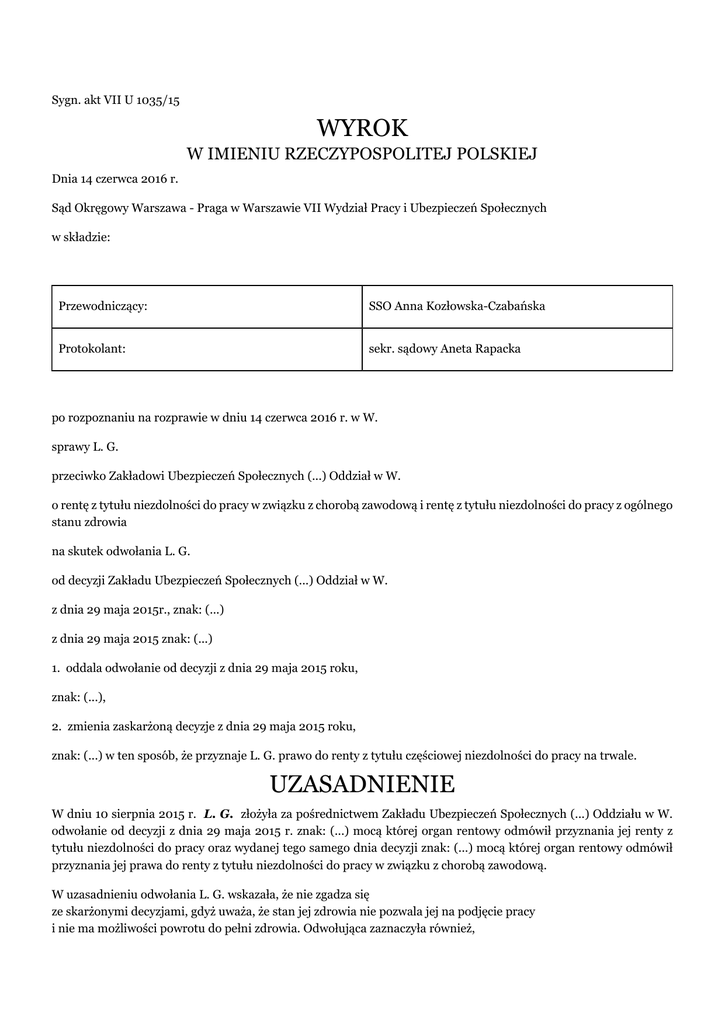 Sygn. akt VII U 1035/15 WYROK W IMIENIU RZECZYPOSPOLITEJ POLSKIEJ Dnia 14 czerwca 2016 r. Sąd Okręgowy Warszawa - Praga w Warszawie VII Wydział Pracy i Ubezpieczeń Społecznych w składzie: Przewodniczący: SSO Anna Kozłowska-Czabańska Protokolant: sekr. sądowy Aneta Rapacka po rozpoznaniu na rozprawie w dniu 14 czerwca 2016 r. w W. sprawy L. G. przeciwko Zakładowi Ubezpieczeń Społecznych (...) Oddział w W. o rentę z tytułu niezdolności do pracy w związku z chorobą zawodową i rentę z tytułu niezdolności do pracy z ogólnego stanu zdrowia na skutek odwołania L. G. od decyzji Zakładu Ubezpieczeń Społecznych (...) Oddział w W. z dnia 29 maja 2015r., znak: (...) z dnia 29 maja 2015 znak: (...) 1. oddala odwołanie od decyzji z dnia 29 maja 2015 roku, znak: (...), 2. zmienia zaskarżoną decyzje z dnia 29 maja 2015 roku, znak: (...) w ten sposób, że przyznaje L. G. prawo do renty z tytułu częściowej niezdolności do pracy na trwale. UZASADNIENIE W dniu 10 sierpnia 2015 r. L. G. złożyła za pośrednictwem Zakładu Ubezpieczeń Społecznych (...) Oddziału w W. odwołanie od decyzji z dnia 29 maja 2015 r. znak: (...) mocą której organ rentowy odmówił przyznania jej renty z tytułu niezdolności do pracy oraz wydanej tego samego dnia decyzji znak: (...) mocą której organ rentowy odmówił przyznania jej prawa do renty z tytułu niezdolności do pracy w związku z chorobą zawodową. W uzasadnieniu odwołania L. G. wskazała, że nie zgadza się ze skarżonymi decyzjami, gdyż uważa, że stan jej zdrowia nie pozwala jej na podjęcie pracy i nie ma możliwości powrotu do pełni zdrowia. Odwołująca zaznaczyła również, że ze względu na chorobę która powstała w trakcie zatrudnienia nie może podjąć pracy. Ostatecznie wniosła o ponowne wykonanie badań i stwierdzenie niezdolności do pracy z ogólnego stanu zdrowia oraz w związku z chorobą zawodową. W odpowiedzi na odwołanie z dnia 9 lipca 2015 r. Zakład Ubezpieczeń Społecznych (...) Oddział w W. wniósł o oddalenie odwołania L. G. na podstawie art. 47714 § 1 k.p.c. Uzasadniając swoje stanowisko w sprawie organ rentowy wskazał, że odwołująca pobierała rentę z tytułu częściowej niezdolności pracy, które to świadczenie przysługiwało jej do 31 marca 2015 r. na mocy wyroku tutejszego Sądu Okręgowego z dnia 15 stycznia 2015 r. zapadłego w sprawie o sygn. akt VII U 1350/13, jak również rentę z tytułu częściowej niezdolności do pracy w związku z chorobą zawodową, które to świadczenie również przysługiwało jej do 31 marca 2015 r. na mocy wyroku tutejszego Sądu Okręgowego z dnia 15 stycznia 2015 r. zapadłego w sprawie o sygn. akt VII U 2158/14. W związku ze złożonymi przez odwołującą wnioskami o ponowne ustalenie prawa do renty z tytułu niezdolności do pracy oraz o ponowne ustalenie prawa do renty z tytułu niezdolności do pracy w związku z chorobą zawodową (odpowiednio z dnia 24 i 26 marca 2015 r.) odwołująca została skierowana na badania do lekarza orzecznika ZUS, a po wniesieniu sprzeciwu od orzeczenia wydanego przez lekarza orzecznika do komisji lekarskiej ZUS, która orzeczeniem z dnia 27 maja 2015 r. uznała odwołującą za zdolną do pracy. Mając na względzie treść art. 102 ust. 1, art. 107 oraz art. 61 w zw. z art. 57 ust. 1 pkt 1 ustawy o emeryturach i rentach z Funduszu Ubezpieczeń Społecznych organ rentowy oparł swoje rozstrzygnięcie na orzeczeniu komisji lekarskiej i odmówił odwołującej prawa do renty z tytułu niezdolności pracy. Z kolei na podstawie art. 6 ust. 1 pkt 6 i art. 17 ust. 1 ustawy o ubezpieczeniu społecznym z tytułu wypadków przy pracy i chorób zawodowych oraz art. 14 ustawy emerytalnej organ rentowy oparł swoje rozstrzygnięcie na orzeczeniu komisji lekarskiej i odmówił odwołującej prawa do renty z tytułu niezdolności pracy w związku z chorobą zawodową. Wobec wskazanych okoliczności organ rentowy uznał skarżone decyzje za prawidłowe i zgodne z prawem. Sąd Okręgowy ustalił następujący stan faktyczny: L. G., urodzona w dniu (...), jest z zawodu fryzjerką. Zawód ten był przez odwołującą wykonywany z niewielkimi przerwami na przełomie lat 1976 – 2007 (karty wynagrodzenia k. 3 i 5 tom III a.r., świadectwo pracy k. 7-9 t. III a.r. – okoliczność bezsporna). Odwołująca pobierała rentę z tytułu częściowej niezdolności do pracy w okresie od 1 lutego 2013 r. do 31 marca 2015 r. oraz z tytułu częściowej niezdolności do pracy w związku z chorobą zawodową – w tym samym okresie (decyzja ZUS z 20.03.2015 r. k. 177 tom III a.r., wyrok Sądu Okręgowego Warszawa-Praga w Warszawie z dnia 8 marca 2013 r. sygn. akt VII U 456/12 k. 71 a.r. tom II, wniosek o wydanie orzeczenia k. 84 tom II a.r. – okoliczność bezsporna). W dniu 24 marca 2015 r. L. G. złożyła do Zakładu Ubezpieczeń Społecznych wniosek o ponowne ustalenie prawa do renty z tytułu niezdolności do pracy. Z kolei w dniu 26 marca 2015 r. L. G. złożyła wniosek o ponowne ustalenie prawa do renty z tytułu niezdolności do pracy w związku z chorobą zawodową (wniosek z 24.03.2015 r. k. 123 tom III a.r.). W toku postępowania wyjaśniającego przed organem rentowym odwołująca została skierowana na badanie do komisji lekarskiej ZUS, która orzeczeniem z dnia 27 maja 2015 r. uznała, że odwołująca nie jest niezdolna do pracy ani z ogólnego stanu zdrowia ani w związku z chorobą zawodową. W oparciu o to orzeczenie Zakład Ubezpieczeń Społecznych (...) Oddział w W. wydał w dniu 29 maja 2015 r. obie skarżone decyzje znak: (...), mocą której odmówił przyznania odwołującej prawa do renty z tytułu niezdolności do pracy oraz znak: (...), mocą której odmówił przyznania odwołującej prawa do renty z tytułu niezdolności do pracy w związku z chorobą zawodową (orzeczenie komisji lekarskiej ZUS z 27.05.2015 r. k. 88 i 89 tom II a.r. i k. 136 i 136v tom III a.r., skarżone decyzje ZUS z 2