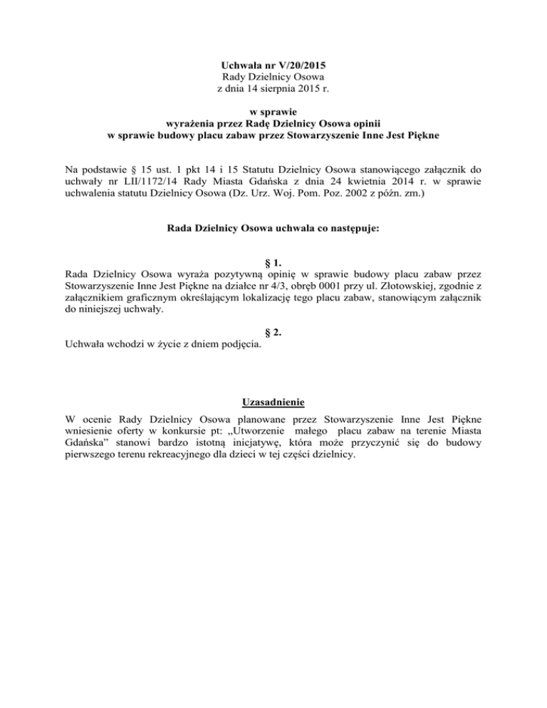 Uchwała nr V/20/2015 Rady Dzielnicy Osowa z dnia 14 sierpnia 2015 r. w sprawie wyrażenia przez Radę Dzielnicy Osowa opinii w sprawie budowy placu zabaw przez Stowarzyszenie Inne Jest Piękne Na podstawie § 15 ust. 1 pkt 14 i 15 Statutu Dzielnicy Osowa stanowiącego załącznik do uchwały nr LII/1172/14 Rady Miasta Gdańska z dnia 24 kwietnia 2014 r. w sprawie uchwalenia statutu Dzielnicy Osowa (Dz. Urz. Woj. Pom. Poz. 2002 z późn. zm.) Rada Dzielnicy Osowa uchwala co następuje: § 1. Rada Dzielnicy Osowa wyraża pozytywną opinię w sprawie budowy placu zabaw przez Stowarzyszenie Inne Jest Piękne na działce nr 4/3, obręb 0001 przy ul. Złotowskiej, zgodnie z załącznikiem graficznym określającym lokalizację tego placu zabaw, stanowiącym załącznik do niniejszej uchwały. § 2. Uchwała wchodzi w życie z dniem podjęcia. Uzasadnienie W ocenie Rady Dzielnicy Osowa planowane przez Stowarzyszenie Inne Jest Piękne wniesienie oferty w konkursie pt: „Utworzenie małego placu zabaw na terenie Miasta Gdańska” stanowi bardzo istotną inicjatywę, która może przyczynić się do budowy pierwszego terenu rekreacyjnego dla dzieci w tej części dzielnicy.