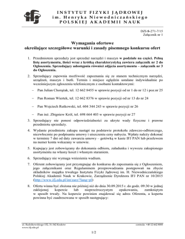 INSTYTUT FIZYKI JĄDROWEJ im. Henryka Niewodniczańskiego POLSKIEJ AKADEMII NAUK DZI-S-271-7/15 Załącznik nr 1 Wymagania ofertowe określające szczegółowe warunki i zasady pisemnego konkursu ofert 1. Przedmiotem sprzedaży jest sprzedaż narzędzi i maszyn w podziale na części. Pełną listę asortymentu, ilości wraz z krótką charakterystyką zawiera załącznik nr 2 do Ogłoszenia. Sprzedający udostępnia również zdjęcia asortymentu – załącznik nr 3 do Ogłoszenia. 2. Sprzedający zapewnia możliwość zapoznania się ze stanem technicznym narzędzi, urządzeń, maszyn i butli. Termin i miejsce oględzin ustalane indywidualnie po wcześniejszym zgłoszeniu telefonicznym z osobami kontaktowymi: Pan Julian Chorążak, tel. 12 662 8455 w sprawie pozycji od nr 1 do nr 12 i poz.nr 25 Pan Roman Wiertek, tel. 12 662 8376 w sprawie pozycji od nr 13 do nr 24 Pan Wojciech Rutkowski, tel. 604 344 243 w sprawie pozycji nr 26 Pan inż. Zbigniew Król, tel. 698 664 403 w sprawie pozycji nr 27 3. Sprzedający nie ponosi odpowiedzialności za ukryte wady fizyczne i prawne przedmiotu sprzedaży. 4. Wydanie przedmiotu zakupu nastąpi na podstawie protokołu zdawczo-odbiorczego, niezwłocznie po podpisaniu umowy i uiszczeniu ceny nabycia. Wpłaty należy dokonać w terminie 7 dni od daty zawarcia umowy – gotówką w kasie IFJ PAN lub przelewem na numer konta wskazany w umowie. 5. Kupujący jest zobowiązany do dokonania odbioru, załadunku i wywozu zakupionego asortymentu na własny koszt i własnym staraniem. 6. Sprzedający nie wymaga wniesienia wadium. 7. Oferent zobowiązany jest przystępując do konkursu do zapoznania się z Ogłoszeniem, jego załącznikami oraz Regulaminem przeprowadzania postępowań na zbycie składników majątku trwałego Instytutu Fizyki Jądrowej im. H. Niewodniczańskiego Polskiej Akademii Nauk w Krakowie, Zarządzenie Dyrektora IFJ PAN nr 10/2015 (http://www.ifj.edu.pl/int/zarz/?lang=pl) 8. Oferta winna być złożona nie później niż do dnia 30.09.2015 r. do godz. 09:30 w jednej zaklejonej kopercie lub nieprzeźroczystym opakowaniu, zamkniętym w sposób trwały. Na kopercie powinien znajdować się adres Oferenta, a koperta powinna być zaadresowana w sposób następujący: ul. Radzikowskiego 152, 31-342 Kraków www.ifj.edu.pl centrala: +48 12 662 8000 1/2 INSTYTUT FIZYKI JĄDROWEJ im. Henryka Niewodniczańskiego POLSKIEJ AKADEMII NAUK Nazwa i adres Oferenta do korespondencji Instytut Fizyki Jądrowej im. Henryka Niewodniczańskiego Polskiej Akademii Nauk, ul. Radzikowskiego 152 31-342 Kraków Oferta na sprzedaż narzędzi i maszyn Znak sprawy: DZI-S-271-7/15 Nie otwierać przed 30.09.2015 roku godz. 10:00 9. Oferta musi być sporządzona w formie pisemnej w języku polskim. 10. Oferent może złożyć tylko jedną ofertę. Sprzedający dopuszcza złożenie ofert częściowych na wybrany/wybrane asortyment/y. 11. Każda strona oferty winna być ponumerowana i zaparafowana. 12. Oferta musi zawierać propozycję ceny wg formuły określonej przez Oferenta. 13. Do oferty należy dołączyć: wypełniony formularz oferty – załącznik nr 4, podpisane oświadczenie uczestnika konkursu – załącznik nr 5 oraz zaakceptowany wzór umowy – załącznik nr 6. 14. Oferenci mogą uczestniczyć w sesji otwarcia ofert. 15. W przypadku, gdy dwie (lub więcej) najlepsze ofert z najwyższą ceną będą zawierały cenę taką samą Oferenci zostaną wezwani do uczestniczenia w postępowaniu ustnym (licytacja). 16. Zostają odrzucone oferty zawierające cenę wywoławczą niższą od minimalnej, złożone po terminie, nieczytelne, niekompletne lub budzące wątpliwość, której wyjaśnienie mogłoby stanowić nową ofertę. Brak obecności Oferenta w postępowaniu ustnym (licytacji ) w przypadku, gdy dwie (lub więcej) najlepsze oferty z najwyższą ceną będą zawierały cenę taką samą skutkuje odrzuceniem jego oferty. 17. Informacja o wyniku konkursu zawierającą nazwę Oferenta i zaproponowaną cenę lub o unieważnieniu konkursu zostanie udostępniona na stronie internetowej Sprzedającego. 18. Do zawarcia umowy z Oferentem, który wygrał konkurs dojdzie w terminie do 10 dni od ogłoszenia wyniku konkursu. 19. Sprzedający zastrzega, że przysługuje mu prawo unieważnienia postępowania bez podania przyczyn. ul. Radzikowskiego 152, 31-342 Kraków www.ifj.edu.pl centrala: +48 12 662 8000 2/2
