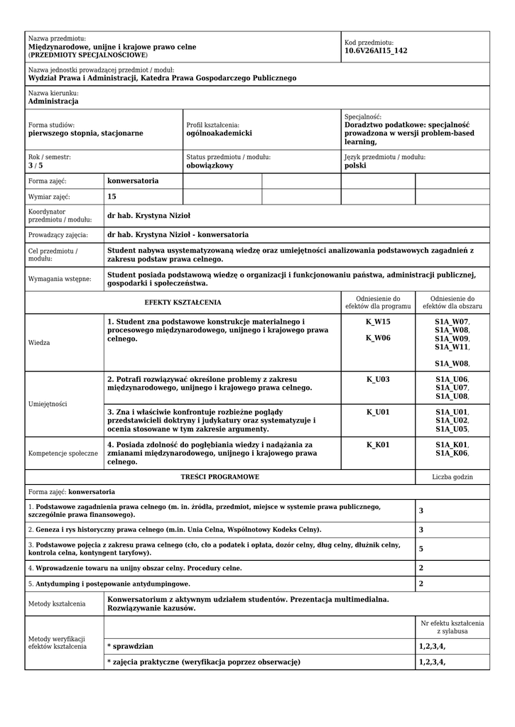Nazwa przedmiotu: Międzynarodowe, unijne i krajowe prawo celne (PRZEDMIOTY SPECJALNOŚCIOWE) Kod przedmiotu: 10.6V26AI15_142 Nazwa jednostki prowadzącej przedmiot / moduł: Wydział Prawa i Administracji, Katedra Prawa Gospodarczego Publicznego Nazwa kierunku: Administracja Specjalność: Forma studiów: Profil kształcenia: pierwszego stopnia, stacjonarne ogólnoakademicki Doradztwo podatkowe: specjalność prowadzona w wersji problem-based learning, Rok / semestr: 3/5 Status przedmiotu / modułu: Język przedmiotu / modułu: obowiązkowy polski Forma zajęć: konwersatoria Wymiar zajęć: 15 Koordynator przedmiotu / modułu: dr hab. Krystyna Nizioł Prowadzący zajęcia: dr hab. Krystyna Nizioł - konwersatoria Cel przedmiotu / modułu: Student nabywa usystematyzowaną wiedzę oraz umiejętności analizowania podstawowych zagadnień z zakresu podstaw prawa celnego. Wymagania wstępne: Student posiada podstawową wiedzę o organizacji i funkcjonowaniu państwa, administracji publicznej, gospodarki i społeczeństwa. EFEKTY KSZTAŁCENIA Wiedza 1. Student zna podstawowe konstrukcje materialnego i procesowego międzynarodowego, unijnego i krajowego prawa celnego. Odniesienie do efektów dla programu Odniesienie do efektów dla obszaru K_W15 S1A_W07, S1A_W08, S1A_W09, S1A_W11, K_W06 S1A_W08, Umiejętności Kompetencje społeczne 2. Potrafi rozwiązywać określone problemy z zakresu międzynarodowego, unijnego i krajowego prawa celnego. K_U03 S1A_U06, S1A_U07, S1A_U08, 3. Zna i właściwie konfrontuje rozbieżne poglądy przedstawicieli doktryny i judykatury oraz systematyzuje i ocenia stosowane w tym zakresie argumenty. K_U01 S1A_U01, S1A_U02, S1A_U05, 4. Posiada zdolność do pogłębiania wiedzy i nadążania za zmianami międzynarodowego, unijnego i krajowego prawa celnego. K_K01 S1A_K01, S1A_K06, TREŚCI PROGRAMOWE Liczba godzin Forma zajęć: konwersatoria 1. Podstawowe zagadnienia prawa celnego (m. in. żródła, przedmiot, miejsce w systemie prawa publicznego, szczególnie prawa finansowego). 3 2. Geneza i rys historyczny prawa celnego (m.in. Unia Celna, Wspólnotowy Kodeks Celny). 3 3. Podstawowe pojęcia z zakresu prawa celnego (cło, cło a podatek i opłata, dozór celny, dług celny, dłużnik celny, kontrola celna, kontyngent taryfowy). 5 4. Wprowadzenie towaru na unijny obszar celny. Procedury celne. 2 5. Antydumping i postępowanie antydumpingowe. 2 Metody kształcenia Konwersatorium z aktywnym udziałem studentów. Prezentacja multimedialna. Rozwiązywanie kazusów. Nr efektu kształcenia z sylabusa Metody weryfikacji efektów kształcenia * sprawdzian 1,2,3,4, * zajęcia praktyczne (weryfikacja poprzez obserwację) 1,2,3,4, Forma i warunki zaliczenia Zaliczenie z oceną. Forma zaliczenia: sprawdzian pisemny - polegający na odpowiedzi na trzy pytania otwarte. Warunkiem zaliczenia jest uzyskanie ze sprawdzianu co najmniej 16 pkt. Student może otrzymać za każde z pytań otwartych po 10 pkt. Ocena końcowa z przedmiotu (łączna liczba punktów uzyskanych przez studenta ze sprawdzianu): 28-30 pkt - ocena bardzo dobra, 25-27 pkt - ocena dobry plus, 22-24 pkt - ocena dobra, 19-21 pkt - ocena dostateczna plus, 16-18 pkt - ocena dostateczna, 15 pkt i mniej - ocena niedostateczna. Literatura podstawowa Stanisławiszyn P., Nowak T. (red.) (2012): Regulacje w zakresie prawa celnego i podatku akcyzowego po przystąpieniu Polski do Unii Europejskiej. Doświadczenia i perspektywy. LEX a Wolters Kluwer business Literatura uzupełniająca Lasiński-Sulecki K. (2008): Wspólnotowy kodeks celny. Komentarz. Oficyna a Wolters Kluwer business Lasiński-Sulecki K. (2009): Nauka prawa celnego – już wspólnotowa czy jeszcze krajowa? (w:) Główne wyzwania i problemy systemu finansów publicznych, praca zbiorowa pod red. J. Głuchowskiego, A. Pomorskiej i J. Szołno-Koguc. Wydawnictwo KUL NAKŁAD PRACY STUDENTA: Liczba godzin Zajęcia dydaktyczne 15 Udział w konsultacjach 6 Zdawanie egzaminu lub/i zaliczenia 1 Przygotowanie się do zajęć 10 Studiowanie literatury 8 Przygotowanie się do egzaminu lub/i zaliczenia 10 ŁĄCZNY nakład pracy studenta w godz. 50 Liczba punktów ECTS 2