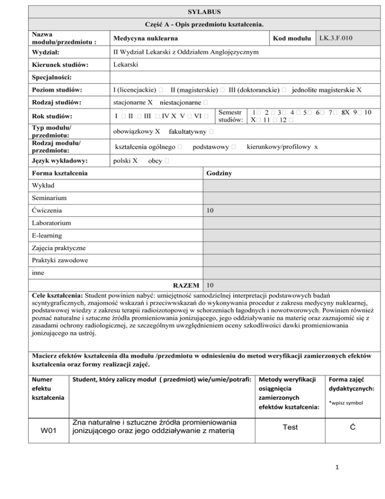 SYLABUS Część A - Opis przedmiotu kształcenia. Nazwa modułu/przedmiotu : Medycyna nuklearna Wydział: II Wydział Lekarski z Oddziałem Anglojęzycznym Kierunek studiów: Lekarski Kod modułu LK.3.F.010 Specjalności: Poziom studiów: I (licencjackie) Rodzaj studiów: stacjonarne X Rok studiów: I Typ modułu/ przedmiotu: Rodzaj modułu/ przedmiotu: Język wykładowy: Forma kształcenia II III X IV X V Semestr studiów: VI X 9 10 X obowiązkowy X kierunkowy/profilowy x polski X Godziny Wykład Seminarium Ćwiczenia 10 Laboratorium E-learning Zajęcia praktyczne Praktyki zawodowe inne RAZEM 10 Cele kształcenia: Student powinien nabyć: umiejętność samodzielnej interpretacji podstawowych badań scyntygraficznych, znajomość wskazań i przeciwwskazań do wykonywania procedur z zakresu medycyny nuklearnej, podstawowej wiedzy z zakresu terapii radioizotopowej w schorzeniach łagodnych i nowotworowych. Powinien również poznać naturalne i sztuczne źródła promieniowania jonizującego, jego oddziaływanie na materię oraz zaznajomić się z zasadami ochrony radiologicznej, ze szczególnym uwzględnieniem oceny szkodliwości dawki promieniowania jonizującego na ustrój. Macierz efektów kształcenia dla modułu /przedmiotu w odniesieniu do metod weryfikacji zamierzonych efektów kształcenia oraz formy realizacji zajęć. Numer efektu kształcenia W01 Student, który zaliczy moduł ( przedmiot) wie/umie/potrafi: Zna naturalne i sztuczne źródła promieniowania jonizującego oraz jego oddziaływanie z materią Metody weryfikacji osiągnięcia zamierzonych efektów kształcenia: Forma zajęć dydaktycznych: Test Ć *wpisz symbol 1 W02 Zna fizyczne podstawy nieinwazyjnych metod obrazowania w medycynie nuklearnej Test Ć W03 Zna mechanizm działania hormonów oraz konsekwencje zaburzeń regulacji hormonalnej Test Ć W04 Zna uwarunkowania genetyczne, środowiskowe i epidemiologiczne najczęstszych chorób. Test Ć W05 Zna i rozumie przyczyny, objawy i zasady diagnozowania radioizotopowego w chorobach dzieci, takich jak: kardiologiczne, nefrologiczne, urologiczne oraz endokrynologiczne. Test Ć W06 Zna i rozumie zasady diagnozowania z zastosowaniem metod medycyny nuklearnej takich chorób osób dorosłych, jak: układu krążenia, w tym ChNS; chorób układu oddechowego, ze szczególnym uwzględnieniem zatorowości płucnej; chorób układu pokarmowego (diagnostyka ślinianek, wątroby, dróg żółciowych i pęcherzyka żółciowego); chorób układu wydzielania wewnętrznego (przysadka, tarczyca, kora i rdzeń nadnerczy, guzy neuroendokrynne); chorób nerek i dróg moczowych; chorób układu krwiotwórczego, szczególnie w zakresie nowotworów mieloproliferacyjnych oraz schorzeń reumatycznych w aspekcie terapii radioizotopowej. Test Ć W07 Zna i rozumie zasady diagnozowania w medycynie nuklearnej chorób naczyniowych mózgu, padaczki, stanów otępiennych, a w szczególności choroby Alzheimera. Test Ć U01 Wnioskuje o relacjach między strukturami anatomicznymi na podstawie izotopowych badań diagnostycznych. Arkusz obserwacyjny Ć U02 Ocenia szkodliwość dawki promieniowania jonizującego w medycynie nuklearnej i stosuje się do zasad ochrony radiologicznej Arkusz obserwacyjny Ć U03 Przeprowadza wywiad lekarski z pacjentem dorosłym. Arkusz obserwacyjny Ć U04 Przeprowadza wywiad lekarski z dzieckiem i jego rodziną. Arkusz obserwacyjny Ć U05 Ocenia wynik badania radioizotopowego w zakresie złamań i zmian o charakterze npl. Arkusz obserwacyjny Ć 2 K01 Akceptuje interdyscyplinarny charakter medycyny nuklearnej. Przestrzega ustaleń metodycznych w zakresie stosowania radioizotopów i metod diagnostycznych oraz terapeutycznych. Wykazuje kreatywność w merytorycznej dyskusji. Akceptuje pracę w zespole. Arkusz obserwacyjny Ć * W- wykład; S- seminarium; Ć- ćwiczenia; L- laboratorium; EL- e-learning; ZP- zajęcia praktyczne; PZ- praktyka zawodowa; Proszę oznaczyć krzyżykami w skali 1-3 jak powyższe efekty lokują państwa zajęcia w działach: przekaz wiedzy, umiejętności czy kształtowanie postaw np.: Wiedza + + + Umiejętności +++ Postawy +++ Nakład pracy studenta (bilans punktów ECTS) Forma nakładu pracy studenta Obciążenie studenta (h) (udział w zajęciach, aktywność, przygotowanie sprawdzenie, itp.) 1. Godziny kontaktowe 10 2. Czas pracy własnej studenta 20 Sumaryczne obciążenie pracy studenta 30 Punkty ECTS za moduł/przedmiotu 1 Uwagi Treść zajęć: ( proszę wpisać hasłowo tematykę poszczególnych zajęć, pamiętając, aby przekładała się ona na zamierzone efekty kształcenia) WYKŁADY: 1. Zastosowanie badań scyntygraficznych w diagnostyce zaburzeń endokrynologicznych. 2. Scyntygrafia i terapia receptorowa. 3. Pozytronowa tomografia emisyjna. 4. Terapia radioizotopowa. 5. Ochrona radiologiczna. ĆWICZENIA: 1. Badania scyntygraficzne tarczycy i przytarczyc. 2. Badania scyntygraficzne układu kostnego i zapalenia. 3. Badania scyntygraficzne nerek i płuc. 4. Badania scyntygraficzne stosowane w diagnostyce zmian nowotworowych. 5. Badania scyntygraficzne w kardiologii. 6. Badania scyntygraficzne mózgu. 7. Test pisemny zaliczeniowy. SEMINARIUM: 3 Podstawy medycyny nuklearnej, ze szczególnym uwzględnieniem techniki pomiaru, sposobów otrzymywania radioizotopów oraz rodzajów źródeł promieniowania. Literatura podstawowa i uzupełniająca, inne pomoce dydaktyczne: Literatura podstawowa: 1. Medycyna Nuklearna – Skrypt dla studentów Wydziału Lekarskiego oraz Wydziału Farmacji z Oddziałem Analityki Klinicznej UM w Lublinie, pod red. Beaty E. Chrapko. Literatura uzupełniająca: 1. Leszek Królicki. Medycyna Nuklearna. Fundacja im. L. Rydygiera. Warszawa 1996r. 2. Peter J. Ell, Sam Gambhir. Nuclear Medicine in Clinical Diagnoses and Tratment. Wymagania dotyczące pomocy dydaktycznych (np. laboratorium, rzutnik multimedialny, inne…) Laptop, rzutnik multimedialny, wskaźnik laserowy. Warunki uzyskania zaliczenia przedmiotu: 1. Obecność 