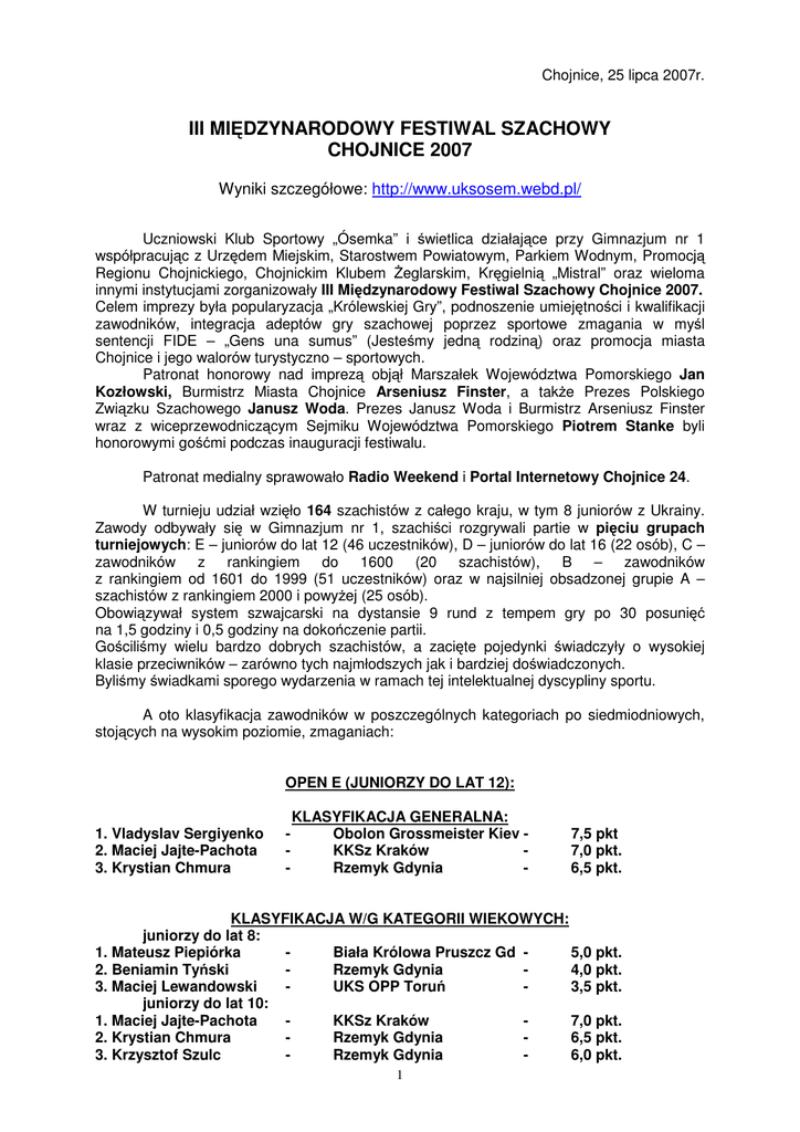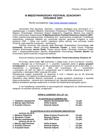 Chojnice, 25 lipca 2007r. III MIĘDZYNARODOWY FESTIWAL SZACHOWY CHOJNICE 2007 Wyniki szczegółowe: http://www.uksosem.webd.pl/ Uczniowski Klub Sportowy „Ósemka” i świetlica działające przy Gimnazjum nr 1 współpracując z Urzędem Miejskim, Starostwem Powiatowym, Parkiem Wodnym, Promocją Regionu Chojnickiego, Chojnickim Klubem Żeglarskim, Kręgielnią „Mistral” oraz wieloma innymi instytucjami zorganizowały III Międzynarodowy Festiwal Szachowy Chojnice 2007. Celem imprezy była popularyzacja „Królewskiej Gry”, podnoszenie umiejętności i kwalifikacji zawodników, integracja adeptów gry szachowej poprzez sportowe zmagania w myśl sentencji FIDE – „Gens una sumus” (Jesteśmy jedną rodziną) oraz promocja miasta Chojnice i jego walorów turystyczno – sportowych. Patronat honorowy nad imprezą objął Marszałek Województwa Pomorskiego Jan Kozłowski, Burmistrz Miasta Chojnice Arseniusz Finster, a także Prezes Polskiego Związku Szachowego Janusz Woda. Prezes Janusz Woda i Burmistrz Arseniusz Finster wraz z wiceprzewodniczącym Sejmiku Województwa Pomorskiego Piotrem Stanke byli honorowymi gośćmi podczas inauguracji festiwalu. Patronat medialny sprawowało Radio Weekend i Portal Internetowy Chojnice 24. W turnieju udział wzięło 164 szachistów z całego kraju, w tym 8 juniorów z Ukrainy. Zawody odbywały się w Gimnazjum nr 1, szachiści rozgrywali partie w pięciu grupach turniejowych: E – juniorów do lat 12 (46 uczestników), D – juniorów do lat 16 (22 osób), C – zawodników z rankingiem do 1600 (20 szachistów), B – zawodników z rankingiem od 1601 do 1999 (51 uczestników) oraz w najsilniej obsadzonej grupie A – szachistów z rankingiem 2000 i powyżej (25 osób). Obowiązywał system szwajcarski na dystansie 9 rund z tempem gry po 30 posunięć na 1,5 godziny i 0,5 godziny na dokończenie partii. Gościliśmy wielu bardzo dobrych szachistów, a zacięte pojedynki świadczyły o wysokiej klasie przeciwników – zarówno tych najmłodszych jak i bardziej doświadczonych. Byliśmy świadkami sporego wydarzenia w ramach tej intelektualnej dyscypliny sportu. A oto klasyfikacja zawodników w poszczególnych kategoriach po siedmiodniowych, stojących na wysokim poziomie, zmaganiach: OPEN E (JUNIORZY DO LAT 12): 1. Vladyslav Sergiyenko 2. Maciej Jajte-Pachota 3. Krystian Chmura KLASYFIKACJA GENERALNA: Obolon Grossmeister Kiev KKSz Kraków Rzemyk Gdynia - 7,5 pkt 7,0 pkt. 6,5 pkt. KLASYFIKACJA W/G KATEGORII WIEKOWYCH: juniorzy do lat 8: 1. Mateusz Piepiórka Biała Królowa Pruszcz Gd 5,0 pkt. 2. Beniamin Tyński Rzemyk Gdynia 4,0 pkt. 3. Maciej Lewandowski UKS OPP Toruń 3,5 pkt. juniorzy do lat 10: 1. Maciej Jajte-Pachota KKSz Kraków 7,0 pkt. 2. Krystian Chmura Rzemyk Gdynia 6,5 pkt. 3. Krzysztof Szulc Rzemyk Gdynia 6,0 pkt. 1 juniorzy do lat 12: 1. Vladyslav Sergiyenko 2. Michał Chmielecki 3. Piotr Staroń juniorki do lat 12: 1. Anna Marczuk 2. Antonina Góra 3. Dominika Winiarska - Obolon Grossmeister Kiev Drapol Jantar Pruszcz Gd. KKSz Kraków - 7,5 pkt. 6,5 pkt. 6,5 pkt. - KKSz Kraków UKS Awans Żyrzyn UKS Ósemka Chojnice - 5,5 pkt. 5,0 pkt. 5,0 pkt. KLASYFIKACJA GENERALNA: Obolon Grossmeister Kiev UKS Ósemka Chojnice Obolon Grossmeister Kiev - 8,0 pkt. 8,0 pkt. 6,5 pkt. OPEN D – JUNIORZY DO LAT 16: 1. Iegor Sakh 2. Piotr Januszewski 3. Yevgeniy Matkovskyy KLASYFIKACJA W/G KATEGORII WIEKU: juniorzy do lat 14: 1. Oleksiy Shakh 2. Przemysław Wiśniewski 3. Michał Trojanowski juniorzy do lat 16: 1. Iegor Sakh 2. Piotr Januszewski 3. Yevgeniy Matkovskyy juniorki do lat 16: 1. Darya Shystarova 2. Joanna Góra 3. Agnieszka Trzcińska - Obolon Grossmeister Kiev MDK Płock Rzemyk Gdynia - 5,0 pkt. 5,0 pkt. 4,5 pkt. - Obolon Grossmeister Kiev UKS Ósemka Chojnice Obolon Grossmeister Kiev - 8,0 pkt. 8,0 pkt. 6,5 pkt. - Obolon Grossmeister Kiev UKS Awans Żyrzyn LKS Promień Kowalewo P. - 5,0 pkt. 4,5 pkt. 4,0 pkt. OPEN C (zawodnicy z rankingiem do 1600): zawodnicy z rtg do 1600: 1. Grzegorz Gołuński 2. Leopold Szreder 3. Kacper Falicki zawodniczki z rtg do 1600: 1. Marta Belka 2. Paulina Małek 3. Grażyna Turzyńska - UKS Ósemka Chojnice Człuchów UKS Trzydziestka Olsztyn - 6,5 pkt. 6,5 pkt. 6,0 pkt. UKS Ziemowit Złotów UKS Ósemka Chojnice UKS Ósemka Chojnice - 5,0 pkt. 4,0 pkt. 4,0 pkt. - 7,0 pkt. 7,0 pkt. 7,0 pkt. - 4,5 pkt. 3,5 pkt. 7,0 pkt. OPEN B (rtg 1601 – 1999): zawodnicy z rtg 1601 – 1999: 1. Przemysław Bokiej Chemik Bydgoszcz 2. Krzysztof Bankert UKS Ósemka Chojnice 3. Michał Wodziński KSz Torfarm-64 Toruń zawodniczki z rtg 1601 – 1999: 1. Dorota Tarach UKS Trzydziestka Olsztyn 2. Paulina Żurek KKSz Kraków 3. Zofia Wodzińska KSz Torfarm-64 Toruń 2 OPEN A (rtg 2000 i powyżej): zawodnicy z rtg powyżej 2000: 1. Krzysztof Budrewicz AZS UWM Olsztyn 2. Ihor Nester Lviv Ukraina 3. Oskar Włodarczyk OTSz Ostrów Wielkopolski zawodniczki z rtg powyżej 2000: 1. Renata Bursa UKS MDK 5 Bydgoszcz 2. Anna Shystarova Obolon Grossmeister Kiev 3. Monika Zembrzuska UKS Rotmistrz Grudziądz - 8,0 pkt. 7,5 pkt. 6,0 pkt. 4,5 pkt. 4,0 pkt. 2,5 pkt. Najlepsi chojniczanie w grupie A to Adrian Grajczak (4,5 pkt.) i Janek Myzyk (4,0). Uhonorowano także siedemdziesięcioletniego nestora turnieju – pana Stanisława Szczepańca (Drapol Jantar Pruszcz Gd.) oraz najmłodszych zawodników: sześcioletnią Alicję Śliwicką (UKS OPP Toruń) i siedmiolatka Marcina Czeczkowskiego z Pruszcza Gdańskiego (Biała Królowa). Szczegółowa klasyfikacja generalna grup turniejowych znajduje się na stronie internetowej UKS „ÓSEMKA” Chojnice. Ceremonię wręczenia nagród uświetnili swoją obecnością: wiceprzewodniczący Sejmiku Wojewódzkiego Piotr Stanke, przedstawiciel Starostwa Chojnickiego Leszek Redzimski, Prezes Kujawsko – Pomorskiego Związku Szachowego Andrzej Michalski, wicedyrektor Gimnazjum nr 1 Joanna Loll oraz reprezentanci firmy komputerowej OPEN – jednego z głównych sponsorów imprezy: Łukasz Synoradzki i 