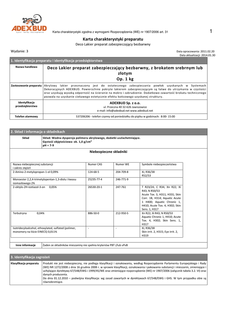 1 Karta charakterystyki zgodna z wymogami Rozporządzenia (WE) nr 1907/2006 art. 31 Karta charakterystyki preparatu Deco Lakier preparat zabezpieczający bezbarwny Wydanie: 3 Data opracowania: 2011.02.20 Data aktualizacji: 2014.01.30 1. Identyfikacja preparatu i identyfikacja przedsiębiorstwa Nazwa handlowa Deco Lakier preparat zabezpieczający bezbarwny, z brokatem srebrnym lub złotym Op. 1 kg Zastosowanie preparatu Akrylowy lakier przeznaczony jest do ostatecznego zabezpieczania powłok uzyskanych w Systemach Dekoracyjnych ADEXBUD. Powierzchnie pokryte lakierem zabezpieczającym są łatwe do utrzymania w czystości oraz uzyskują wysoką odporność na ścieranie na mokro i zabrudzenie. Dodatkowo zawartość brokatu technicznego pozwala na uzyskanie ciekawego estetycznie efektu końcowego uzyskanej struktury. Identyfikacja przedsiębiorstwa ADEXBUD Sp. z o.o. ul. Przeczna 40 32-626 Jawiszowice e-mail: [email protected] www.adexbud.net Telefon alarmowy 537206206 - telefon czynny od poniedziałku do piątku w godzinach: 8:00- 15:00 2. Skład i informacja o składnikach Skład Skład: Wodna dyspersja polimeru akrylowego, dodatki uszlachetniające. Gęstość objętościowa: ok. 1,0 g/cm³ pH = 7-9 Niebezpieczne składniki Nazwa niebezpiecznej substancji i zakres stężeń 2-Amino-2-metylopropan-1-ol 0,09% Numer CAS Numer WE Symbole niebezpieczeństwa 124-68-5 204-709-8 Xi; R36/38 R52/53 Monoester 2,2,4-trimetylopentan-1,3-diolu i kwasu izomasłowego 2% 2-oktylo-2H-izotiazol-3-on 0,05% 25235-77-4 246-771-9 26530-20-1 247-761 Terbutryna 886-50-0 212-950-5 - - 0,04% Isotridecyloalcohol, ethoxylated, sulfated (polimer, monomery na liście EINECS) 0,011% Inne informacje T R23/24; C R34; Xn R22; Xi R43; N R50/53 Acute Tox. 3, H311, H331; Skin Corr. 1B, H314; Aquatic Acute 1 H400; Aquatic Chronic 1, H410; Acute Tox. 4, H302; Skin Sens. 1, H317 Xn R22; Xi R43; N R50/53 Aquatic Chronic 1, H410; Acute Tox. 4, H302; Skin Sens. 1, H317 Xi; R36/38 Skin irrit. 2, H315; Eye irrit. 2, H319 Żaden ze składników mieszaniny nie spełnia kryteriów PBT i/lub vPvB 3. Identyfikacja zagrożeń Klasyfikacja preparatu Produkt nie jest niebezpieczny, nie podlega klasyfikacji i oznakowaniu, według Rozporządzenie Parlamentu Europejskiego i Rady (WE) NR 1272/2008 z dnia 16 grudnia 2008 r. w sprawie klasyfikacji, oznakowania i pakowania substancji i mieszanin, zmieniające i uchylające dyrektywy 67/548/EWG i 1999/45/WE oraz zmieniające rozporządzenie (WE) nr 1907/2006 (załącznik tabela 3.2. VI) oraz danych producenta. Do dnia 01.12.2010 – podwójna klasyfikacja: wg zasad zawartych w dyrektywach 67/548/EWG i GHS. W tym przypadku obie są równobrzmiące. Strona 1 z 6 2 Karta charakterystyki zgodna z wymogami Rozporządzenia (WE) nr 1907/2006 art. 31 Karta charakterystyki preparatu Deco Lakier preparat zabezpieczający bezbarwny Skutki i objawy działania preparatu Brak danych Inne informacje 4. Pierwsza pomoc Układ oddechowy Nie ma konieczności stosowania specjalnych zabiegów. W razie konieczności osobę poszkodowaną wyprowadzić na świeże powietrze, okryć kocem i obserwować, ewentualnie wezwać lekarza. Kontakt ze skórą Zdjąć zanieczyszczoną odzież i obuwie. Zabrudzone partie skóry spłukać dużą ilością wody z mydłem. Jeżeli wystąpiło podrażnienie skóry skontaktować się z lekarzem. Kontakt z okiem Usunąć soczewki kontaktowe, dokładnie płukać dużą ilością wody przez 15 minut, unikać silnego strumienia wody ze względu na możliwość uszkodzenia rogówki. W trakcie przemywania chronić drugie oko przed zanieczyszczeniami. Spożycie Zdarzenie to jest mało prawdopodobne. Wypłukać jamę ustną wodą (nie połykać). Nie wywoływać wymiotów – istnieje ryzyko zachłyśnięcia i przedostania się substancji do płuc. Jeżeli poszkodowany jest przytomny można podać 1-2 szklanek wody do wypicia, można podać węgiel aktywny. Natychmiast wezwać lekarza. 5. Postępowanie w przypadku pożaru Odpowiednie środki gaśnicze Środki gaśnicze niedozwolone ze względów bezpieczeństwa Specjalne zagrożenia Niebezpieczne produkty rozkładu Specjalne wyposażenie ochronne dla strażaków Dalsze zalecenia Preparat jest nie palny. Stosować środki gaśnicze właściwe dla otaczających materiałów. Woda – rozproszone prądy wodne, proszki gaśnicze, gaśnice pianowe, gaśnice śniegowe, piasek. Zwarty, silny strumień wody Nie znane Nie znane Podczas pożaru, ze względu na otaczające materiały mogą powstawać substancje szkodliwe dla zdrowia. Nałożyć odzież ochronną gazoszczelną i aparat izolujący drogi oddechowe (aparat tlenowy skompletowany z maską). Woda skażona środkami gaśniczymi musi być usuwana jako odpad niebezpieczny. Zawiadomić otoczenie o pożarze. Usunąć z obszaru zagrożenia wszystkie osoby nie biorące udziału w likwidowaniu pożaru. Powiadomić Państwową Straż Pożarną, a w razie konieczności także Policję Państwową, najbliższe władze terenowe i najbliższą jednostkę Ratownictwa Chemicznego. 6. Postępowanie z przypadkowym wyciekiem Indywidualne środki ostrożności Środki ostrożności w zakresie ochrony środowiska: Metody oczyszczania i neutralizacji Zapewnić odpowiednią wentylację, usunąć źródła ognia, nie palić, nie jeść, nie pić. Unikać wdychania par i aerozoli. Uwaga: rozlany produkt może tworzyć śliską powierzchnię. Nie dopuścić do przedostania się produktu do systemu kanalizacyjnego, wód gruntowych oraz gleby. Nie dopuścić do powierzchniowego rozprzestrzeniania się (miejsca wycieku obwałować). W przypadku rozlania usuwać przy pomocy materiału absorbującego (piach, ziemia, trociny). Mały wyciek rozcieńczyć wodą i wytrzeć szmatą lub wchłaniać za pomocą obojętnych absorbentów tj. piasek. Duży wyciek – chronić przed wysoką temperaturą i źródłami zapłonu. Zaabsorbować za pomocą suchej ziemi, piasku i innych niepalnych materiałów. Przenieść do odpowiednio oznakow