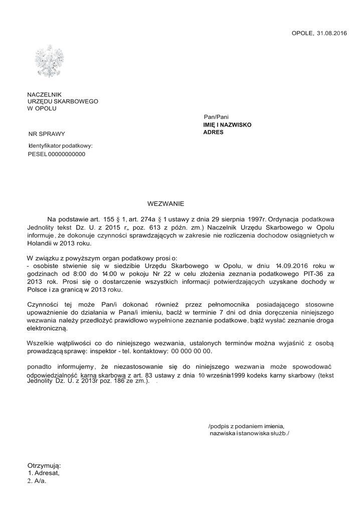 OPOLE, 31.08.2016 NACZELNIK URZĘDU SKARBOWEGO W OPOLU Pan/Pani IMIĘ I NAZWISKO ADRES NR SPRAWY Identyfikator podatkowy: PESEL 00000000000 WEZWANIE Na podstawie art. 155 § 1, art. 274a § 1 ustawy z dnia 29 sierpnia 1997r. Ordynacja podatkowa Jednolity tekst Dz. U. z 2015 r„ poz. 613 z późn. zm.) Naczelnik Urzędu Skarbowego w Opolu informuje , że dokonuje czynności sprawdzających w zakresie nie rozliczenia dochodow osiągnietych w Holandii w 2013 roku. W związku z powyższym organ podatkowy prosi o: - osobiste stwienie się w siedzibie Urzędu Skarbowego w Opolu, w dniu 14.09.2016 roku w godzinach od 8:00 do 14:00 w pokoju Nr 22 w celu złożenia zeznan ia podatkowego PIT-36 za 2013 rok. Prosi się o dostarczenie wszystkich informacji potwierdzających uzyskane dochody w Polsce i za granicą w 2013 roku. Czynności tej może Pan/i dokonać również przez pełnomocnika posiadającego stosowne upoważnienie do działania w Pana/i imieniu, baclź w terminie 7 dni od dnia doręczenia niniejszego wezwania należy przedłożyć prawidłowo wypełnione zeznanie podatkowe, bądź wysłać zeznanie droga elektroniczną. Wszelkie wątpliwości co do niniejszego wezwania, ustalonych terminów można wyjaśnić z osobą prowadzącą sprawę: inspektor - tel. kontaktowy: 00 000 00 00. ponadto informujemy , że niezastosowanie się do niniejszego wezwania może spowodować odpowiedzialność karną skarbową z art. 83 ustawy z dnia 10 września1999 kodeks karny skarbowy (tekst Jednolity Dz. U. z 2013r poz. 186 ze zm.). . /podpis z podaniem imienia, nazwiska i stanow iska służb./ Otrzymują: 1. Adresat, 2. A/a.