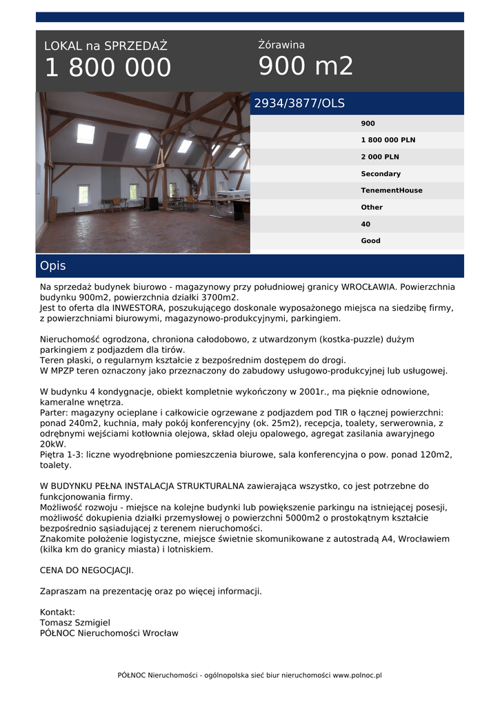 LOKAL na SPRZEDAŻ 1 800 000 Żórawina 900 m2 2934/3877/OLS 900 1 800 000 PLN 2 000 PLN Secondary TenementHouse Other 40 Good Opis Na sprzedaż budynek biurowo - magazynowy przy południowej granicy WROCŁAWIA. Powierzchnia budynku 900m2, powierzchnia działki 3700m2. Jest to oferta dla INWESTORA, poszukującego doskonale wyposażonego miejsca na siedzibę firmy, z powierzchniami biurowymi, magazynowo-produkcyjnymi, parkingiem. Nieruchomość ogrodzona, chroniona całodobowo, z utwardzonym (kostka-puzzle) dużym parkingiem z podjazdem dla tirów. Teren płaski, o regularnym kształcie z bezpośrednim dostępem do drogi. W MPZP teren oznaczony jako przeznaczony do zabudowy usługowo-produkcyjnej lub usługowej. W budynku 4 kondygnacje, obiekt kompletnie wykończony w 2001r., ma pięknie odnowione, kameralne wnętrza. Parter: magazyny ocieplane i całkowicie ogrzewane z podjazdem pod TIR o łącznej powierzchni: ponad 240m2, kuchnia, mały pokój konferencyjny (ok. 25m2), recepcja, toalety, serwerownia, z odrębnymi wejściami kotłownia olejowa, skład oleju opalowego, agregat zasilania awaryjnego 20kW. Piętra 1-3: liczne wyodrębnione pomieszczenia biurowe, sala konferencyjna o pow. ponad 120m2, toalety. W BUDYNKU PEŁNA INSTALACJA STRUKTURALNA zawierająca wszystko, co jest potrzebne do funkcjonowania firmy. Możliwość rozwoju - miejsce na kolejne budynki lub powiększenie parkingu na istniejącej posesji, możliwość dokupienia działki przemysłowej o powierzchni 5000m2 o prostokątnym kształcie bezpośrednio sąsiadującej z terenem nieruchomości. Znakomite położenie logistyczne, miejsce świetnie skomunikowane z autostradą A4, Wrocławiem (kilka km do granicy miasta) i lotniskiem. CENA DO NEGOCJACJI. Zapraszam na prezentację oraz po więcej informacji. Kontakt: Tomasz Szmigiel PÓŁNOC Nieruchomości Wrocław PÓŁNOC Nieruchomości - ogólnopolska sieć biur nieruchomości www.polnoc.pl tel: 509-518-483 e-mail: [email protected] Więcej ofert na www.polnoc.pl * UWAGA! Zamieszczone na naszych stronach oferty nie stanowią oferty w rozumieniu Kodeksu Cywilnego, a dane w nich zawarte mają jedynie charakter informacyjny. Więcej ofert znajdziesz na naszej stronie www.polnoc.pl * UWAGA! Zamieszczone na naszych stronach oferty nie stanowią oferty w rozumieniu Kodeksu Cywilnego, a dane w nich zawarte mają jedynie charakter informacyjny. Tomasz Szmigiel tel. 509-518-483 email: [email protected] PÓŁNOC Nieruchomości - ogólnopolska sieć biur nieruchomości www.polnoc.pl Powered by TCPDF (www.tcpdf.org)
