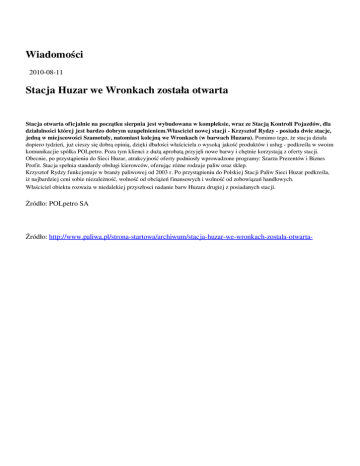 Wiadomości 2010-08-11 Stacja Huzar we Wronkach została otwarta Stacja otwarta oficjalnie na początku sierpnia jest wybudowana w kompleksie, wraz ze Stacją Kontroli Pojazdów, dla działalności której jest bardzo dobrym uzupełnieniem.Własciciel nowej stacji - Krzysztof Rydzy - posiada dwie stacje, jedną w miejscowości Szamotuły, natomiast kolejną we Wronkach (w barwach Huzara). Pomimo tego, że stacja działa dopiero tydzień, już cieszy się dobrą opinią, dzięki dbałości właściciela o wysoką jakość produktów i usług - podkreśla w swoim komunikacjie spólka POLpetro. Poza tym klienci z dużą aprobatą przyjęli nowe barwy i chętnie korzystają z oferty stacji. Obecnie, po przystąpieniu do Sieci Huzar, atrakcyjność oferty podniosły wprowadzone programy: Szarża Prezentów i Biznes Profit. Stacja spełnia standardy obsługi kierowców, oferując różne rodzaje paliw oraz sklep. Krzysztof Rydzy funkcjonuje w branży paliwowej od 2003 r. Po przystąpieniu do Polskiej Stacji Paliw Sieci Huzar podkreśla, iż najbardziej ceni sobie niezależność, wolność od obciążeń finansowych i wolność od zobowiązań handlowych. Właściciel obiektu rozważa w niedalekiej przyszłosci nadanie barw Huzara drugiej z posiadanych stacji. Żródło: POLpetro SA Źródło: http://www.paliwa.pl/strona-startowa/archiwum/stacja-huzar-we-wronkach-zostala-otwarta- Powered by TCPDF (www.tcpdf.org)