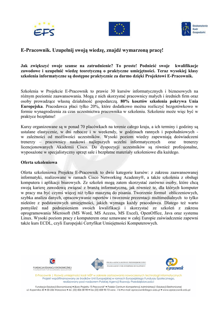E-Pracownik. Uzupełnij swoją wiedzę, znajdź wymarzoną pracę! Jak zwiększyć swoje szanse na zatrudnienie? To proste! Podnieść swoje kwalifikacje zawodowe i uzupełnić wiedzę teoretyczną o praktyczne umiejętności. Teraz wysokiej klasy szkolenia informatyczne są dostępne praktycznie za darmo dzięki Projektowi E-Pracownik. Szkolenia w Projekcie E-Pracownik to prawie 30 kursów informatycznych i biznesowych na róŜnym poziomie zaawansowania. Mogą z nich skorzystać pracownicy małych i średnich firm oraz osoby prowadzące własną działalność gospodarczą. 80% kosztów szkolenia pokrywa Unia Europejska. Pracodawca płaci tylko 20%, które dodatkowo moŜna rozliczyć bezgotówkowo w formie wynagrodzenia za czas uczestnictwa pracownika w szkoleniu. Szkolenie moŜe więc być w praktyce bezpłatne! Kursy organizowane są w ponad 70 placówkach na terenie całego kraju, a ich terminy i godziny są ustalane elastycznie, w dni robocze i w weekendy, w godzinach rannych i popołudniowych w zaleŜności od moŜliwości uczestników. Wysoki poziom wiedzy zapewniają doświadczeni trenerzy – pracownicy naukowi najlepszych uczelni informatycznych oraz trenerzy licencjonowanych Akademii Cisco. Do dyspozycji uczestników są równieŜ profesjonalne, wyposaŜone w specjalistyczny sprzęt sale i bezpłatne materiały szkoleniowe dla kaŜdego. Oferta szkoleniowa Oferta szkoleniowa Projektu E-Pracownik to dwie kategorie kursów: z zakresu zaawansowanej informatyki, realizowane w ramach Cisco Networking Academy®, a takŜe szkolenia z obsługi komputera i aplikacji biurowych. Ze szkoleń mogą zatem skorzystać zarówno osoby, które chcą swoją karierę zawodową związać z branŜą informatyczną, jak równieŜ te, dla których komputer w pracy ma być czymś więcej niŜ tylko maszyną do pisania. Tworzenie formuł obliczeniowych, szybka analiza danych, opracowywanie raportów i tworzenie prezentacji multimedialnych to tylko niektóre z podstawowych umiejętności, jakich wymaga kaŜdy pracodawca. Dlatego teŜ warto pomyśleć nad podniesieniem swoich kwalifikacji i skorzystać ze szkoleń z zakresu oprogramowania Microsoft (MS Word, MS Access, MS Excel), OpenOffice, Java oraz systemu Linux. Wysoki poziom pracy z komputerem oraz uznawane w całej Europie zaświadczenie zapewni takŜe kurs ECDL, czyli Europejski Certyfikat Umiejętności Komputerowych. Dla wszystkich administratorów, projektantów i serwisantów systemów oraz sieci komputerowych przeznaczone są szkolenia Akademii Cisco. Dotyczą one sieci bezprzewodowych, systemów operacyjnych i programowania oraz ich bezpieczeństwa. Przygotowują do renomowanych międzynarodowych certyfikatów, m.in. CCNA i CCNP. Aby zapisać się na szkolenie wystarczy skorzystać z formularza zgłoszeniowego na stronie www.epracownik.edu.pl. Szczegółowe informacje: www.epracownik.edu.pl, [email protected], tel. (22) 826 08 98 Projekt „E-Pracownik. Rozwój umiejętności kadr MŚP w zakresie zastosowania nowoczesnych technologii informatycznych” jest jednym z największych projektów szkoleniowych współfinansowanych z funduszy Unii Europejskiej w Polsce. Zakłada przeszkolenie w latach 2006-2007 około 5000 osób na terenie całego kraju. Projekt uzyskał dofinansowanie ze środków Europejskiego Funduszu Społecznego w ramach Sektorowego Programu Operacyjnego Rozwój Zasobów Ludzkich, Działanie 2.3 Rozwój kadr nowoczesnej gospodarki, Schemat a Doskonalenie umiejętności i kwalifikacji kadr. Projekt realizowany jest przez Konsorcjum, którego liderem jest Fundacja Edukacji Ekonomicznej we współpracy z partnerami regionalnymi: WyŜszą Szkołą Humanistyczno-Ekonomiczną w Łodzi, WyŜszą Szkołą Informatyki i Zarządzania w Rzeszowie, Uniwersytetem Mikołaja Kopernika w Toruniu, Polsko-Japońską WyŜszą Szkołą Technik Komputerowych w Warszawie i Uniwersytetem Gdański.