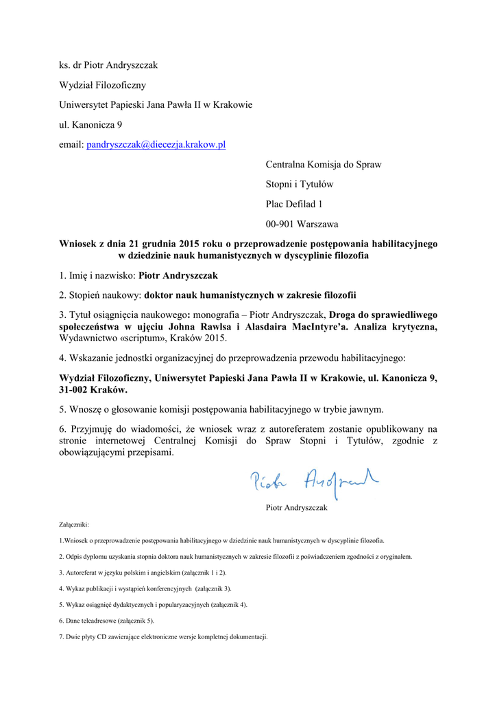 ks. dr Piotr Andryszczak Wydział Filozoficzny Uniwersytet Papieski Jana Pawła II w Krakowie ul. Kanonicza 9 email: [email protected] Centralna Komisja do Spraw Stopni i Tytułów Plac Defilad 1 00-901 Warszawa Wniosek z dnia 21 grudnia 2015 roku o przeprowadzenie postępowania habilitacyjnego w dziedzinie nauk humanistycznych w dyscyplinie filozofia 1. Imię i nazwisko: Piotr Andryszczak 2. Stopień naukowy: doktor nauk humanistycznych w zakresie filozofii 3. Tytuł osiągnięcia naukowego: monografia – Piotr Andryszczak, Droga do sprawiedliwego społeczeństwa w ujęciu Johna Rawlsa i Alasdaira MacIntyre’a. Analiza krytyczna, Wydawnictwo «scriptum», Kraków 2015. 4. Wskazanie jednostki organizacyjnej do przeprowadzenia przewodu habilitacyjnego: Wydział Filozoficzny, Uniwersytet Papieski Jana Pawła II w Krakowie, ul. Kanonicza 9, 31-002 Kraków. 5. Wnoszę o głosowanie komisji postępowania habilitacyjnego w trybie jawnym. 6. Przyjmuję do wiadomości, że wniosek wraz z autoreferatem zostanie opublikowany na stronie internetowej Centralnej Komisji do Spraw Stopni i Tytułów, zgodnie z obowiązującymi przepisami. Piotr Andryszczak Załączniki: 1.Wniosek o przeprowadzenie postępowania habilitacyjnego w dziedzinie nauk humanistycznych w dyscyplinie filozofia. 2. Odpis dyplomu uzyskania stopnia doktora nauk humanistycznych w zakresie filozofii z poświadczeniem zgodności z oryginałem. 3. Autoreferat w języku polskim i angielskim (załącznik 1 i 2). 4. Wykaz publikacji i wystąpień konferencyjnych (załącznik 3). 5. Wykaz osiągnięć dydaktycznych i popularyzacyjnych (załącznik 4). 6. Dane teleadresowe (załącznik 5). 7. Dwie płyty CD zawierające elektroniczne wersje kompletnej dokumentacji.