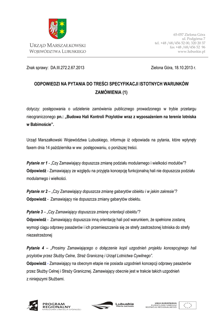 65-057 Zielona Góra ul. Podgórna 7 tel. +48 /68/456 52 00, 320 20 37 fax +48 /68/456 52 96 www.lubuskie.pl Znak sprawy: DA.III.272.2.67.2013 Zielona Góra, 18.10.2013 r. ODPOWIEDZI NA PYTANIA DO TREŚCI SPECYFIKACJI ISTOTNYCH WARUNKÓW ZAMÓWIENIA (1) dotyczy: postępowania o udzielenie zamówienia publicznego prowadzonego w trybie przetargu nieograniczonego pn.: „Budowa Hali Kontroli Przylotów wraz z wyposażeniem na terenie lotniska w Babimoście”. Urząd Marszałkowski Województwa Lubuskiego, informuje iż odpowiada na pytania, które wpłynęły faxem dnia 14 października w ww. postępowaniu, o poniższej treści. Pytanie nr 1 - „Czy Zamawiający dopuszcza zmianę podziału modularnego i wielkości modułów”? Odpowiedź - Zamawiający ze względu na przyjęta koncepcję funkcjonalną hali nie dopuszcza podziału modularnego i wielkości. Pytanie nr 2 – „Czy Zamawiający dopuszcza zmianę gabarytów obiektu i w jakim zakresie”? Odpowiedź - Zamawiający nie dopuszcza zmiany gabarytów obiektu. Pytanie 3 – „Czy Zamawiający dopuszcza zmianę orientacji obiektu”? Odpowiedź - Zamawiający dopuszcza inną orientację hali pod warunkiem, że spełnione zostaną wymogi ciągu odprawy pasażerów i ich przemieszczenia się ze strefy zastrzeżonej lotniska do strefy niezastrzeżonej Pytanie 4 – „Prosimy Zamawiającego o dołączenie kopii uzgodnień projektu koncepcyjnego hali przylotów przez Służby Celne, Straż Graniczną i Urząd Lotnictwa Cywilnego”. Odpowiedź - Zamawiający na obecnym etapie nie posiada uzgodnień koncepcji odprawy pasażerów przez Służby Celnej i Straży Granicznej. Zamawiający obecnie jest w trakcie takich uzgodnień z niniejszymi Służbami. Pytanie 5 – „Czy Zamawiający dopuszcza wzrost kosztu inwestycji ze względu na zmianę na etapie projektu budowlanego i realizacji układu funkcjonalnego hali przylotów, tak aby spełnić wymogi Służb w zakresie kontroli podróżnych”? Odpowiedź - Zamawiający nie dopuszcza przekroczenie budżetu zarezerwowanego przez Zamawiającego i określonego w P.F.-U. Pytanie 6 – „Prosimy Zamawiającego o potwierdzenie założonej technologii obsługi pasażerów, zakładając: a. Brak wyraźnego podziału na ruch Schengen i Non-Schengen, ew. założoną obsługę tylko pasażerów Non-Schengen? b. Brak ścieżek: „towar do oclenia” i „nic do oclenia” oraz urządzenia prześwietlającego UC w bagażowni”. Odpowiedź - Zamawiający informuje, że hala kontroli przylotów będzie jednorazowo obsługiwała tylko i wyłącznie pasażerów z samolotu dla jednej z dwóch stref (jedna operacja na ok. 1 godz.). Nie przewiduje się równoczesnej obsługi w hali pasażerów z dwóch różnych stref. Zamawiający przewiduje dla pasażerów ze strefy Schengen uproszczenie przemieszczania się wewnątrz hali poprzez wprowadzenie dodatkowego ruchomego (otwieranego) przejścia między holem wejścia pasażerów do hali a pomieszczeniem odbioru bagażu z taśmociągu. W trakcie obsługi samolotu z pasażerami ze strefy Non-Schengen przejście to będzie zamykane, aby wymusić ciąg pasażerów w kierunku boksów kontroli paszportowej. Pasażerowie po odbiorze bagażu kierować się będą w kierunku trzech wyjść z hali do strefy ogólnodostępnej. Jedno z wyjść będzie oznaczone „Towar do oclenia” i wymuszany będzie barierkami kierunek pasażerów mających towary do oclenia. W tym ciągu będzie również zamontowane urządzenie rentgenowskie do kontroli bagażu lukowego i kabinowego wraz z platformą do manualnej rewizji bagażu. Pytanie 7 – „Prosimy Zamawiającego o potwierdzenie założonej przepustowości godzinowej (200 pasażerów). Czy jest ona wymagana dla ruchu Schengen i Non-Schengen czy tylko dla NonSchengen? Prosimy Zamawiającego o potwierdzenie założonej długości karuzeli bagażowej, za krótkiej dla obsługi bagażu 200 pasażerów”. Odpowiedź - Zamawiający potwierdza godzinową przepustowość hali do 200 pasażerów na godzinę oraz ich bagażu. Pojemność bagażową taśmociągu karuzelowego Zamawiający zakłada również dla 200 szt. bagażu lukowego na godzinę. Zamawiający przyjmuje, że w hali będzie obsługiwał każdorazowo w ciągu 1 godziny tylko jeden samolot kodu „C”. Czy jest to samolot ze strefy Schengen, czy też ze strefy Non-Schengen zawsze będzie to tylko jeden samolot z maksymalnie do 200 pasażerami na pokładzie (patrz również informacja w pkt.6). W głównym założeniu funkcjonalnym hali, ciąg pasażerów musi obejmować rozwiązanie dla odprawy pasażerów ze strefy Non-Schengen, jednakże rozwiązanie komunikacji wewnątrz hali powinno zawierać również możliwość większego upłynnienia pasażerów przylatujących ze strefy Schengen (bez kontroli paszportowej i celnej) poprzez możliwość skróconego przemieszczania się pomiędzy ciągiem do kontroli paszportowej, a strefą odbioru bagażu lukowego (np. poprzez otwierane dodatkowych przejść między strefami wewnątrz hali). Pytanie 8 – „Prosimy Zamawiającego o potwierdzenie założonej trasy karuzeli bagażowej. Zgodnie z wytycznymi Służb karuzela nie może wprowadzać bagaży z hali odbioru bagażu – powtórnie do bagażowni”. Odpowiedź - Zamawiający informuje, że taśmociąg bagażowy w całości będzie znajdował się w strefie zastrzeżonej lotniska, a bagaż lukowy będzie podawany bezpośrednio z wózków dowożących bagaż z luku samolotu bez przechowywania w strefie wyładunku bagażu (strefa wyładunku bagażu lukowego na taśmociąg nie jest strefą bagażowni). Ze względu na ograniczone możliwości powierzchni dla tego działania, taśmociąg bagażowy spełnia dwie funkcje – taśmociągu odbioru bagażu przez podróżnego i taśmociągu sortująco – podającego bagaż. Pytanie 9 – „Prosimy Zamawiającego o potwierdzenie, iż nie wymaga wydzielenia i wyposażenia w instalacje następujących pomieszczeń w/przy hali przylot