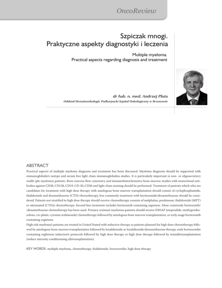 Szpiczak mnogi. Praktyczne aspekty diagnostyki i leczenia Multiple myeloma. Practical aspects regarding diagnosis and treatment dr hab. n. med. Andrzej Pluta Oddział Hematoonkologii, Podkarpacki Szpital Onkologiczny w Brzozowie Abstract Practical aspects of multiple myeloma diagnosis and treatment has been discussed. Myeloma diagnosis should be supported with immunoglobulin’s isotype and serum free light chain immunoglobulins studies. It is particularly important in non- or oligosecretory mullti (ple myelomas patients. Bone marrow flow cytometry and immunohistochemistry bone marrow studies with monoclonal antibodies against CD38, CD138, CD19, CD-20, CD56 and light chain staining should be performed. Treatment of patients which who are candidates for treatment with high dose therapy with autologous bone marrow transplantation should consist of cyclophosphamide, thalidomide and dexamethasone (CTD) chemotherapy, less commonly treatment with bortezomide/dexamethasone should be considered. Patients not stratified to high dose therapy should receive chemotherapy consists of melphalan, prednisone, thalidomide (MPT) or attenuated (CTDa) chemotherapy. Second line treatment includes bortezomib containing regimens. Most commonly bortezomib/ /dexamethasone chemotherapy has been used. Primary resistant myelomas patients should receive ESHAP (etoposdide, methyprednisolone, cis-platin, cytosine arabinoside) chemotherapy followed by autologous bone marrow transplantation, or early usage bortezomib containing regimens. High risk myeloma’s patients are treated in United Stated with inductive therapy as patients planned for high dose chemotherapy followed by autologous bone marrow transplantation followed by lenalidomide or lenalidomide/dexamethasone therapy, early bortezomibe containing regfimens induction’s protocols followed by high dose therapy or high dose therapy followed by miniallotransplantation (reduce intensity conditionning allotransplantation). Key words: multiple myeloma, chemotherapy, thalidomide, bortezomibe, high dose therapy Szpiczak mnogi. Praktyczne aspekty diagnostyki i leczenia A. Pluta Streszczenie Celem pracy było przedstawienie wybranych praktycznych aspektów diagnostyki i leczenia chorych na szpiczaka mnogiego. Rozpoznanie szpiczaka powinno być poparte badaniem izotypu immunoglobulin oraz badaniem stężenia łańcuchów lekkich immunoglobulin, szczególnie przydatne u chorych z „niewydzielającą” lub skąpo wydzielającą postacią szpiczaka mnogiego. Rozpoznanie powinno być poparte wynikami badań cytometrycznych i immunocytochemicznych z zastosowaniem przeciwciał monoklonalnych przeciw antygenom: CD38, CD138, CD19, CD-20, CD56, oraz przeciwko łańcuchom lekkim immunoglobulin kappa i lambda. W terapii chorych planowanych do leczenia wysokodawkowaną chemioterapią z autotransplantacją komórek macierzystych (WCAT) stosuje się trójlekową kombinację cyklofosfamidu, talidomidu, deksametazonu, rzadziej schematy leczenia z bortezomibem (np. bortezomib z deksametazonem). W leczeniu chorych niekwalifikujących się do WCAT stosuje się leczenie melfalanem, prednizonem, talidomidem lub trójlekową kombinację cyklofosfamidu, talidomidu, deksametazonu w zredukowanych dawkach – CTDa). Jako leczenie drugorzutowe stosuje się chemioterapię z zastosowaniem bortezomibu. Można zmniejszyć objawy niepożądane leczenia bortezomibem przez podawanie leku raz w tygodniu. W pierwotnej oporności na leczenie stosuje się mobilizację z zastosowaniem kuracji ESHAP (etopozydu, metylprednizolonu, arabinozydu cytozyny oraz cisplatyny) lub schematy zawierające bortezomib. Wykonywanie badań cytogenetycznych umożliwia identyfikację chorych „wysokiego ryzyka”. Jednak w warunkach europejskich leczenie indukujące nie różni się od innych chorych ze szpiczakiem. Kierunki leczenia takich chorych w USA obejmują: leczenie indukujące jak przed wysokodawkowaną chemioterapią oraz przedłużone leczenie podtrzymujące lenalidomidem lub lenalidomidem z deksametazonem, wczesne zastosowanie chemioterapii z bortezomibem w leczeniu indukującym z wysokodawkowaną chemioterapią lub wysokodawkowaną chemioterapię jako leczenie pierwszorzutowe z następowym minialloprzeszczepem szpiku (allogenicznym przeszczepem ze zredukowanym kondycjonowaniem). Słowa kluczowe: szpiczak mnogi, chemioterapia, talidomid, bortezomib, wysokodawkowana chemioterapia 2011/Vol. 1/Nr 1/48-54 49