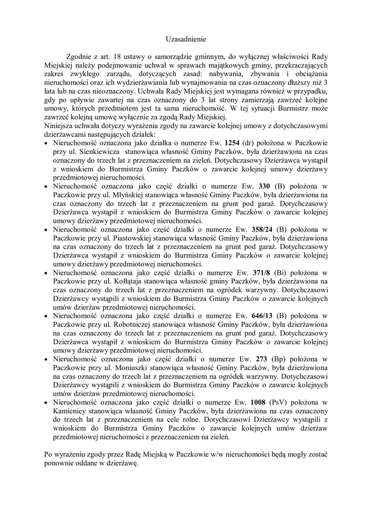 Uzasadnienie Zgodnie z art. 18 ustawy o samorządzie gminnym, do wyłącznej właściwości Rady Miejskiej należy podejmowanie uchwał w sprawach majątkowych gminy, przekraczających zakres zwykłego zarządu, dotyczących zasad: nabywania, zbywania i obciążania nieruchomości oraz ich wydzierżawiania lub wynajmowania na czas oznaczony dłuższy niż 3 lata lub na czas nieoznaczony. Uchwała Rady Miejskiej jest wymagana również w przypadku, gdy po upływie zawartej na czas oznaczony do 3 lat strony zamierzają zawrzeć kolejne umowy, których przedmiotem jest ta sama nieruchomość. W tej sytuacji Burmistrz może zawrzeć kolejną umowę wyłącznie za zgodą Rady Miejskiej. Niniejsza uchwała dotyczy wyrażenia zgody na zawarcie kolejnej umowy z dotychczasowymi dzierżawcami następujących działek: • Nieruchomość oznaczona jako działka o numerze Ew. 1254 (dr) położona w Paczkowie przy ul. Sienkiewicza stanowiąca własność Gminy Paczków, była dzierżawiona na czas oznaczony do trzech lat z przeznaczeniem na zieleń. Dotychczasowy Dzierżawca wystąpił z wnioskiem do Burmistrza Gminy Paczków o zawarcie kolejnej umowy dzierżawy przedmiotowej nieruchomości. • Nieruchomość oznaczona jako część działki o numerze Ew. 330 (B) położona w Paczkowie przy ul. Młyńskiej stanowiąca własność Gminy Paczków, była dzierżawiona na czas oznaczony do trzech lat z przeznaczeniem na grunt pod garaż. Dotychczasowy Dzierżawca wystąpił z wnioskiem do Burmistrza Gminy Paczków o zawarcie kolejnej umowy dzierżawy przedmiotowej nieruchomości. • Nieruchomość oznaczona jako część działki o numerze Ew. 358/24 (B) położona w Paczkowie przy ul. Piastowskiej stanowiąca własność Gminy Paczków, była dzierżawiona na czas oznaczony do trzech lat z przeznaczeniem na grunt pod garaż. Dotychczasowy Dzierżawca wystąpił z wnioskiem do Burmistrza Gminy Paczków o zawarcie kolejnej umowy dzierżawy przedmiotowej nieruchomości. • Nieruchomość oznaczona jako część działki o numerze Ew. 371/8 (Bi) położona w Paczkowie przy ul. Kołłątaja stanowiąca własność gminy Paczków, była dzierżawiona na czas oznaczony do trzech lat z przeznaczeniem na ogródek warzywny. Dotychczasowi Dzierżawcy wystąpili z wnioskiem do Burmistrza Gminy Paczków o zawarcie kolejnych umów dzierżaw przedmiotowej nieruchomości. • Nieruchomość oznaczona jako część działki o numerze Ew. 646/13 (B) położona w Paczkowie przy ul. Robotniczej stanowiąca własność Gminy Paczków, była dzierżawiona na czas oznaczony do trzech lat z przeznaczeniem na grunt pod garaż. Dotychczasowy Dzierżawca wystąpił z wnioskiem do Burmistrza Gminy Paczków o zawarcie kolejnej umowy dzierżawy przedmiotowej nieruchomości. • Nieruchomość oznaczona jako część działki o numerze Ew. 273 (Bp) położona w Paczkowie przy ul. Moniuszki stanowiąca własność Gminy Paczków, była dzierżawiona na czas oznaczony do trzech lat z przeznaczeniem na ogródek warzywny. Dotychczasowi Dzierżawcy wystąpili z wnioskiem do Burmistrza Gminy Paczków o zawarcie kolejnych umów dzierżaw przedmiotowej nieruchomości. • Nieruchomość oznaczona jako część działki o numerze Ew. 1008 (PsV) położona w Kamienicy stanowiąca własność Gminy Paczków, była dzierżawiona na czas oznaczony do trzech lat z przeznaczeniem na cele rolne. Dotychczasowi Dzierżawcy wystąpili z wnioskiem do Burmistrza Gminy Paczków o zawarcie kolejnych umów dzierżaw przedmiotowej nieruchomości z przeznaczeniem na zieleń. Po wyrażeniu zgody przez Radę Miejską w Paczkowie w/w nieruchomości będą mogły zostać ponownie oddane w dzierżawę.