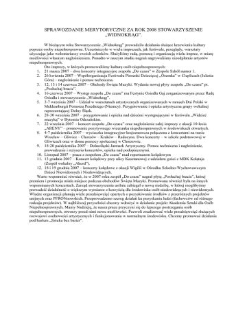 SPRAWOZDANIE MERYTORYCZNE ZA ROK 2008 STOWARZYSZENIE „WIDNOKRĄG”. W bieżącym roku Stowarzyszenie „Widnokrąg” prowadziło działania służące krzewieniu kultury poprzez osoby niepełnosprawne. Uczestniczyło w wielu imprezach, jak festiwale, przeglądy, warsztaty użyczając jako wolontariuszy swoich członków. Służyliśmy radą, pomocą i organizacją wielu imprez, w miarę możliwości własnym nagłośnieniem. Ponadto w naszym studiu nagrań nagrywaliśmy nieodpłatnie artystów niepełnosprawnych. Oto imprezy, w których promowaliśmy kulturę osób niepełnosprawnych: 1. 21 marca 2007 – dwa koncerty integracyjne zespołu „Do czasu” w Zespole Szkół numer 1. 2. 26 kwietnia 2007 – Współorganizacja Festiwalu Piosenki Dziecięcej „Ósemka” w Cieplicach (Jelenia Góra) – nagłośnienie i pomoc techniczna. 3. 12, 13 i 14 czerwca 2007 – Obchody Święta Muzyki. Wydanie nowej płyty zespołu „Do czasu” pt. „Posłuchaj bracie”. 4. 16 czerwca 2007 – Występ zespołu „Do czasu” ma Festynie Osiedla Gaj zorganizowanym przez Radę Osiedla i stowarzyszenie „Widnokrąg”. 5. 3-7 września 2007 – Udział w warsztatach artystycznych organizowanych w ramach Dni Polski w Meklemburgii Pomorza Przedniego (Niemcy). Przygotowanie i opieka artystyczna grupy wokalnej reprezentującej Dolny Śląsk. 6. 28-30 września 2007 – przygotowanie i opieka nad dziećmi występującymi w festiwalu „Widzieć muzyką” w Bytomiu Odrzańskim. 7. 22 września 2007 - koncert zespołu „Do czasu” oraz nagłośnienie całej imprezy z okazji 10-lecia „ARENY” – promowanie pozytywnego wizerunku niepełnosprawnych w środowiskach otwartych. 8. 4-7 października 2007 – wycieczka integracyjno-krajoznawcza połączona z koncertami na trasie Wrocław – Gliwice – Chorzów – Kraków – Radocyna. Dwa koncerty – w szkole podstawowej w Gliwicach oraz w domu pomocy społecznej w Chorzowie. 9. 18-20 października 2007 – Dolnośląski Jarmark Artystyczny. Pomoc techniczna i nagłośnienie, prowadzenie i reżyseria koncertów, opieka nad podopiecznymi. 10. Listopad 2007 – praca z zespołem „Do czasu” mad repertuarem kolędowym 11. 13 grudnia 2007 – Koncert kolędowy przy ulicy Kasztanowej z udziałem gości z MDK Kołątaja (Zespół wokalny „Akord”). 12. 18 i 19 grudnia 2007 – koncerty kolędowe z okazji Wigilii w Ośrodku Szkolno-Wychowawczym Dzieci Niewidomych i Niedowidzących. Warto wspomnieć również, że w 2007 roku zespół „Do czasu” nagrał płytę „Posłuchaj bracie”, której premiera i promocja miała miejsce podczas obchodów Święta Muzyki. Promowana również była na innych wspominanych koncertach. Zarząd stowarzyszenia usilnie zabiegał o nową siedzibę, w której moglibyśmy prowadzić działalność o większym wymiarze z korzyścią dla środowiska osób niedowidzących i niewidomych. Władze organizacji planują wiele przedsięwzięć opartych o pozyskiwanie środków z przeróżnych projektów unijnych oraz PFRONnowskich. Przeprowadzono szereg działań ku pozyskaniu ludzi (fachowców od różnego rodzaju projektów). W najbliższej przyszłości chcemy wdrożyć w działanie projekt Akademia Sztuki dla Osób Niepełnosprawnych. Mamy Nadzieję, że nasza praca przyczyni się do lepszego postrzegania osób niepełnosprawnych, otworzy przed nimi nowe możliwości. Pozwoli zrealizować wiele przedsięwzięć służących rozwojowi osobowości artystycznych i funkcjonowania w normalnym środowisku. Chcemy promować działania pod hasłem „Sztuka bez barier”.